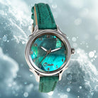 This breathtaking 30mm watch for women features a stunning large mosaic pattern of emerald tinted abalone shell designed to catch the light dramatically with every turn of your wrist. Traditional yet flashy, the iridescent depths, variations and beauty will turn heads and start conversations. The vibrant green hues, combined with the shell's natural swirls and patterns, ensure each dial is always unique and one-of-a-kind. Numbers are overlaid around the dial.