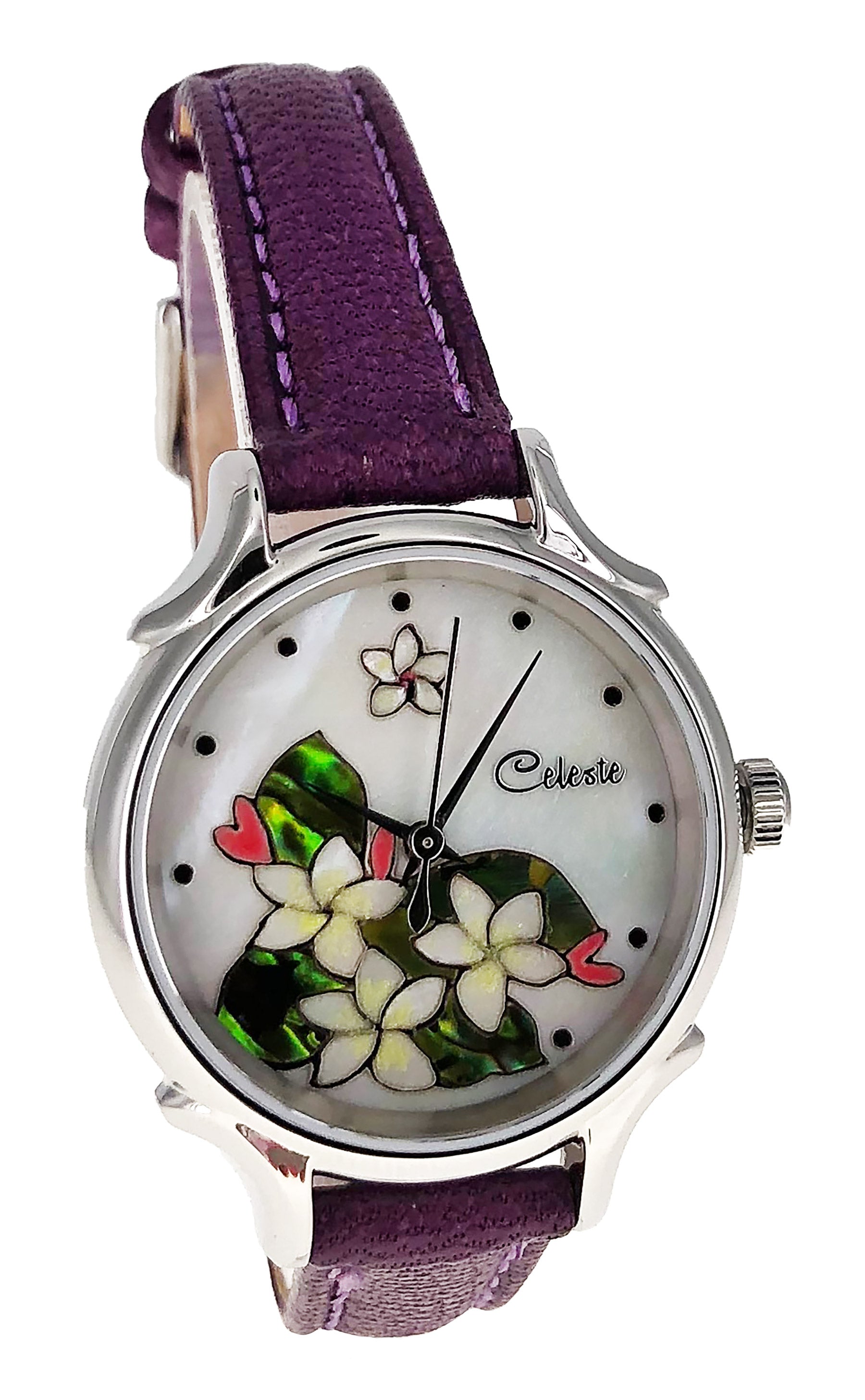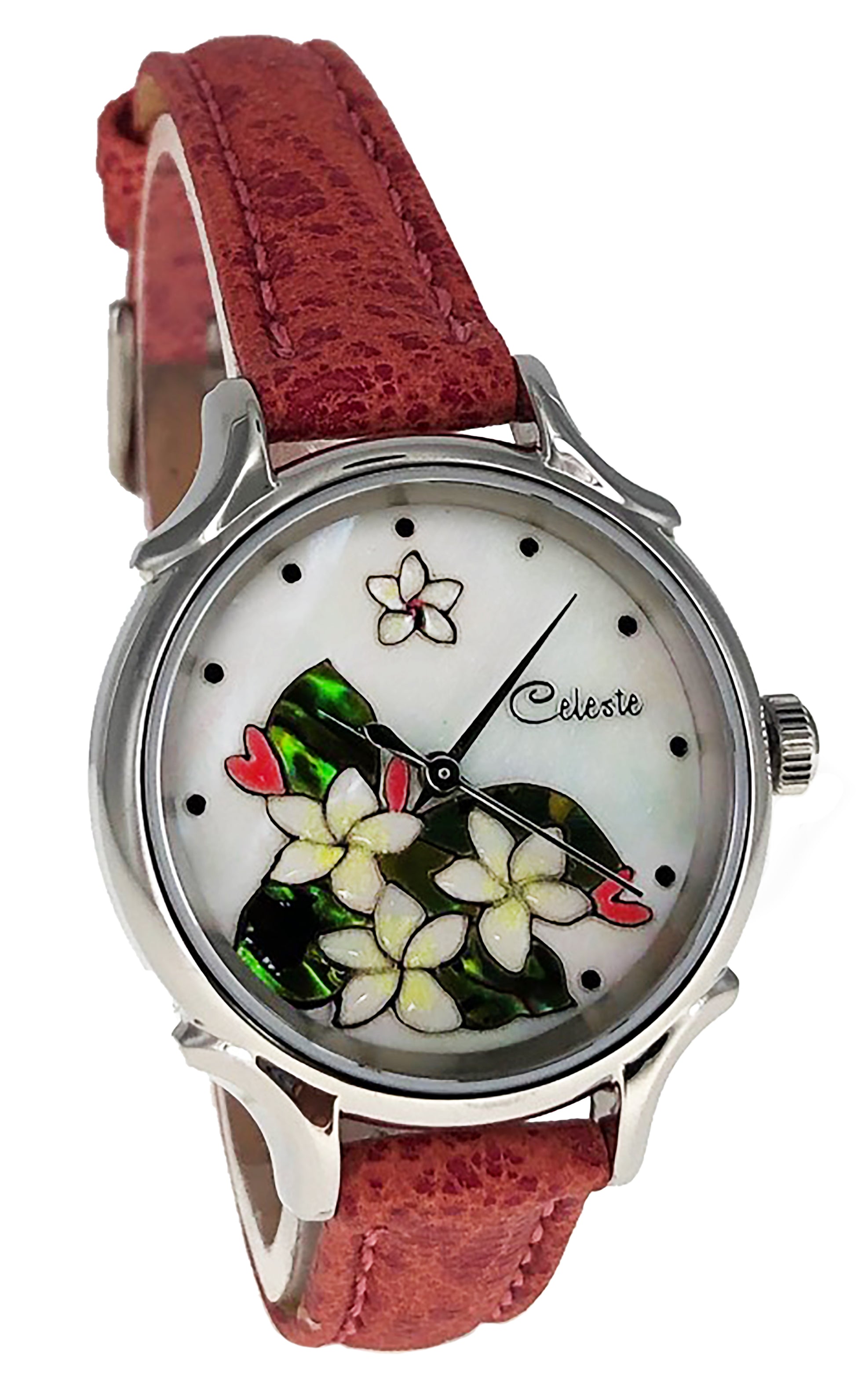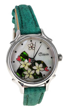 This beautiful watch is skillfully crafted from 27 pieces of Mother of Pearl and abalone shells that were carefully inlaid in the Mother of Pearl background. The leaves are olive tinted abalone, the flowers are mother of pearl with yellow mica dust and the buds are mother of pearl with fuchsia mica dust.