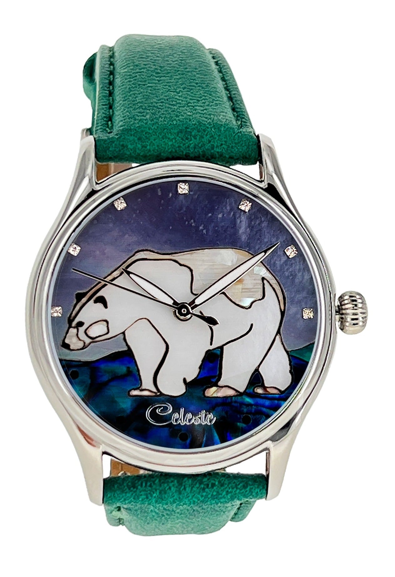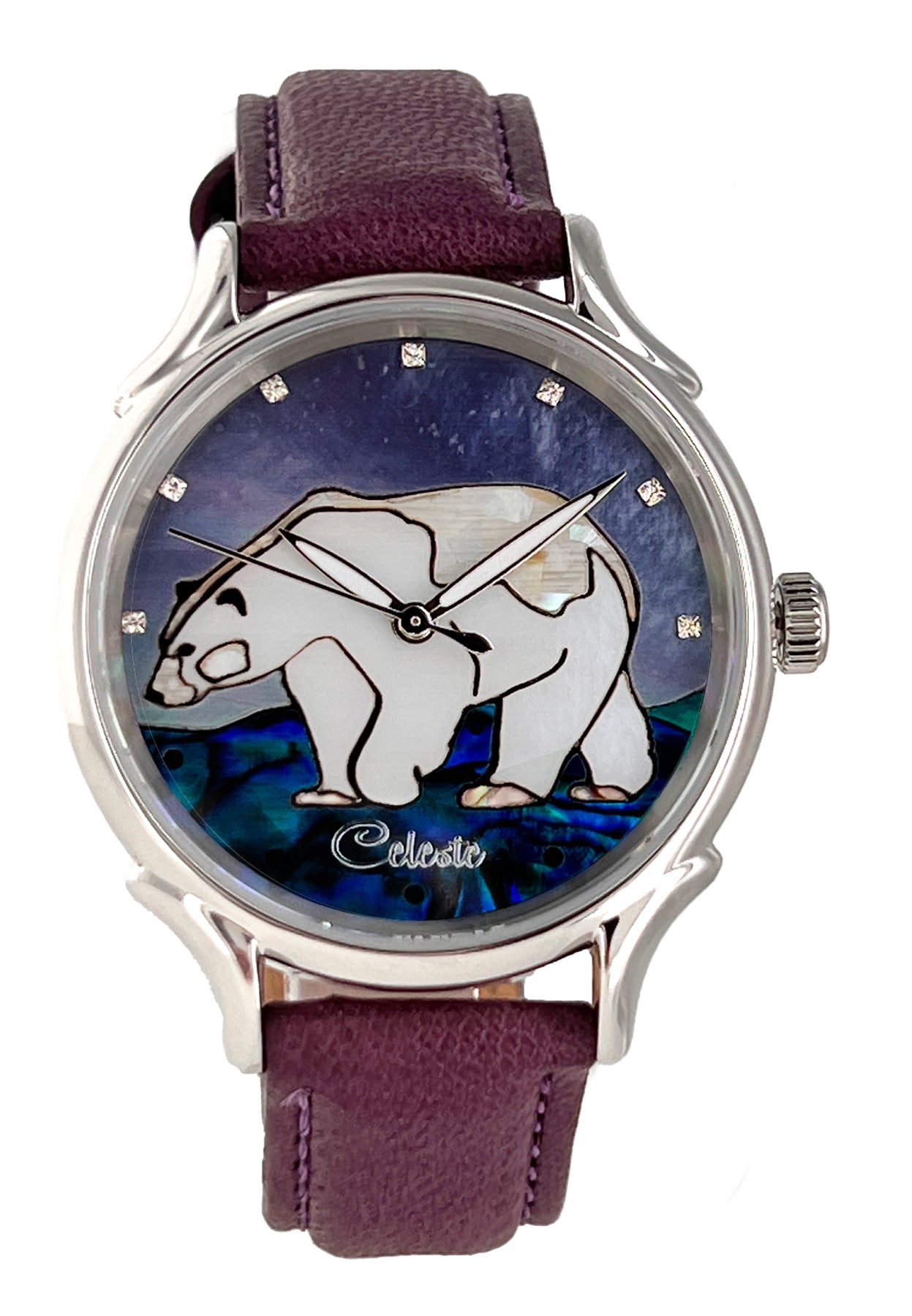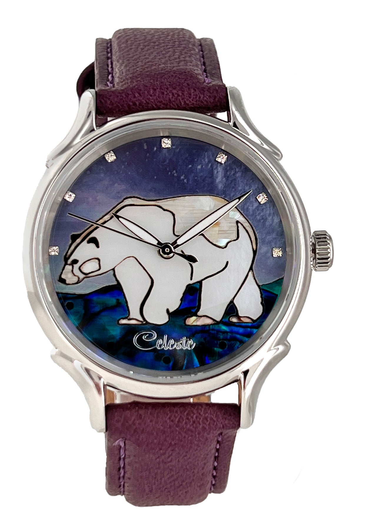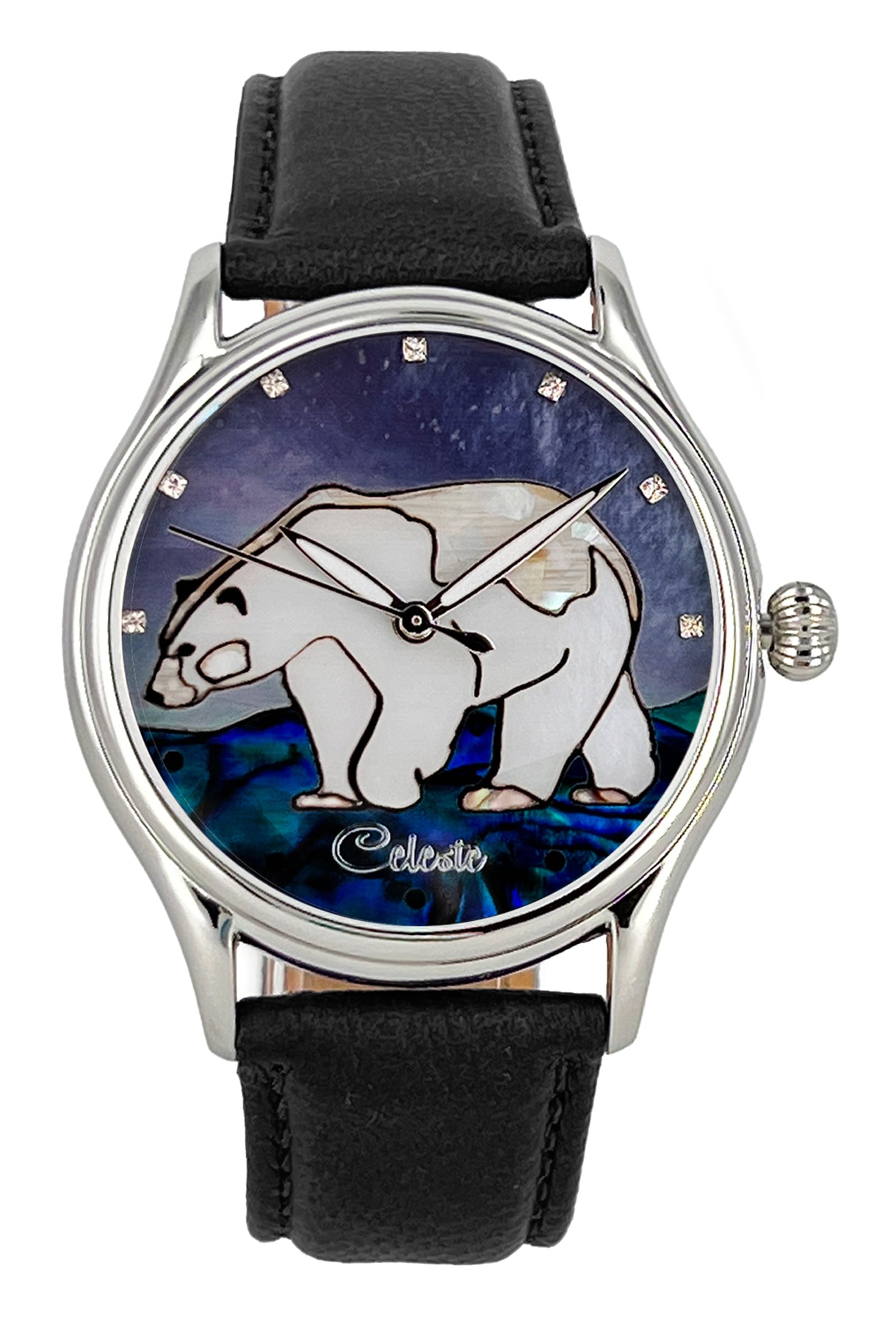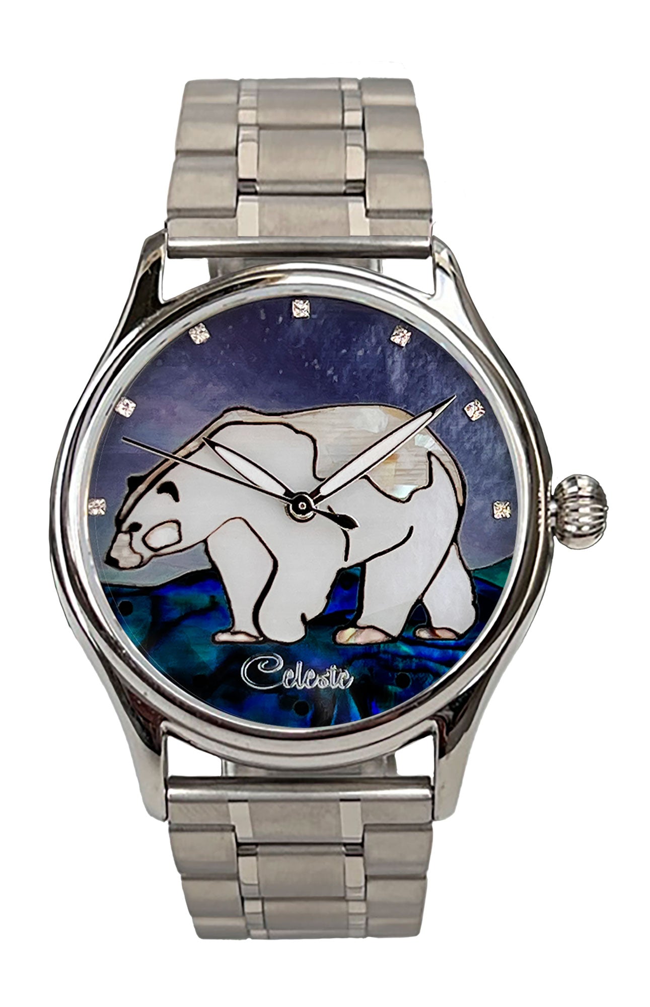 To celebrate and bring awareness to this majestic endangered species, this Arctic Wild Polar Bear watch is available in two background styles.