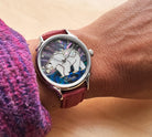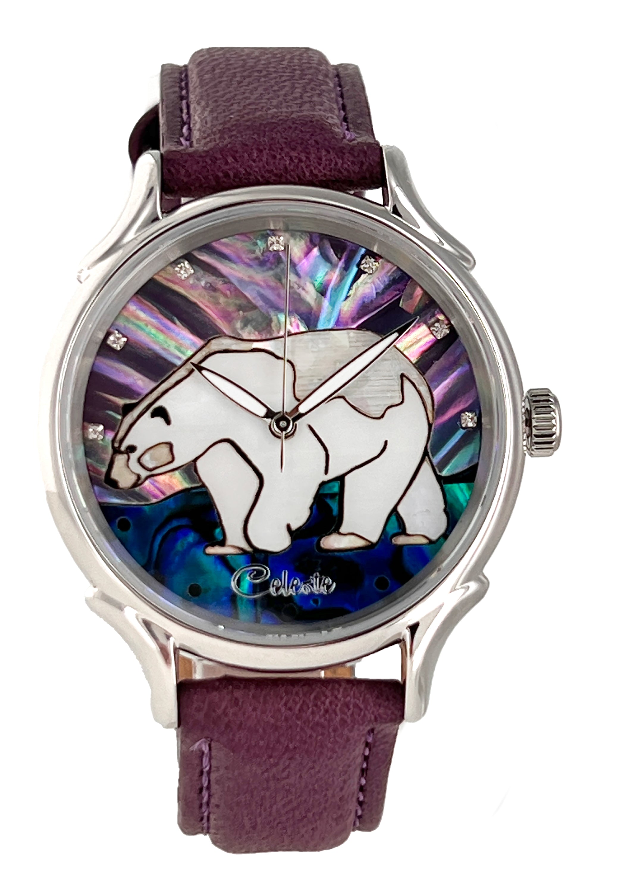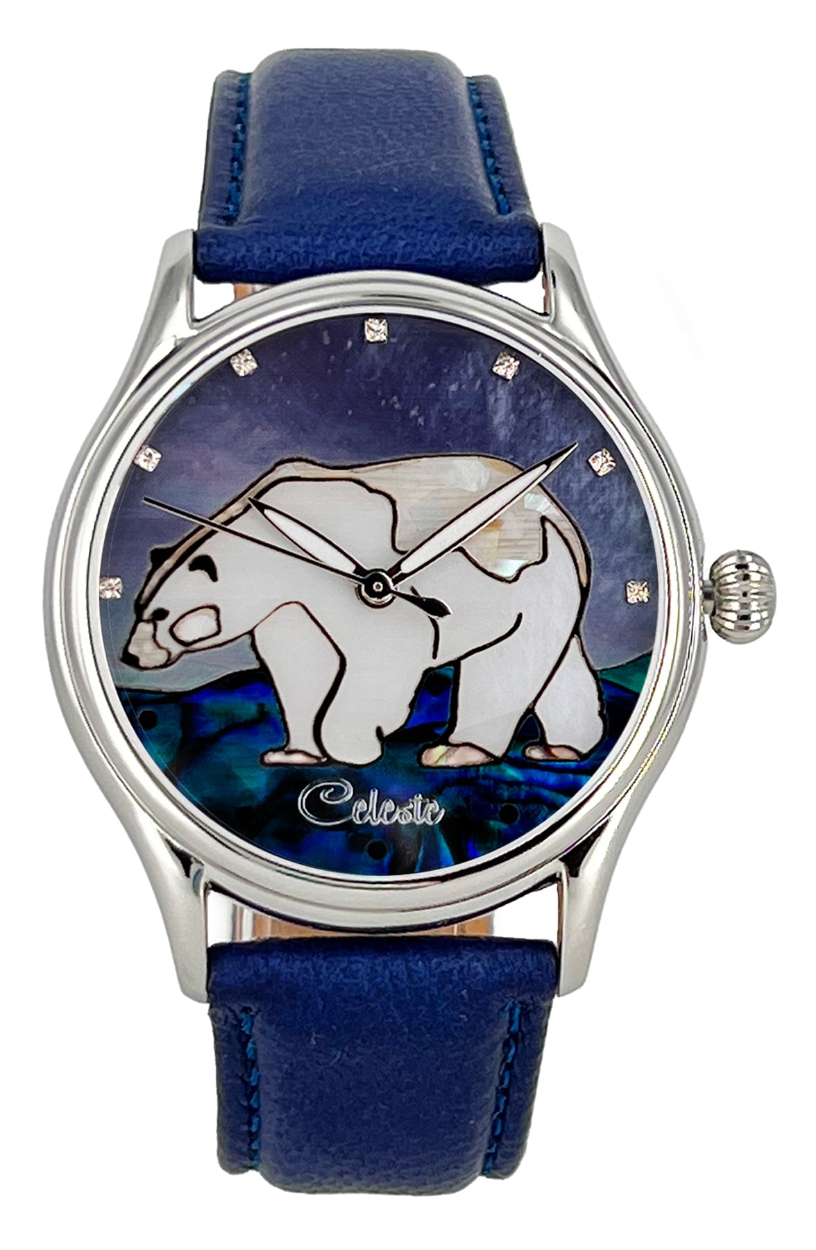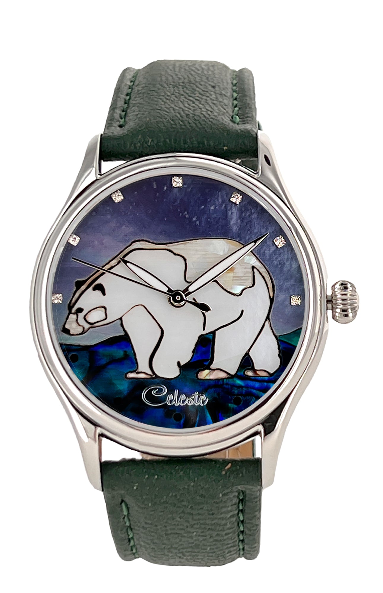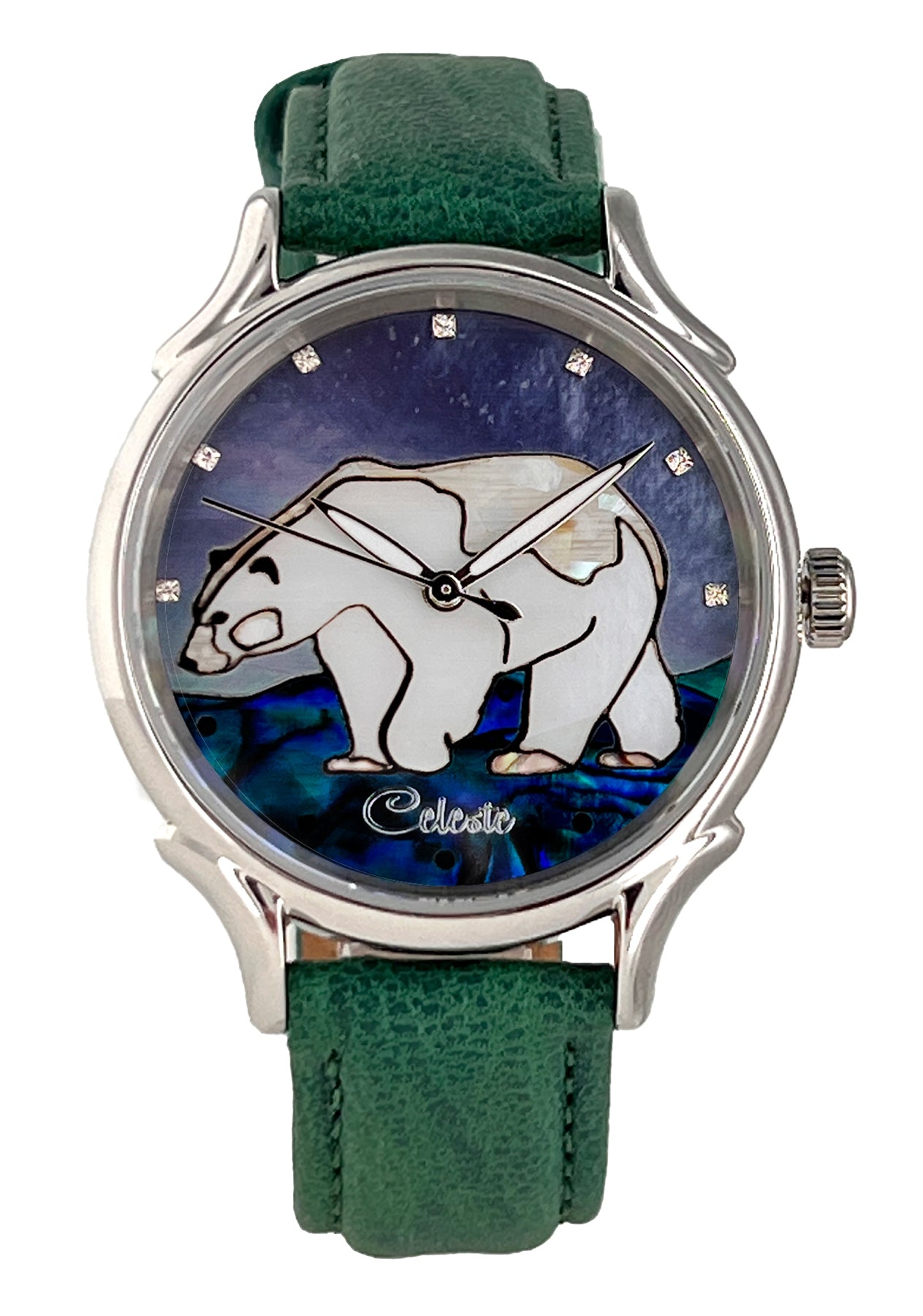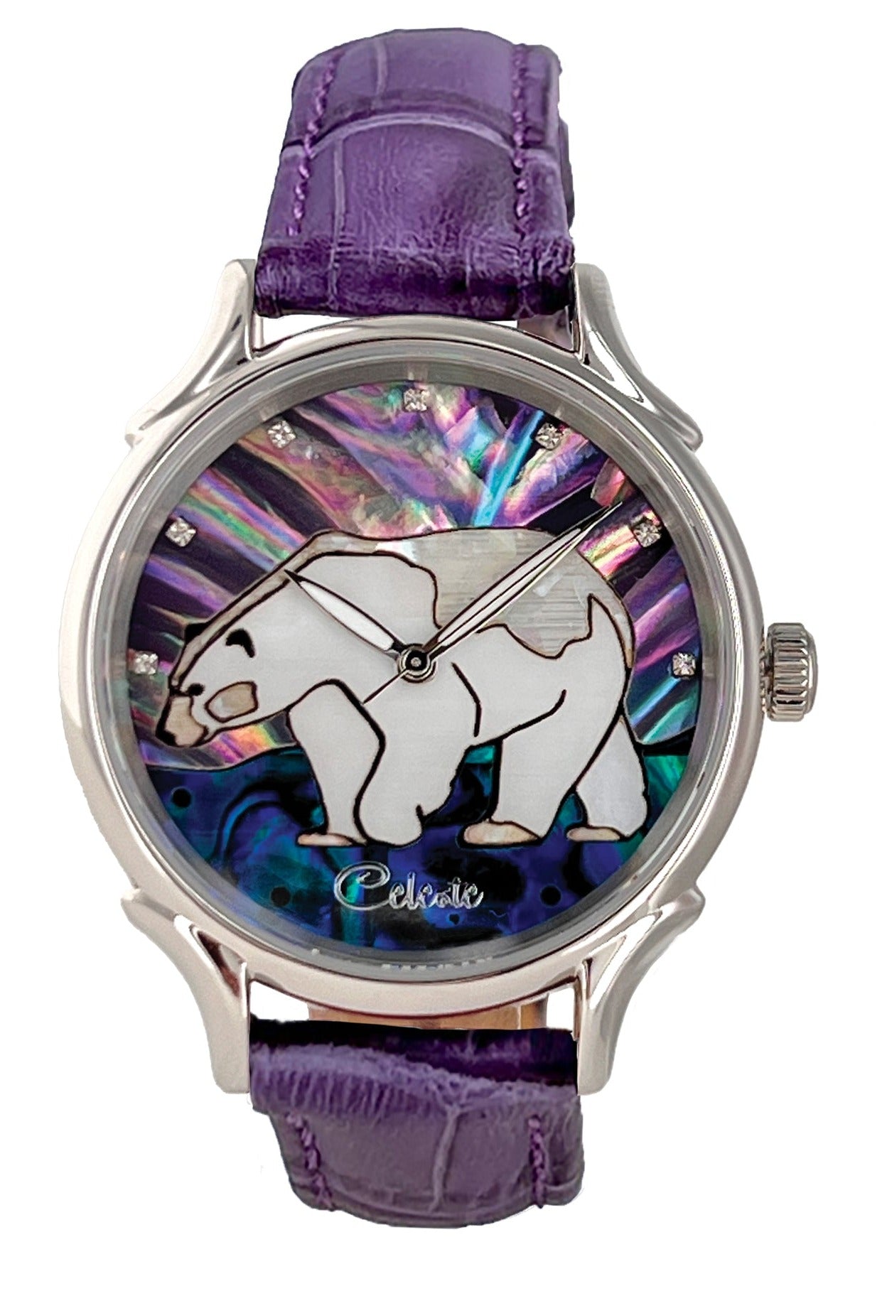 To celebrate and bring awareness to this majestic endangered species, this Arctic Wild Polar Bear watch is available in two background styles.