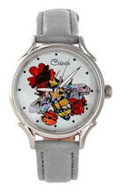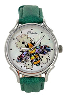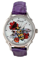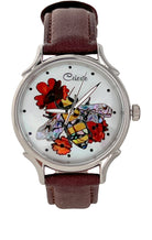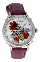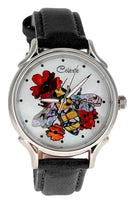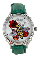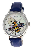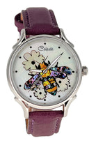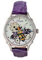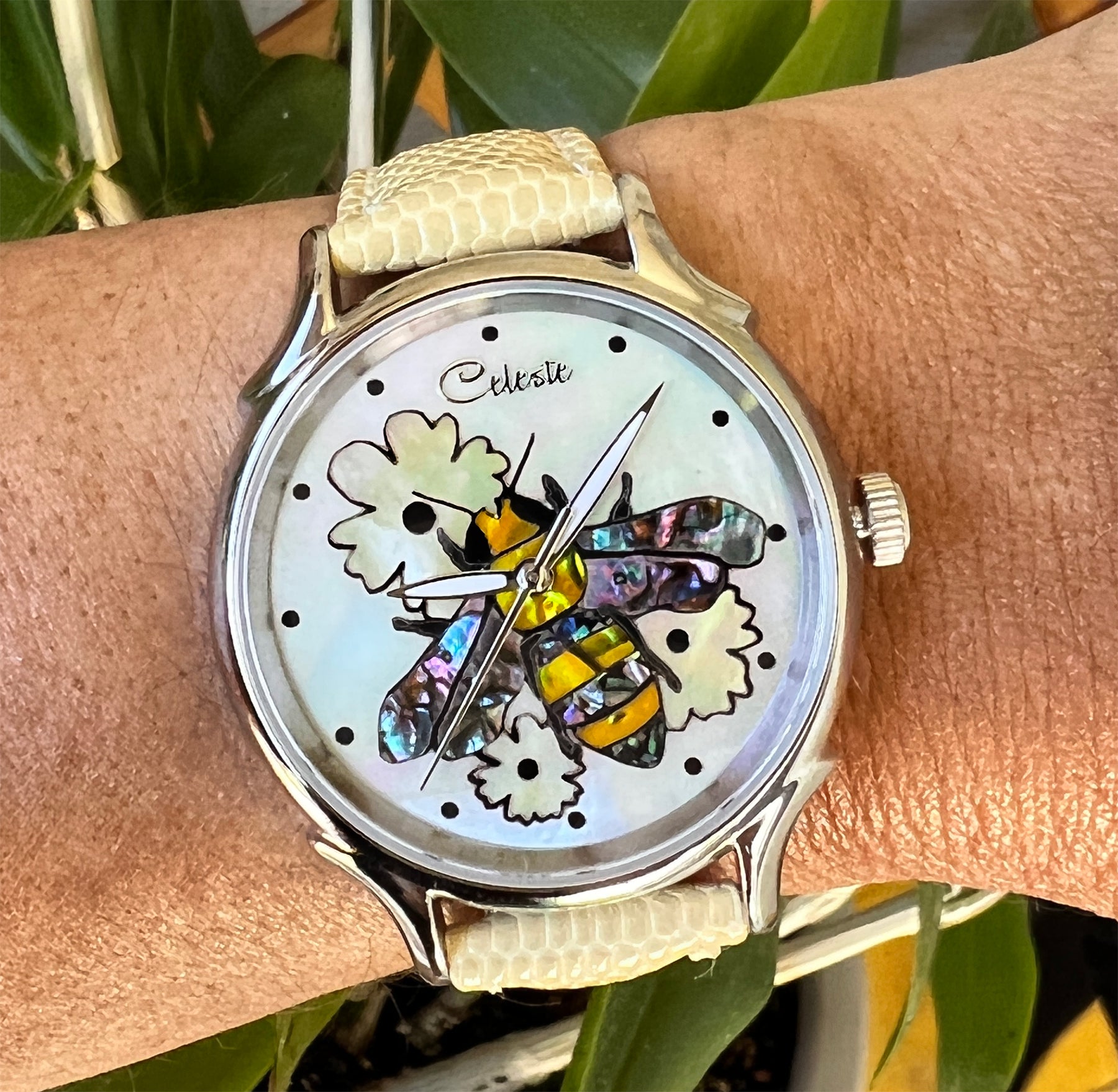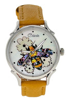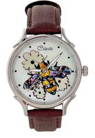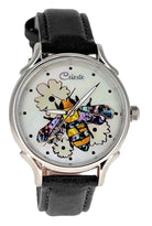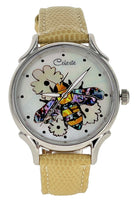Timepieces are available with vibrant orange or soft yellow flowers. This artful dial is truly the bee's knees. The bee is done in a combination of yellow and mosaic abalone shells for the body and pink heart abalone for the wings. Watches can be purchased with either Orange Paua or golden mother of pearl (soft yellow) flowers. Surrounded in Mother of Pearl, the bee is busy harvesting pollen for a fruitful year ahead.