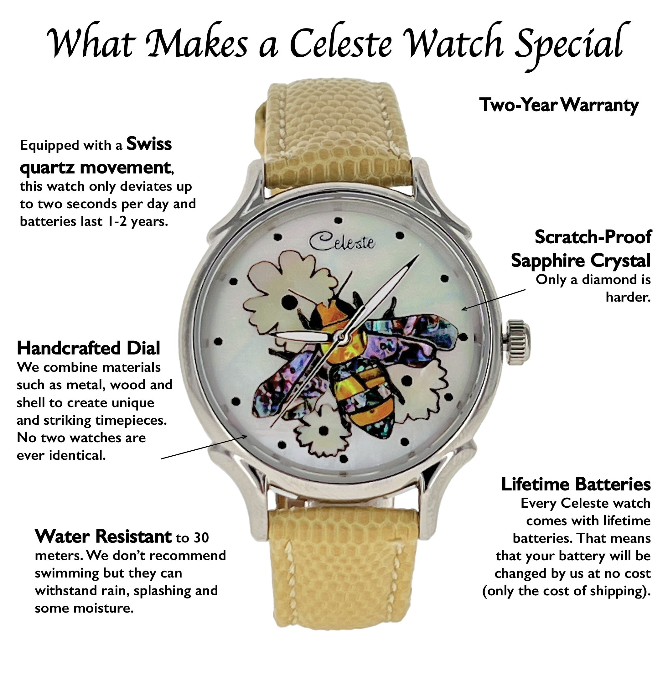 If you are unsatisfied with the performance of your watch, we'll make it right. Whether you made the purchase or received your watch as a gift, it's Celeste's guarantee that your watch will maintain its beauty and precision.