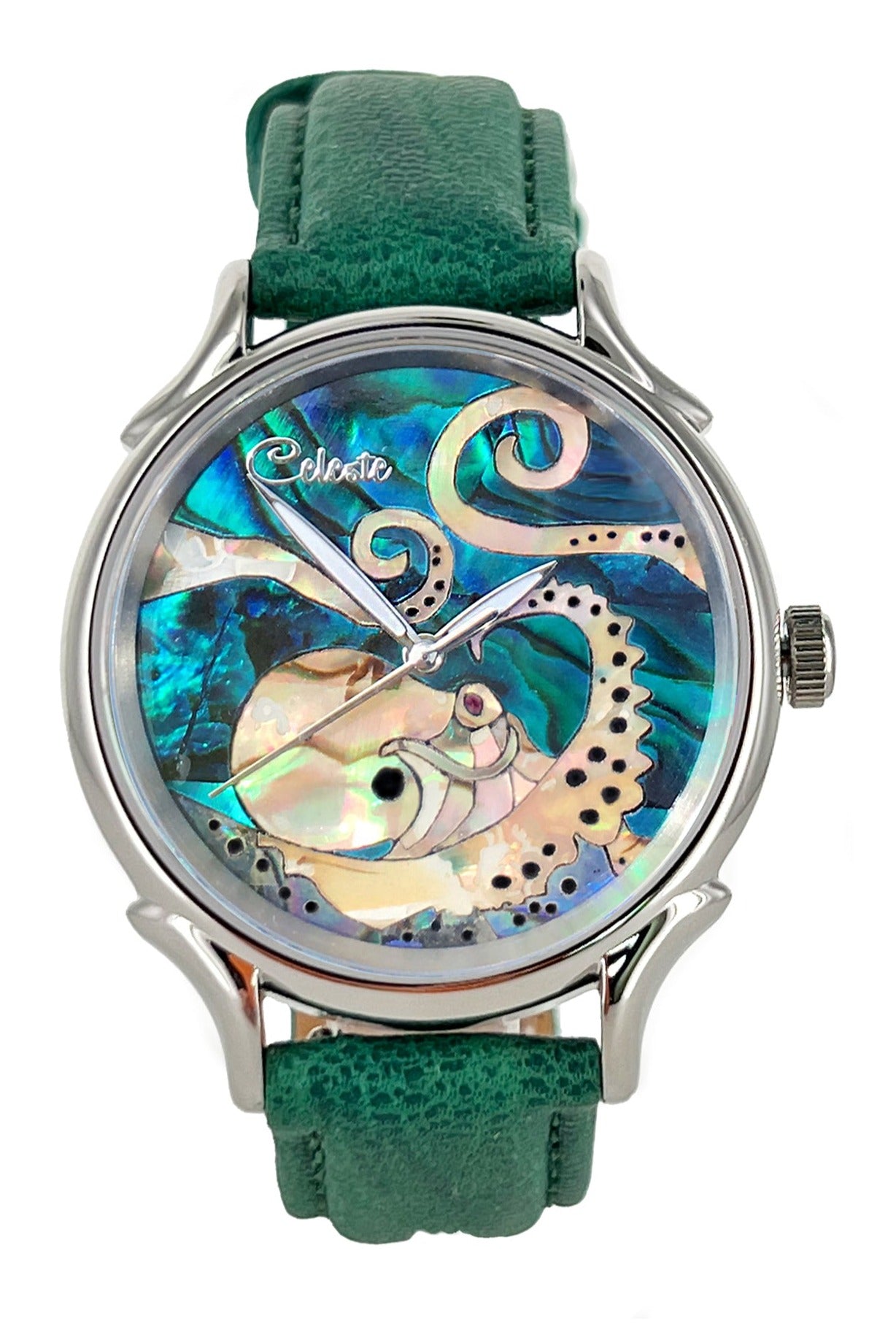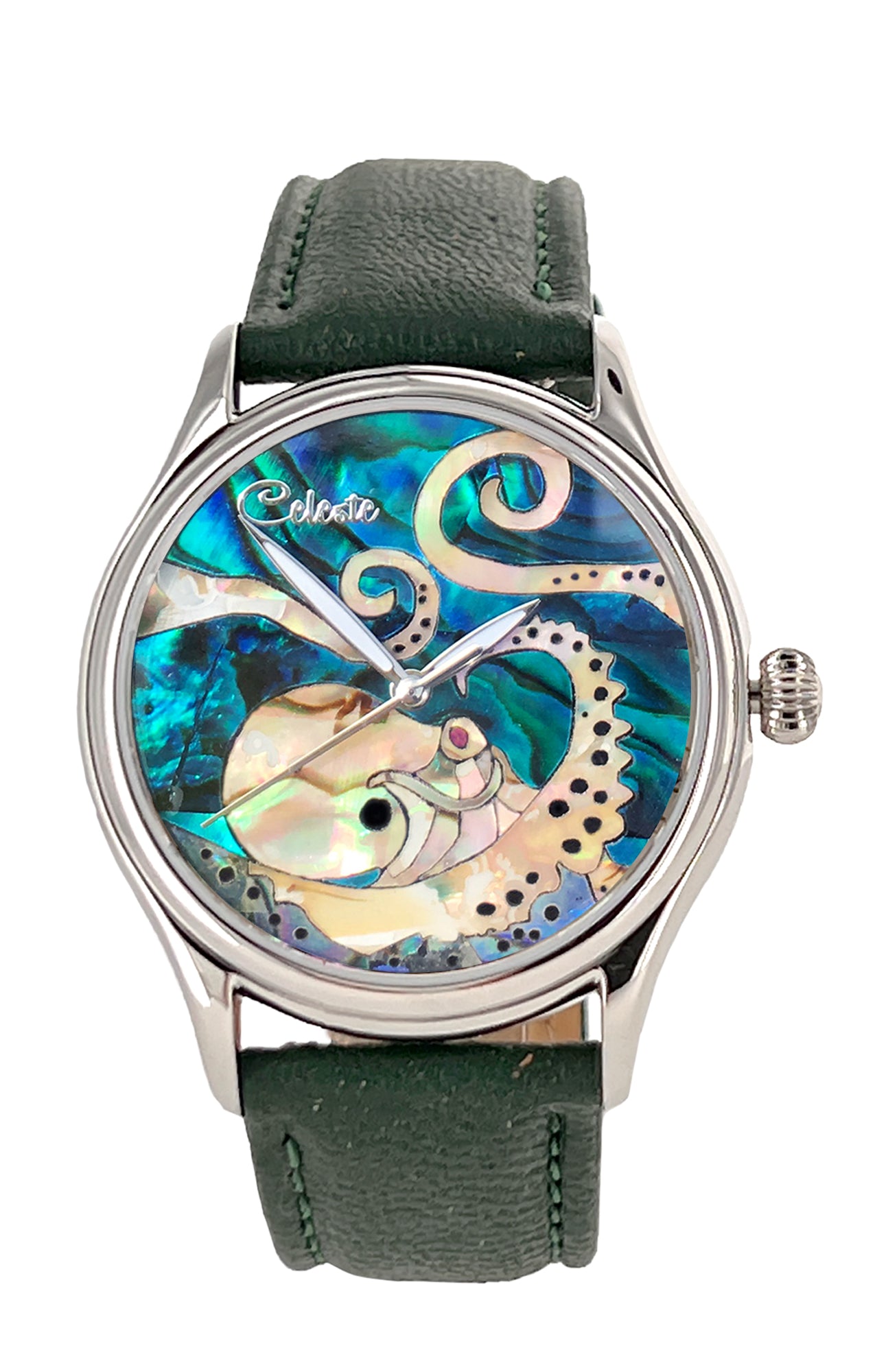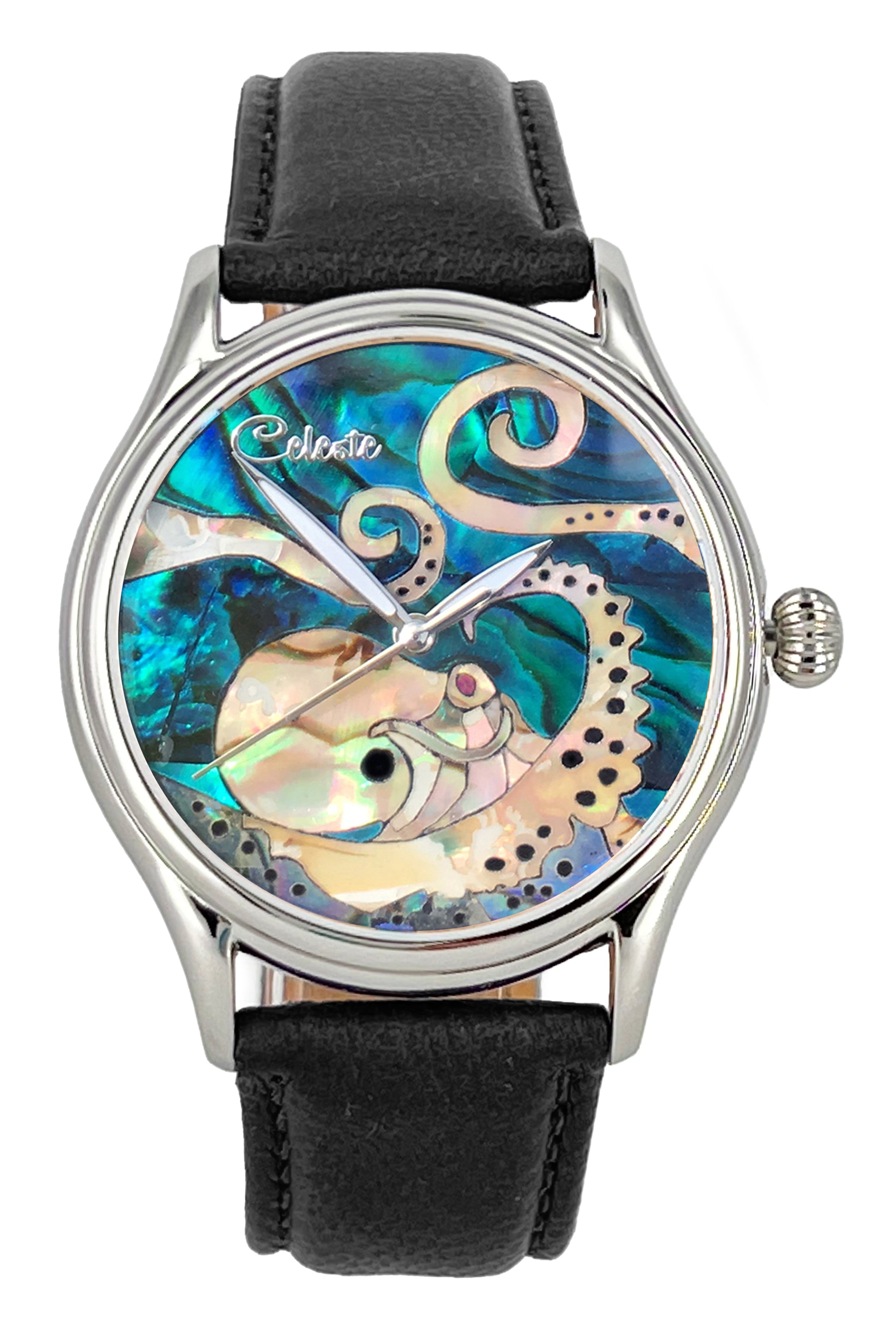 A symbol of great intelligence and many talents, this octopus watch was created with 22 pieces of blue and blonde tinted abalone.