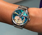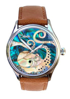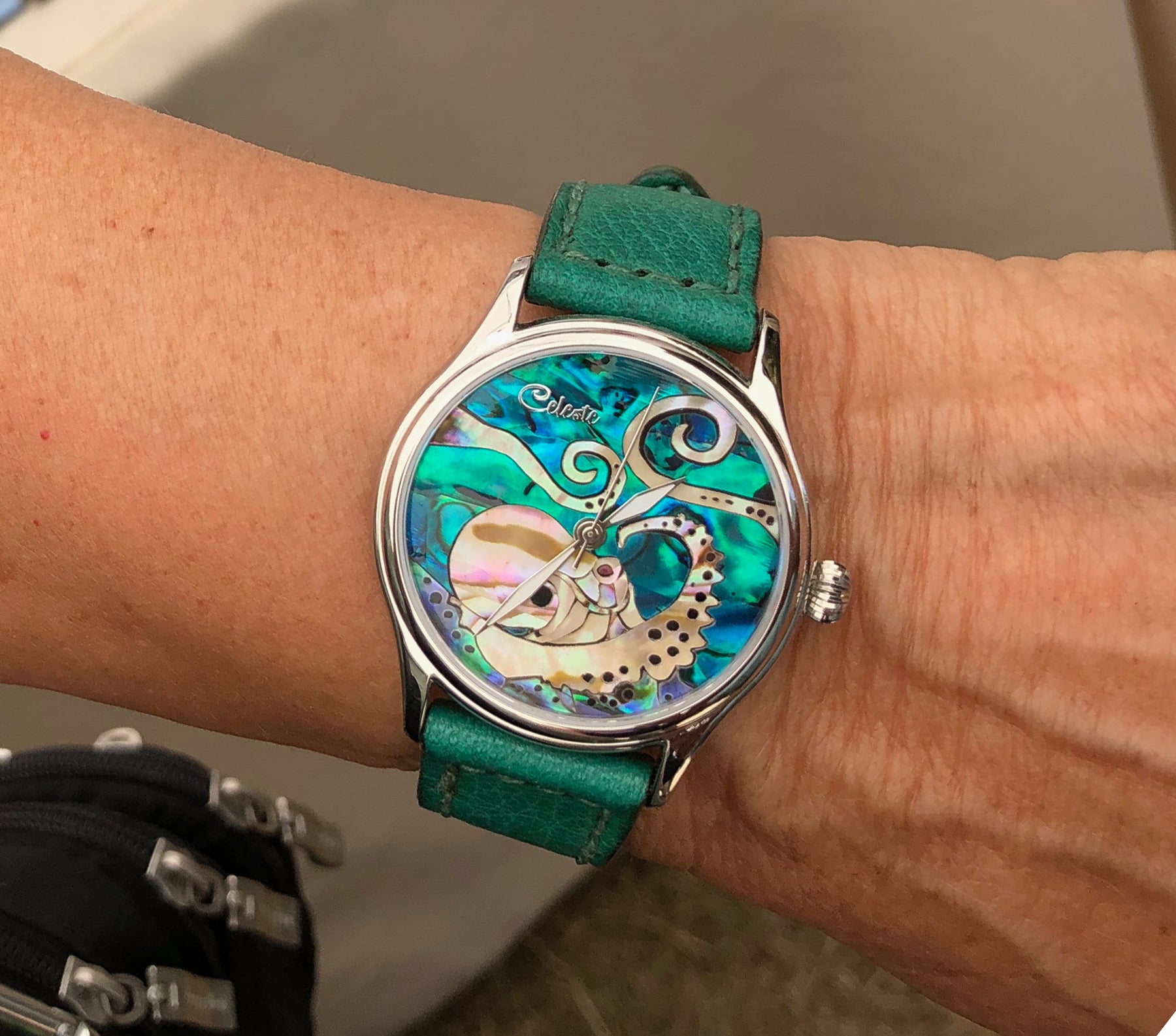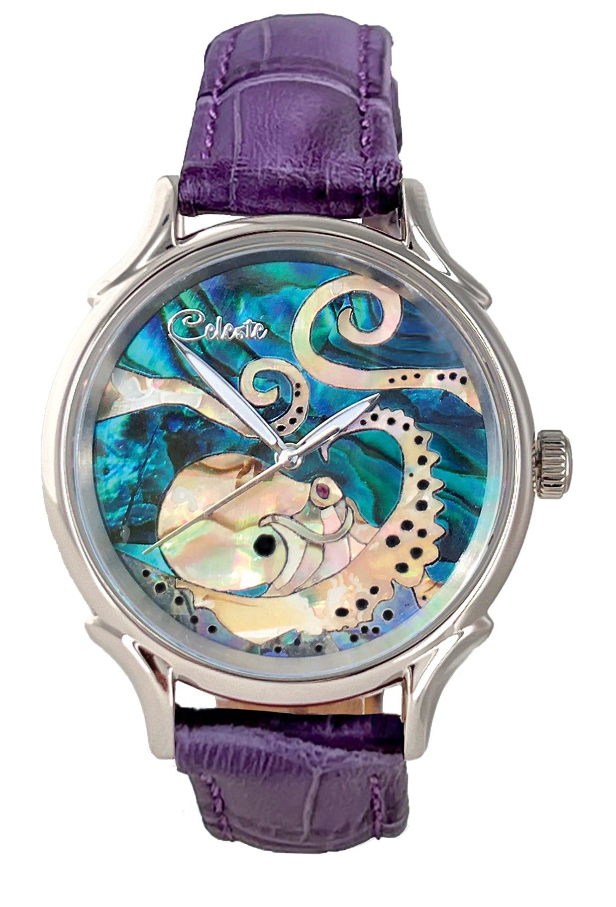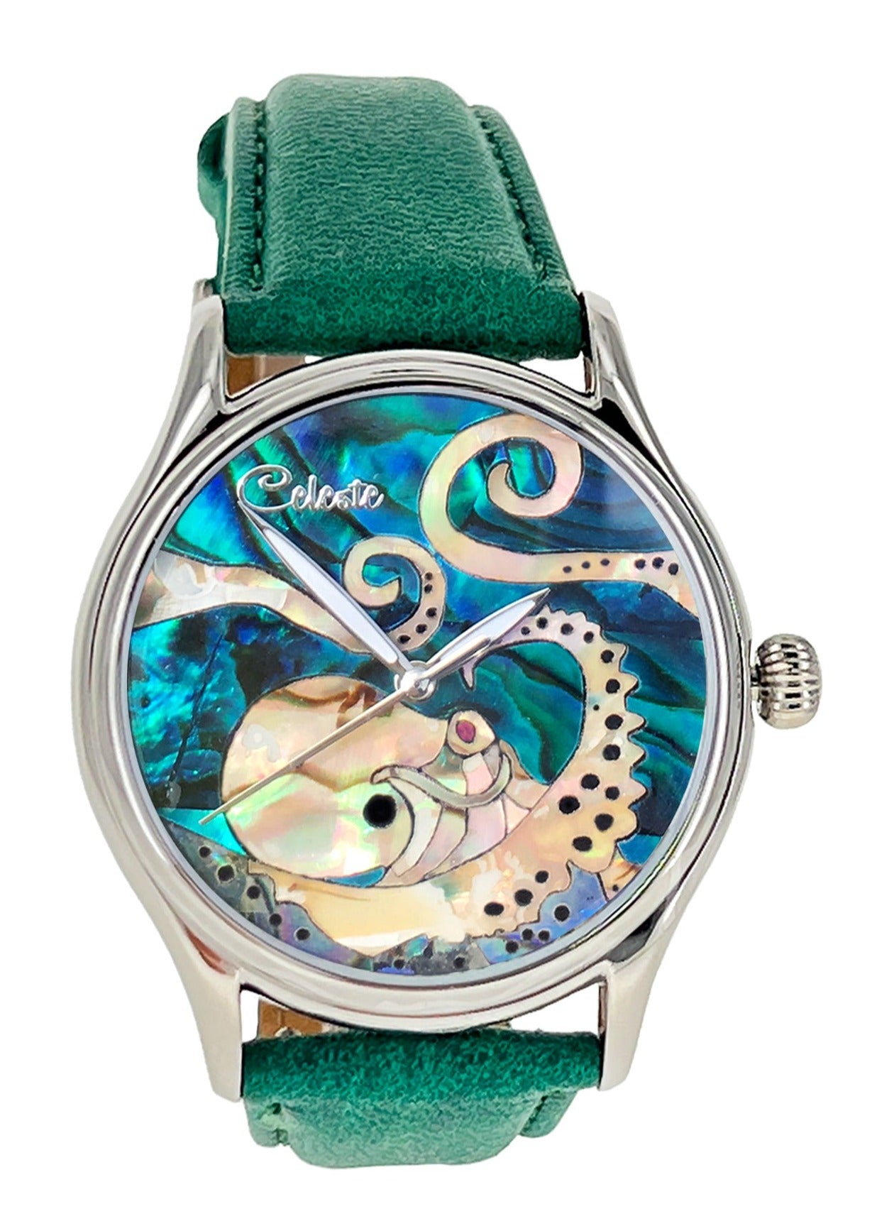 A symbol of great intelligence and many talents, this octopus watch was created with 22 pieces of blue and blonde tinted abalone.