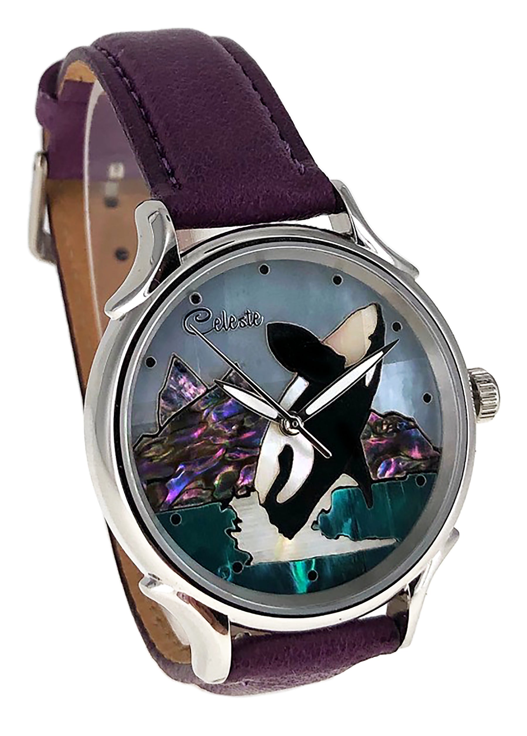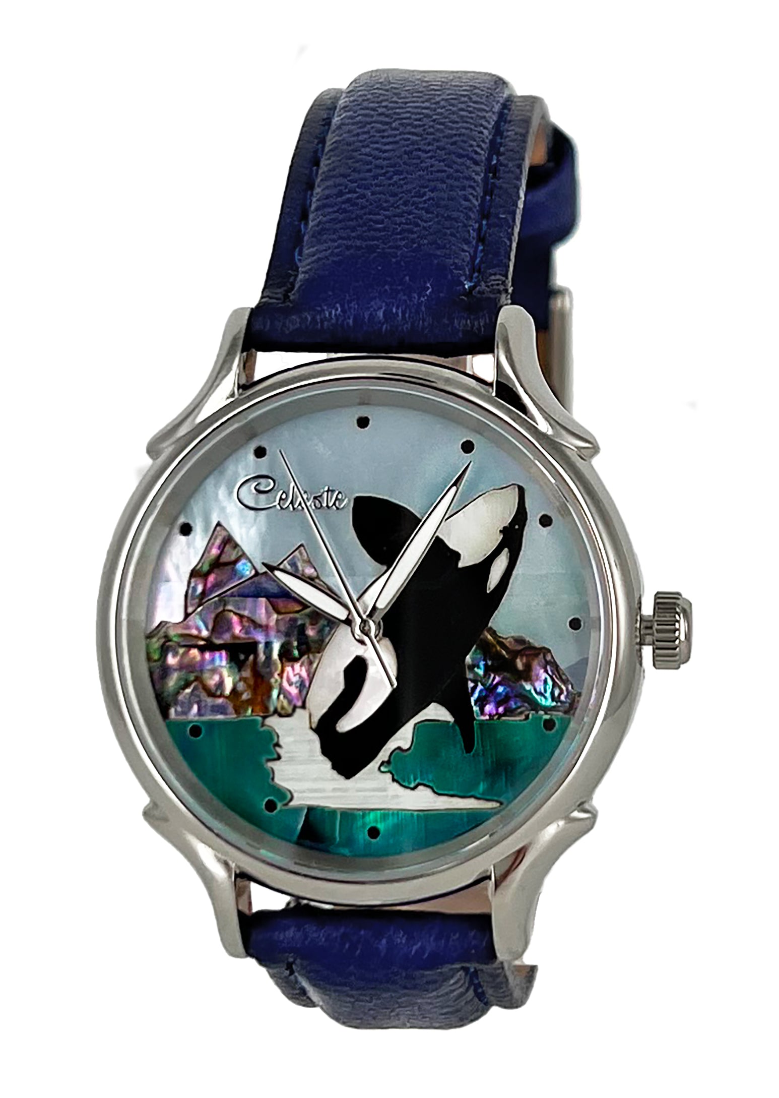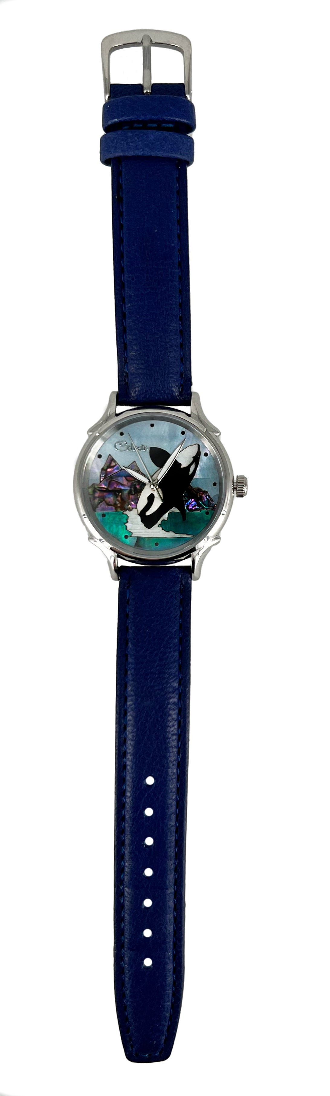 A true miniature masterpiece, this orca watch is meticulously crafted from 12 individual pieces of abalone, Mother of Pearl, and fine wood. The sky is a soft, light blue Mother of Pearl, the ocean shimmers in aqua-tinted shell, and the wave glistens with sparkle Mother of Pearl. Pink heart abalone forms the distant mountains, while the orca itself is brought to life with a striking combination of black-stained maple and luminous Mother of Pearl.