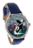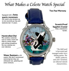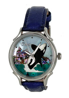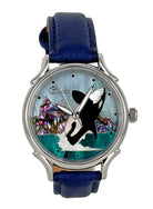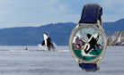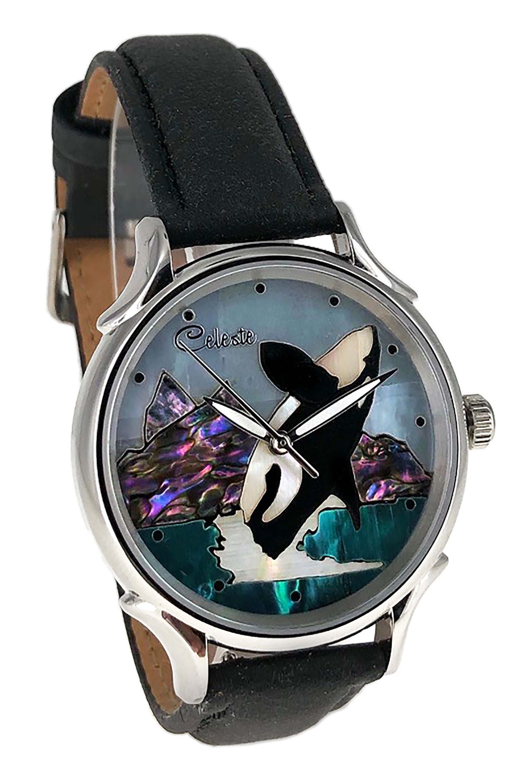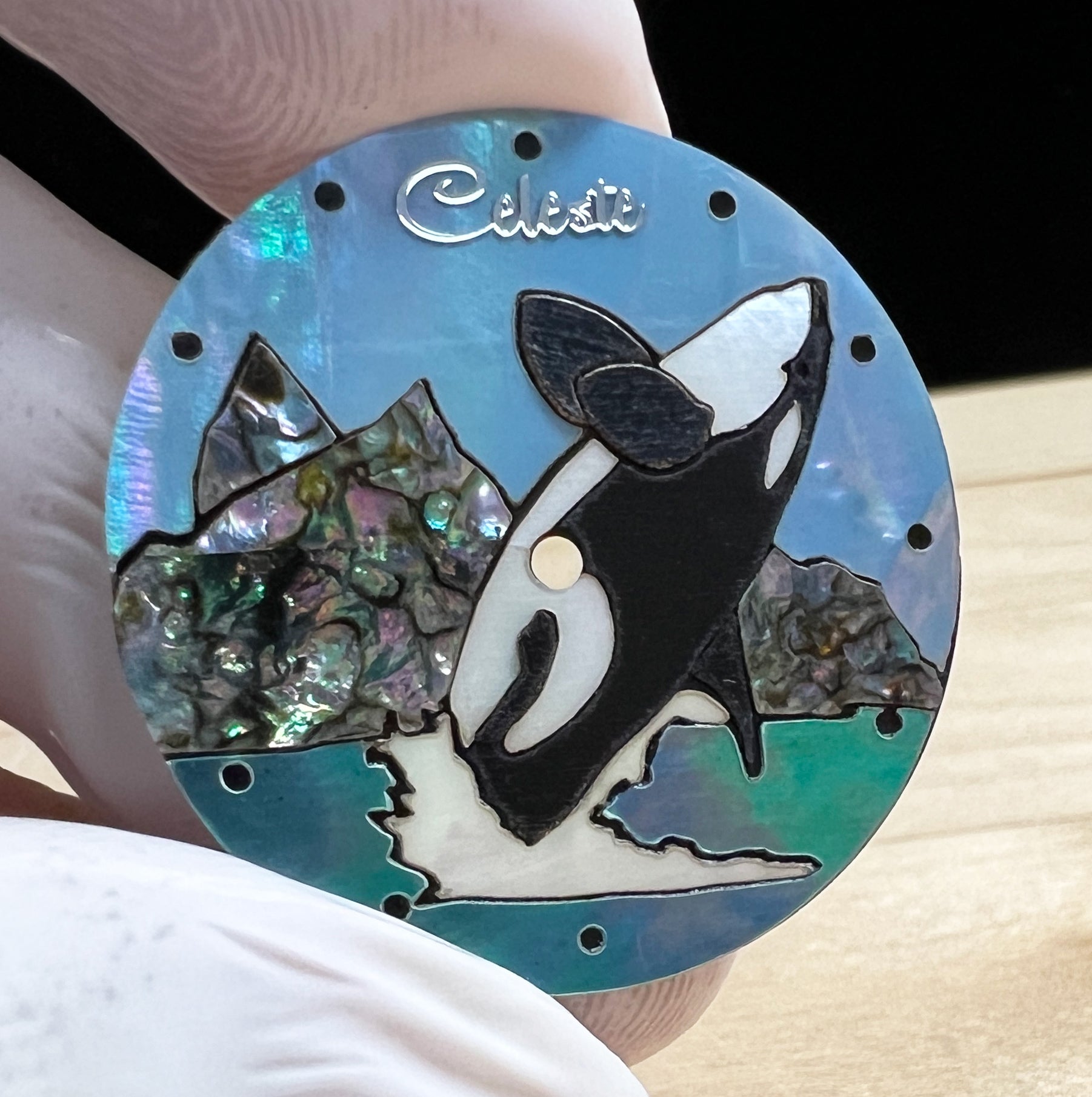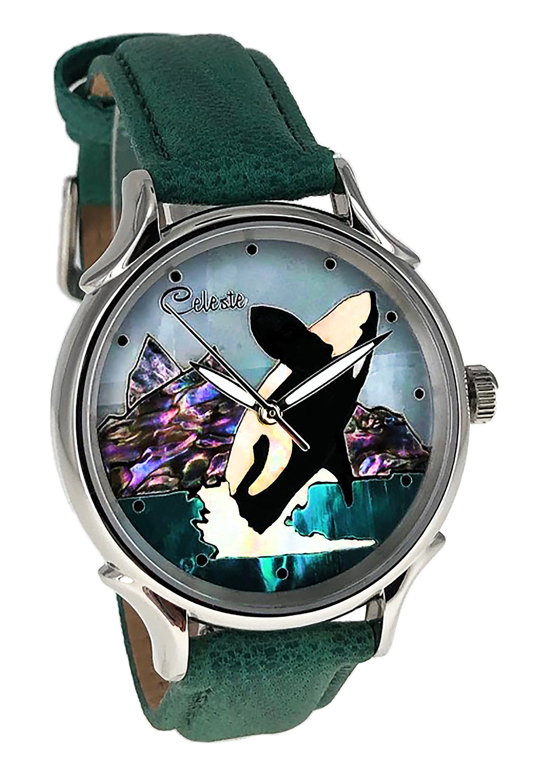 A true miniature masterpiece, this orca watch is meticulously crafted from 12 individual pieces of abalone, Mother of Pearl, and fine wood. The sky is a soft, light blue Mother of Pearl, the ocean shimmers in aqua-tinted shell, and the wave glistens with sparkle Mother of Pearl. Pink heart abalone forms the distant mountains, while the orca itself is brought to life with a striking combination of black-stained maple and luminous Mother of Pearl.