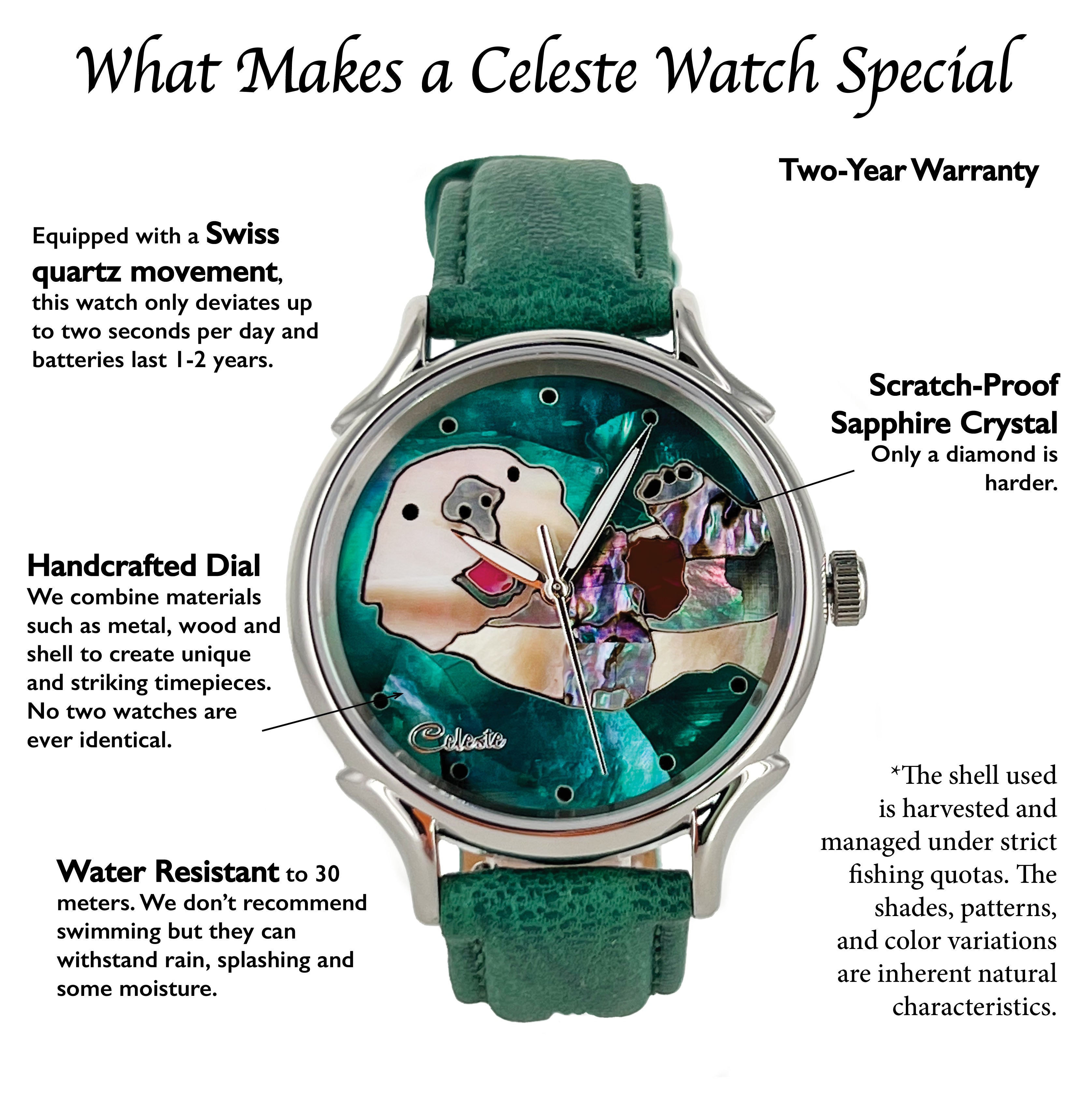 - All Celeste watches are water resistant from 100-150 feet, depending on the size.