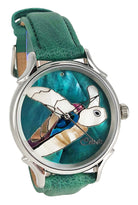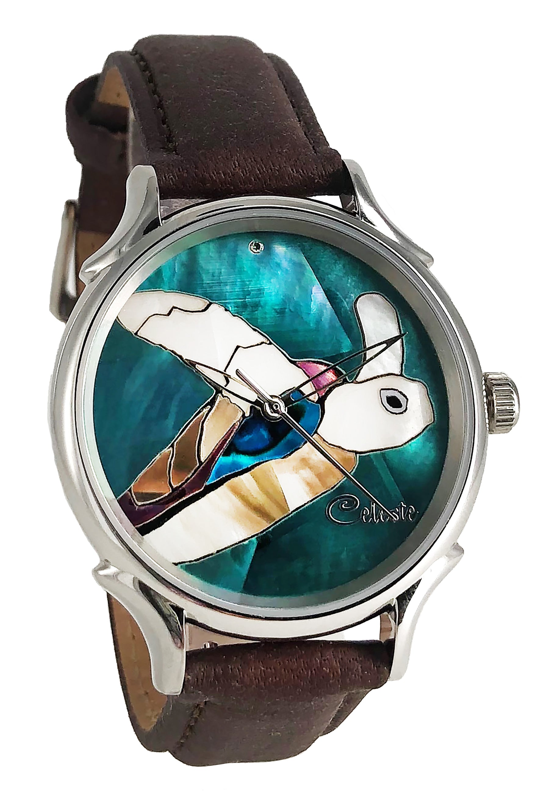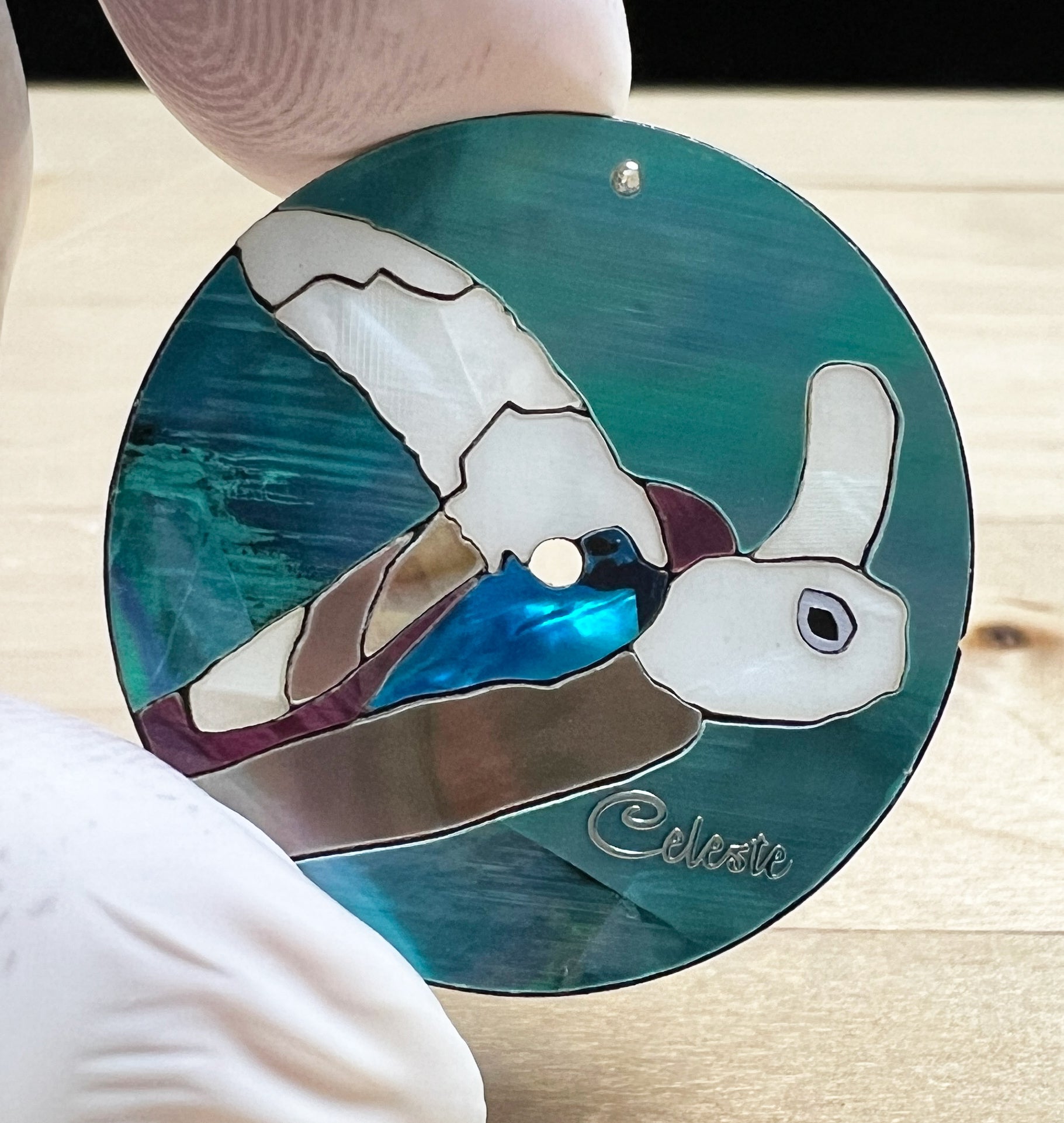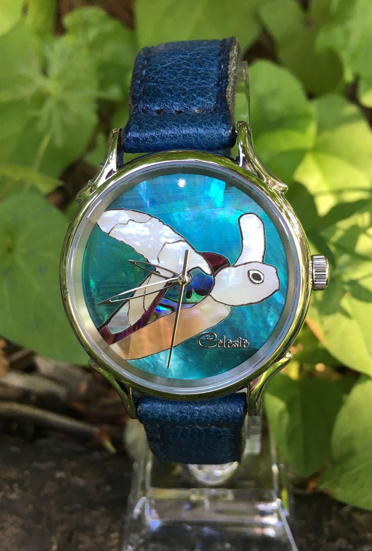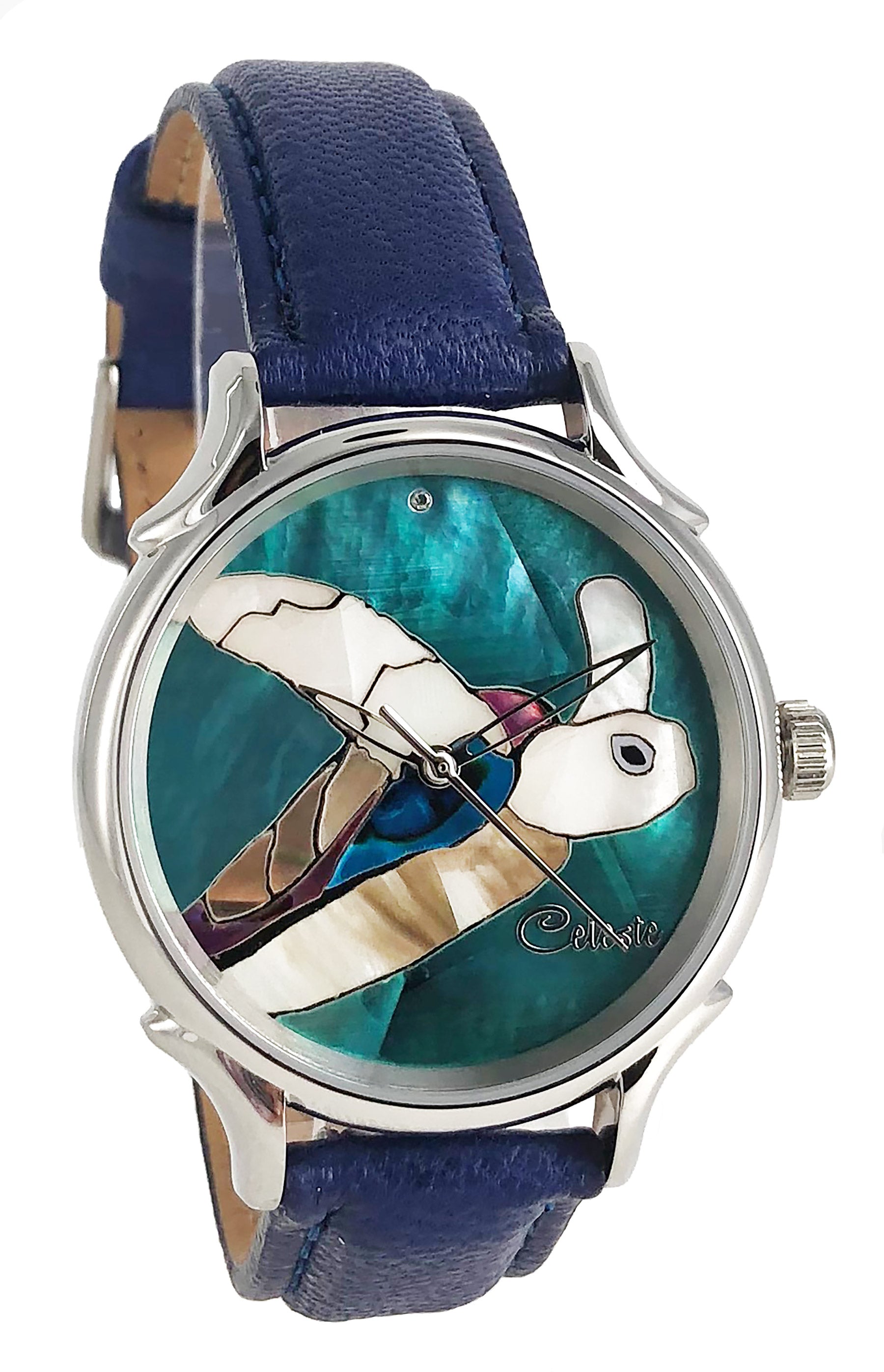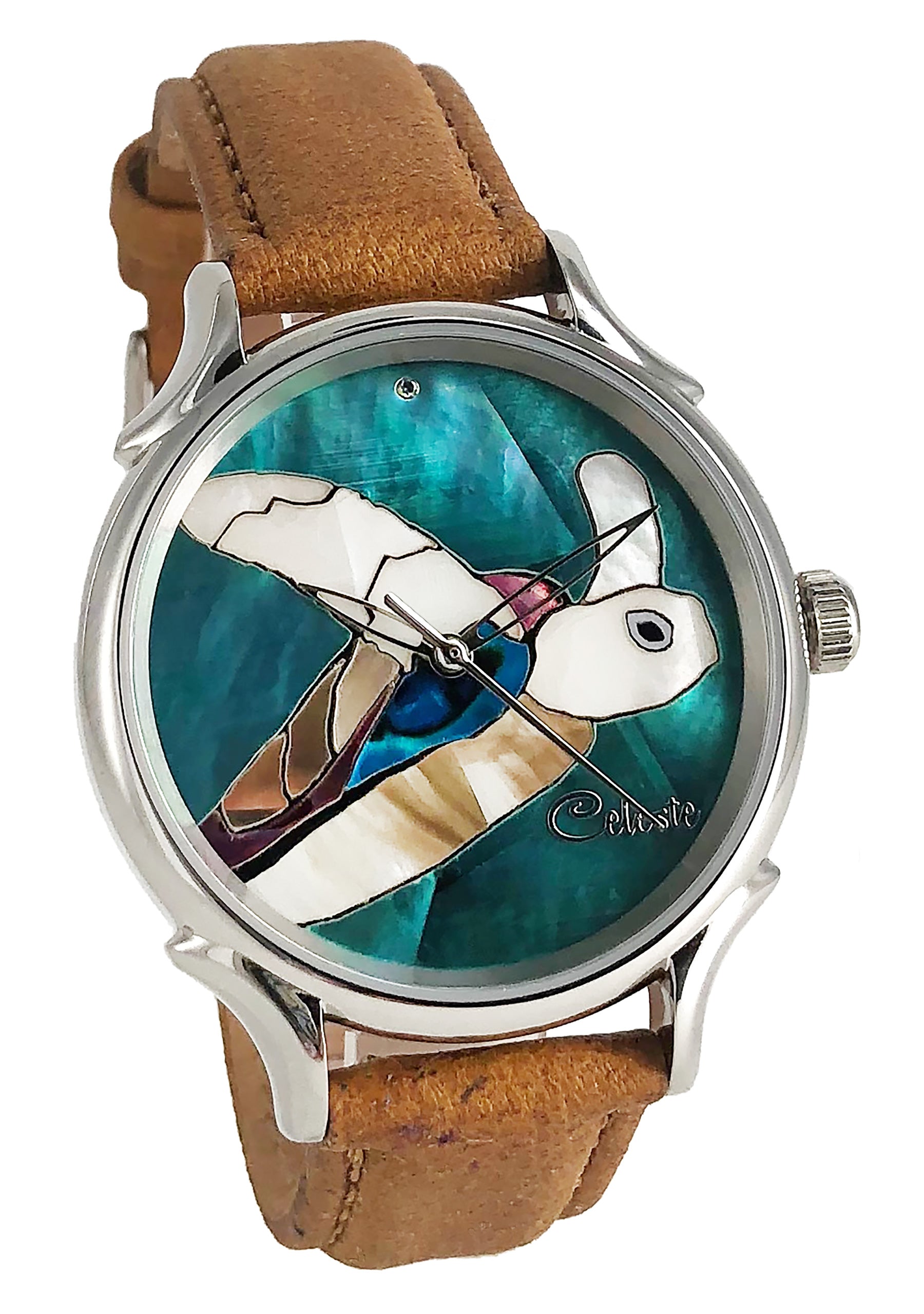 A symbol of good luck, this sea turtle is created with 16 tiny pieces of mother of pearl and abalone shell tinted five different colors. A clear CZ stone serves as a distinctive time marker at the 12.
