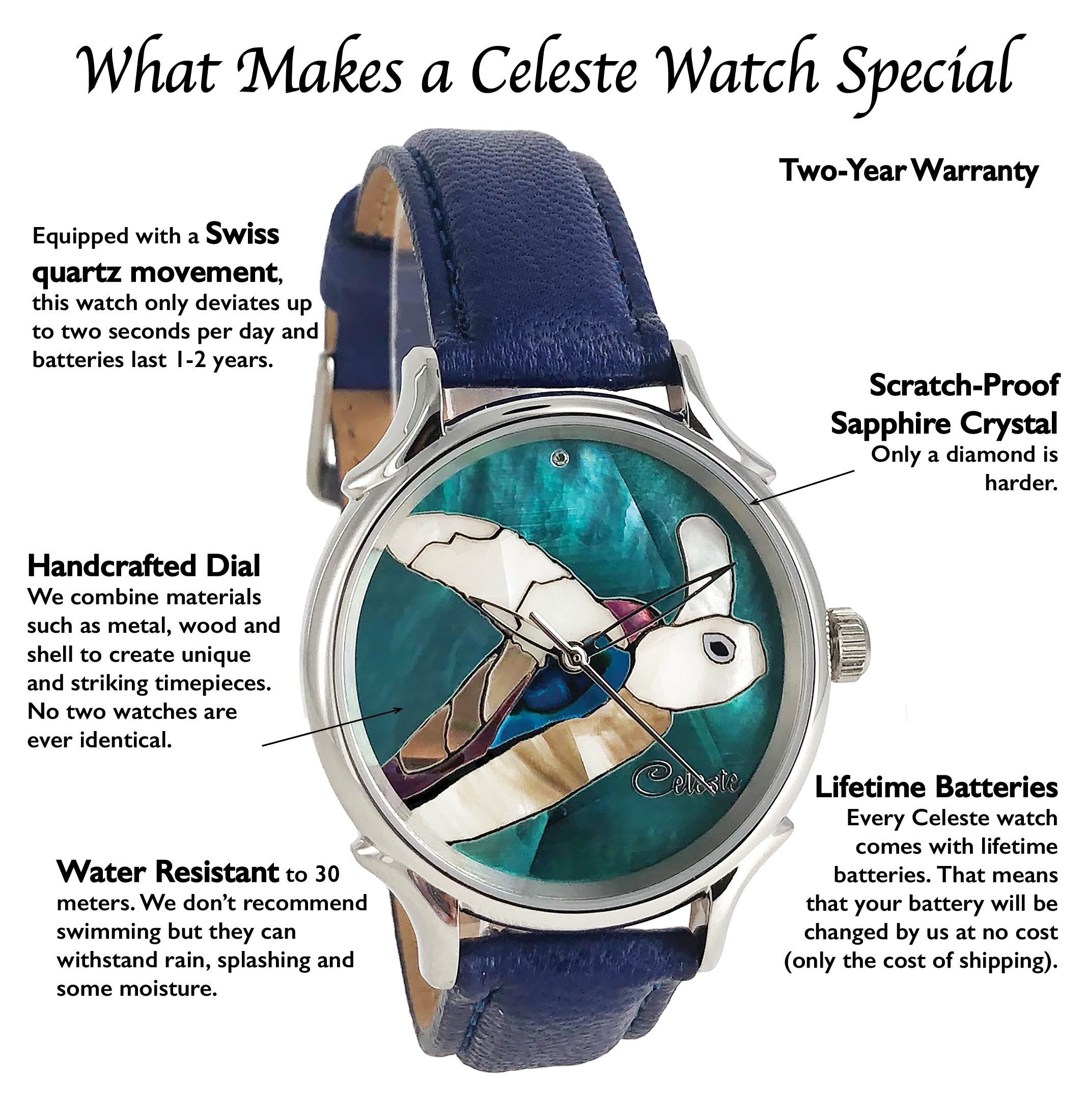 If you are unsatisfied with the performance of your watch, we'll make it right. Whether you made the purchase or received your watch as a gift, it's Celeste's guarantee that your watch will maintain its beauty and precision.
