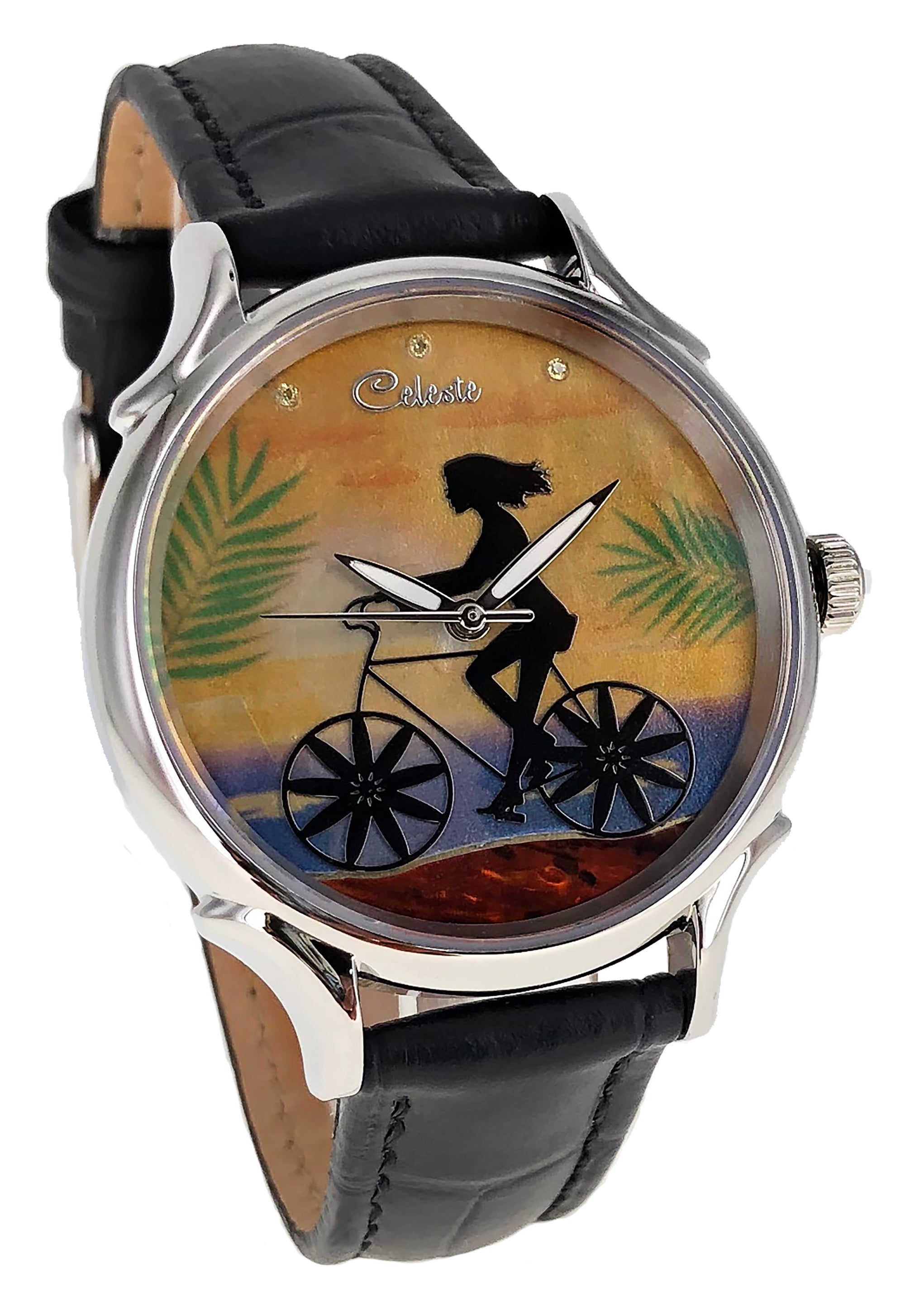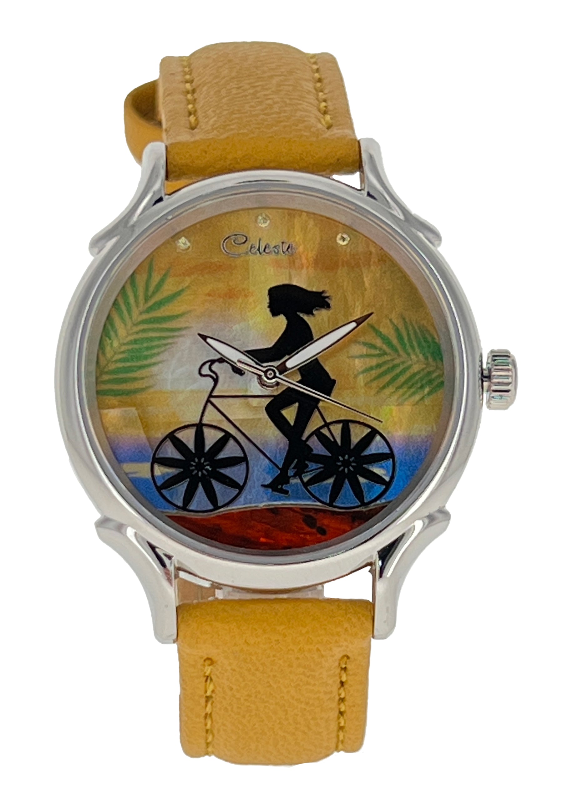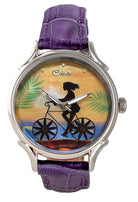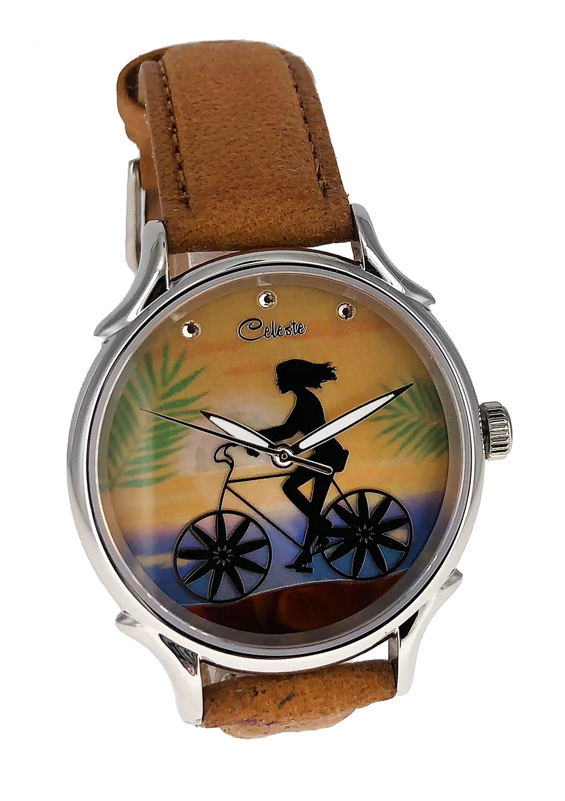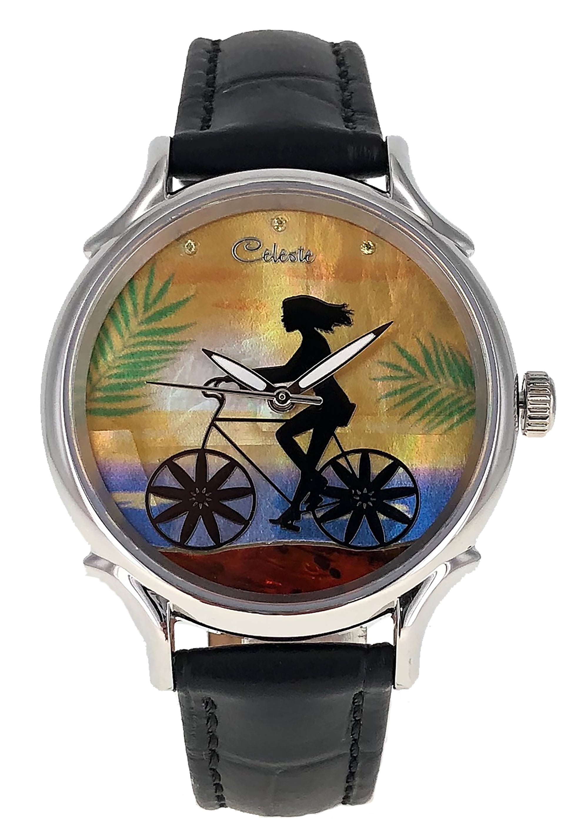 My heroine on the bike (shall we call her Summer?), with wheels smaller than the diameter of a marble, is cut out in metal and meticulously placed, by hand, on top of the iridescent mother of pearl background. Raised brown-tinted abalone shell gives the dial a 3D effect and serves as the land she lightheartedly rides upon. Golden cubic zirconia stones sparkle as time markers at the top of the dial.