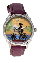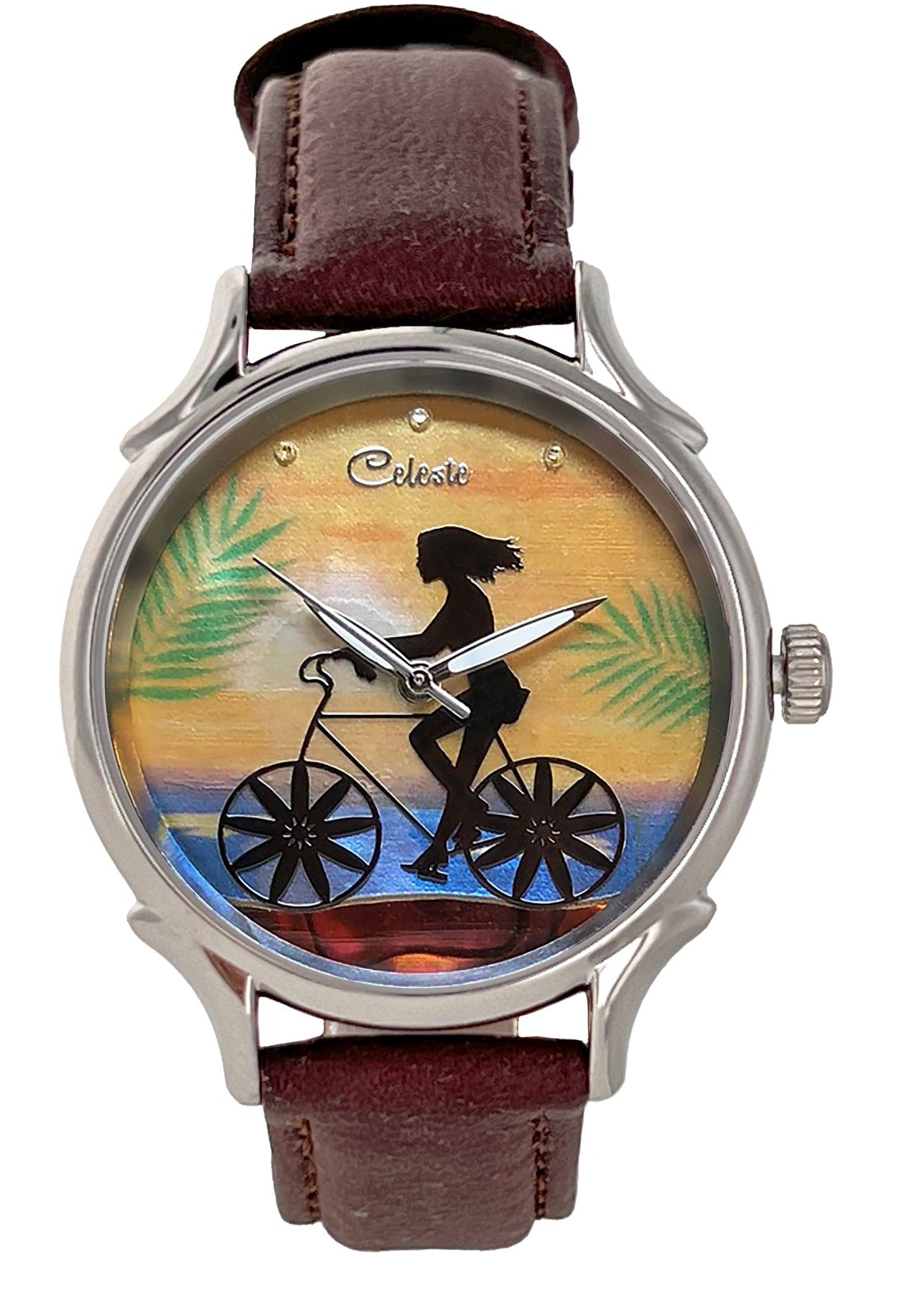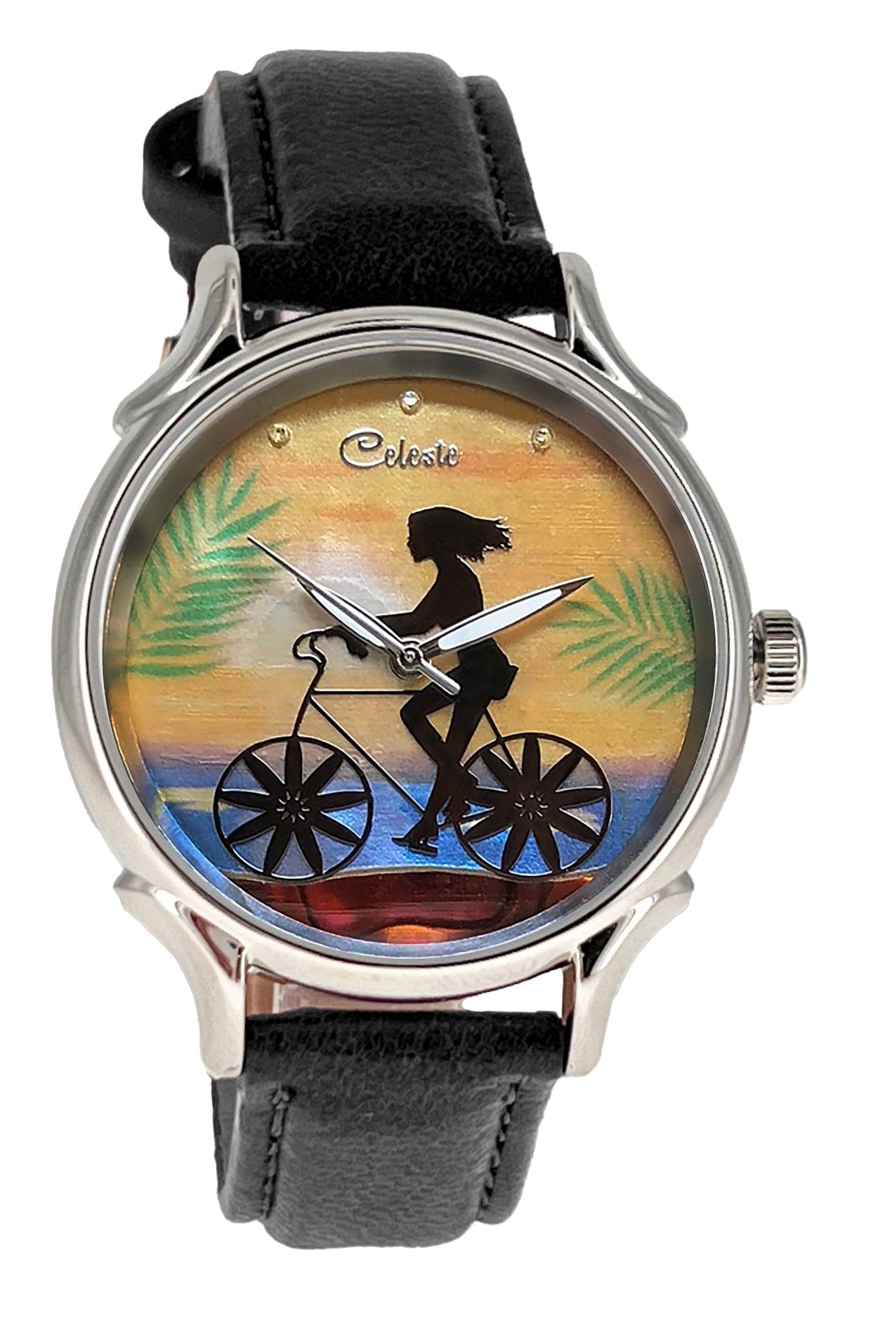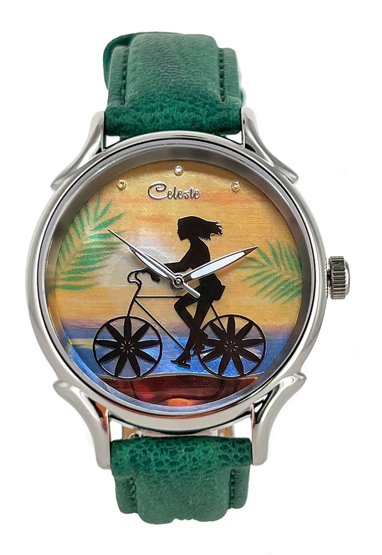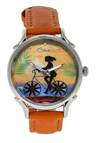 My heroine on the bike (shall we call her Summer?), with wheels smaller than the diameter of a marble, is cut out in metal and meticulously placed, by hand, on top of the iridescent mother of pearl background. Raised brown-tinted abalone shell gives the dial a 3D effect and serves as the land she lightheartedly rides upon. Golden cubic zirconia stones sparkle as time markers at the top of the dial.