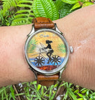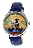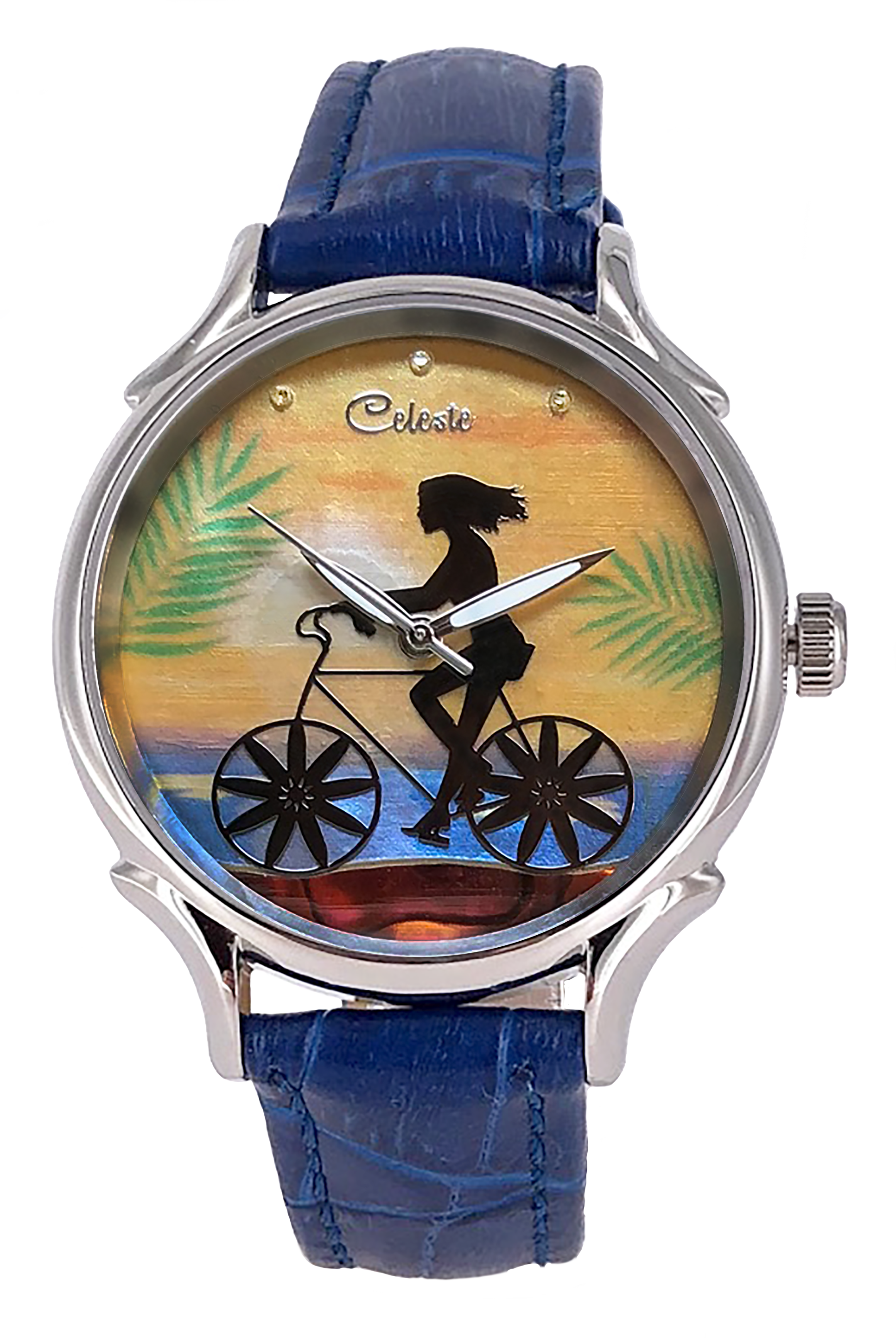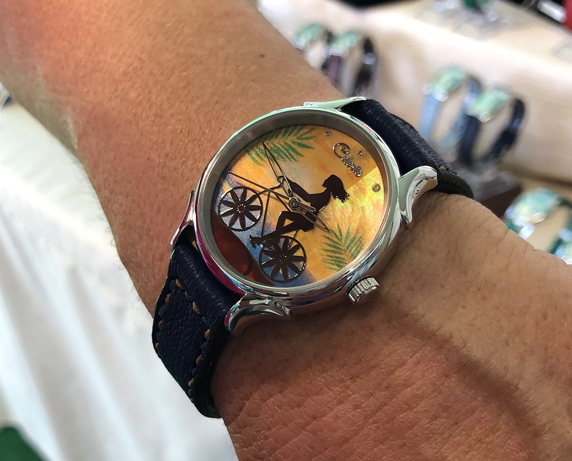 The background beach scene is printed directly on mother of pearl which gives it an unmatched iridescence and depth of color compared to other printed watch dials. In the sun, the mother of pearl sparkles and adorns you with a rainbow of beautiful colors that go with your every style and attitude. The mother of pearl directly connects you to “her”—you’re riding along the beach with the wind in your hair.