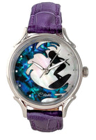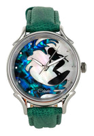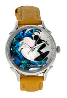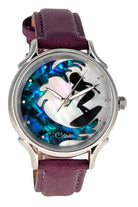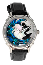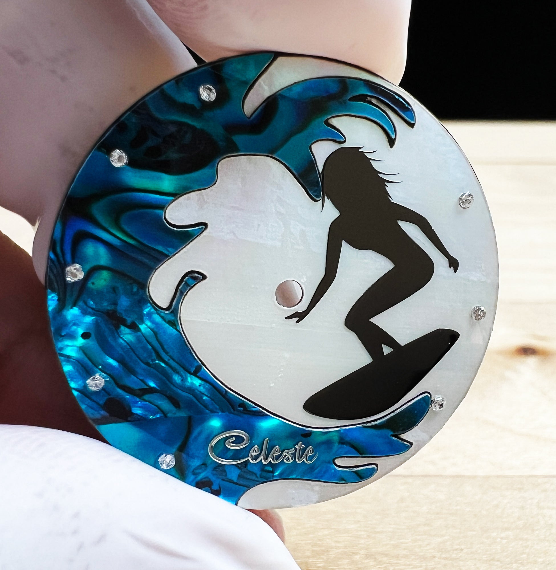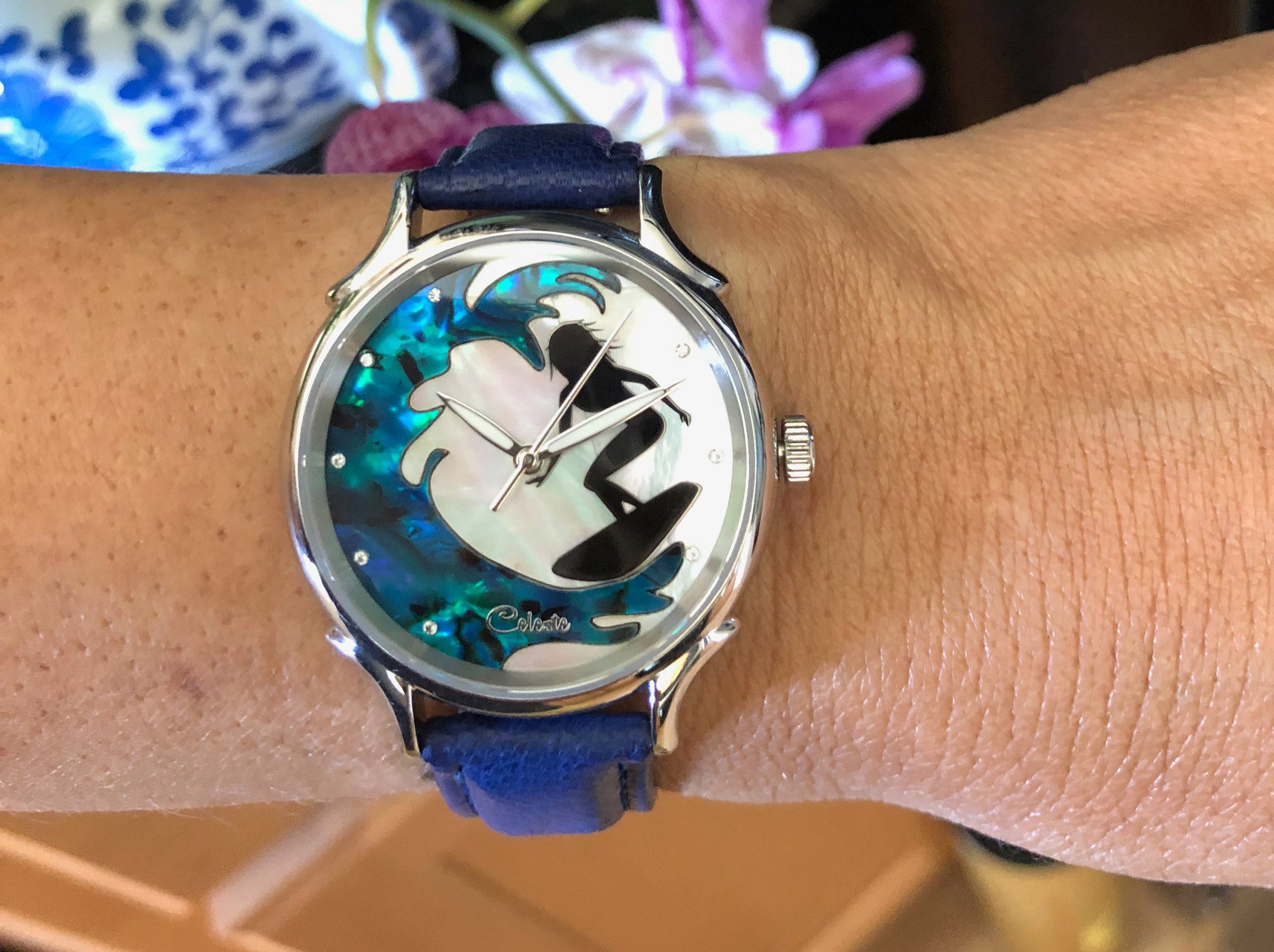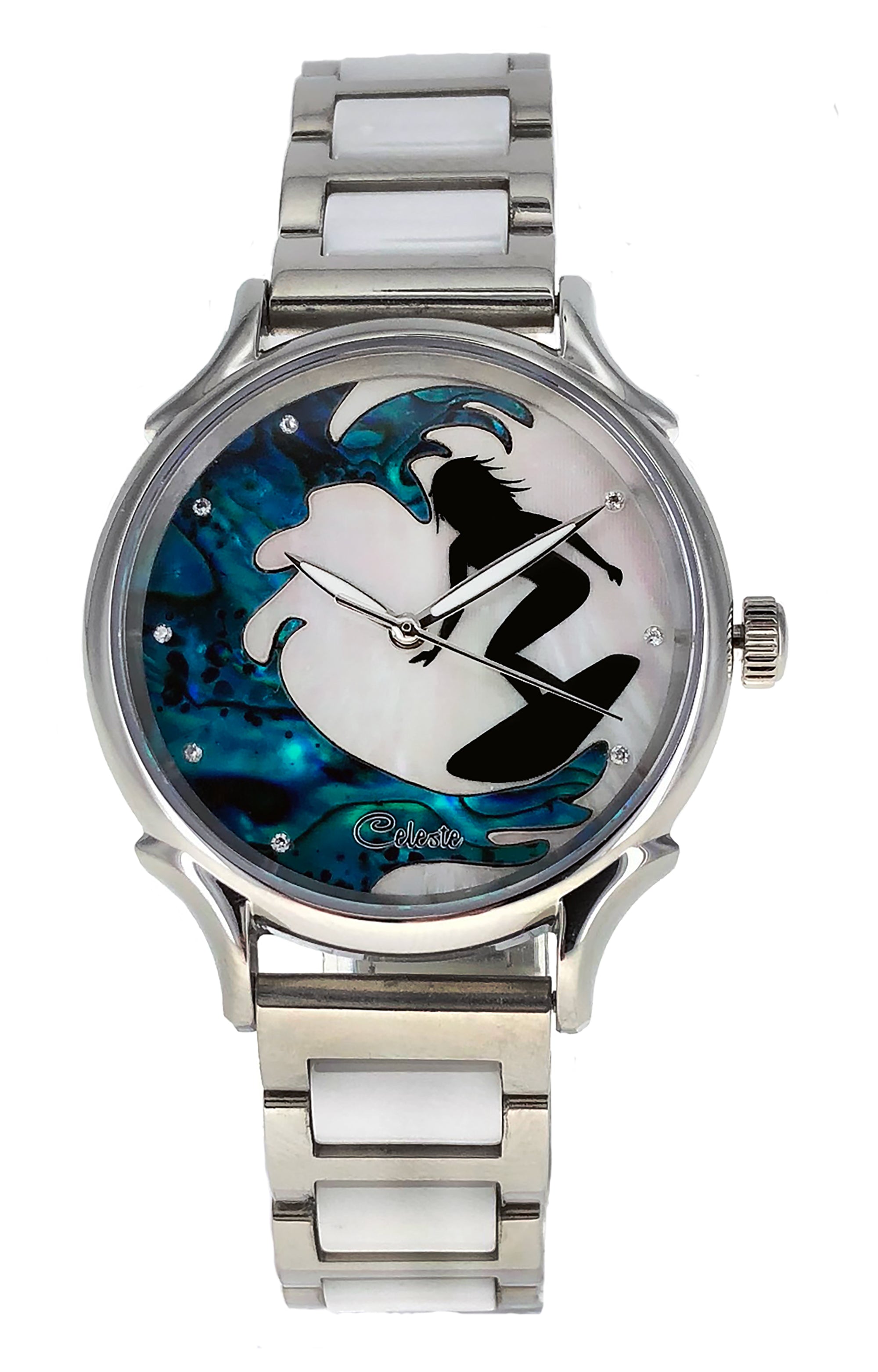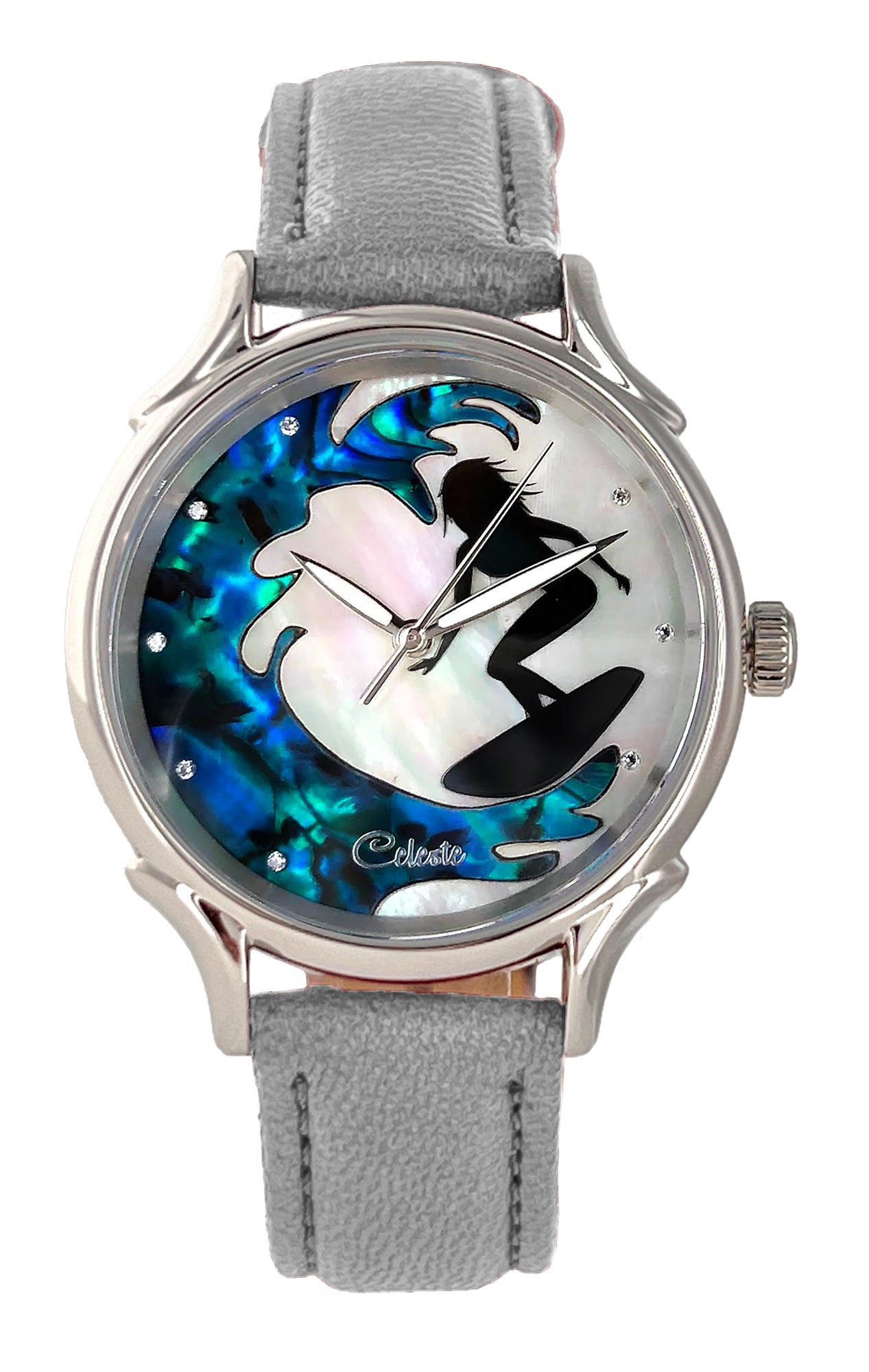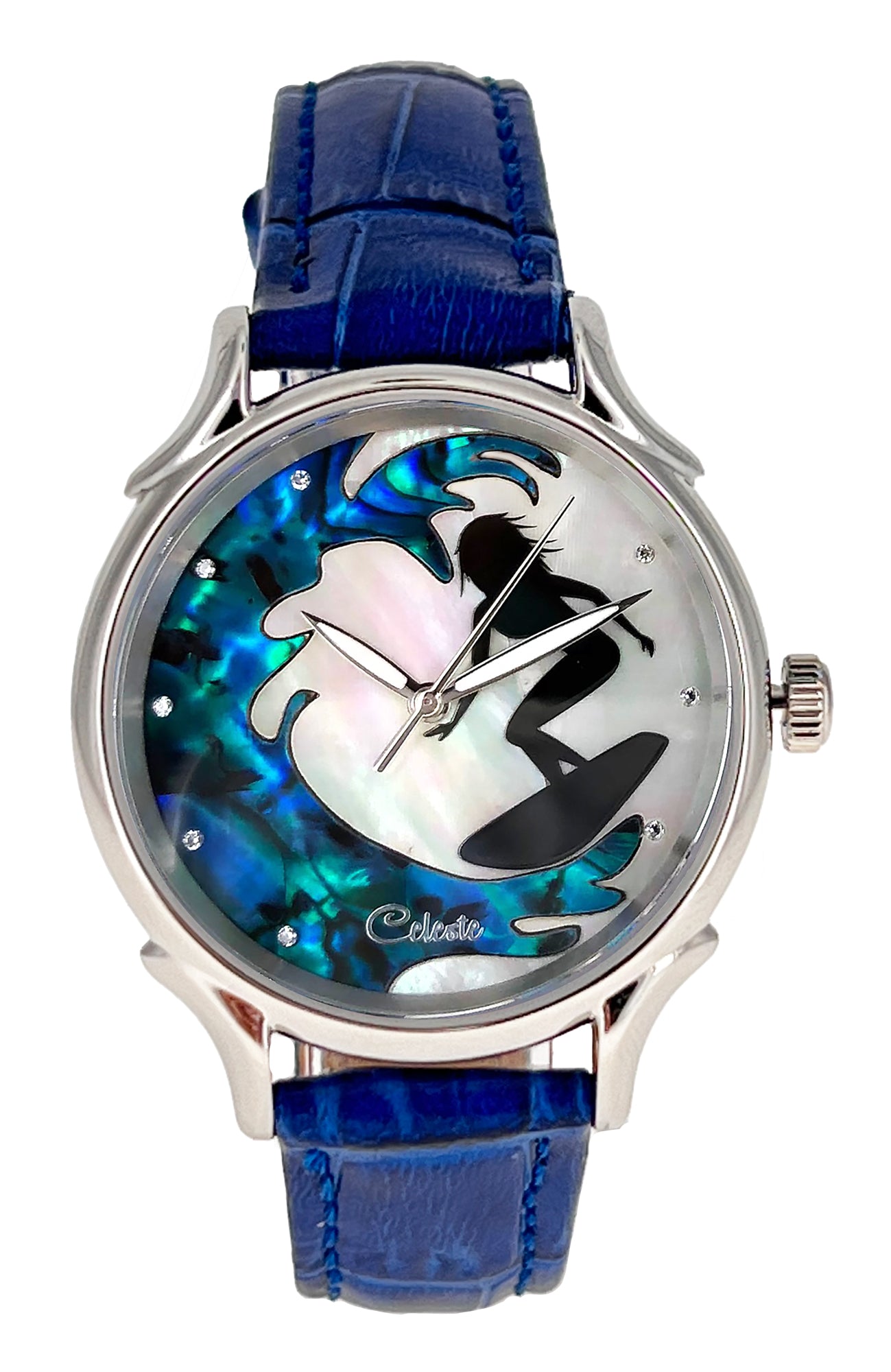 Surfer Girl is very special in that it is an inlay and stratified design at the same time. There is nothing like it anywhere. The white shell on the dial is Mother of Pearl. Mother of Pearl can have hues of purple, pink and green within it. The wave is paua abalone that has been tinted blue. These two materials are cut to fit together like a hand in a glove. My heroine riding the wave is cut from metal and requires careful, meticulous placement, by hand, on top of the iridescent Mother of Pearl background. The layered effect of the surfer girl set on top of mother of pearl gives the dial a 3D effect. Cubic Zirconia stones serve as time markers on the dial.