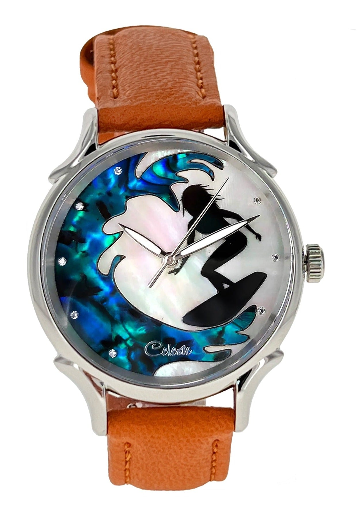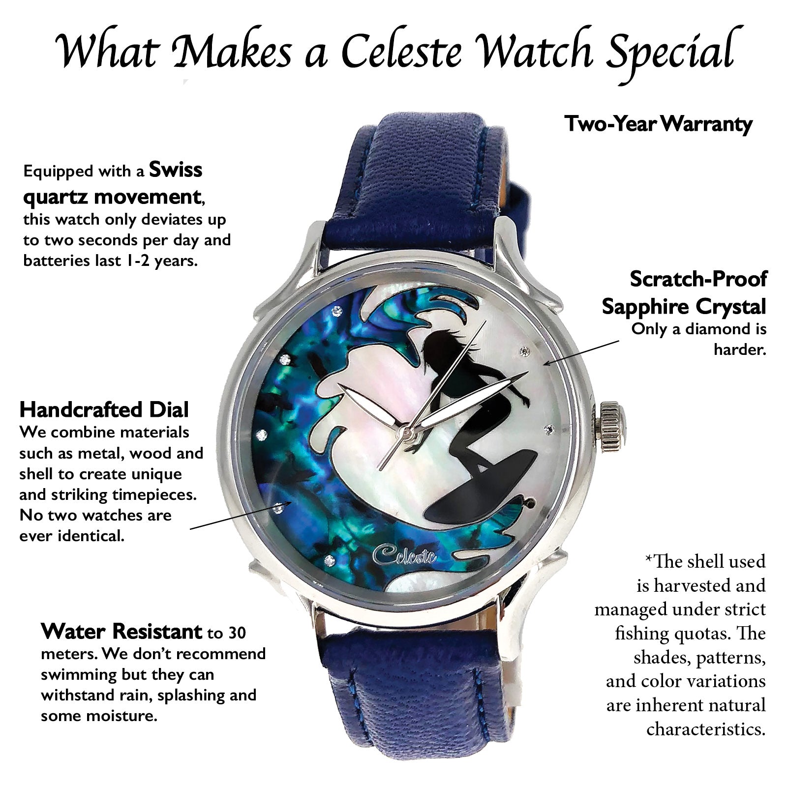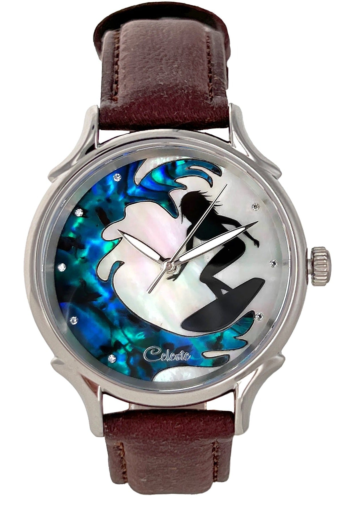 This Surfer Girl watch is about the search for the perfect wave. The wave of enlightenment, a higher consciousness, love and connection to others. It's about connecting to water and the interconnectedness of all things. The waves are a metaphor to life and relationships in that every wave is different and like in surfing, you don't catch every wave. You watch them and decide which ones to ride depending on how you feel, what you need, what you want, and how much energy you have. This watch symbolizes living in the moment and remembering that life becomes the choices we make.