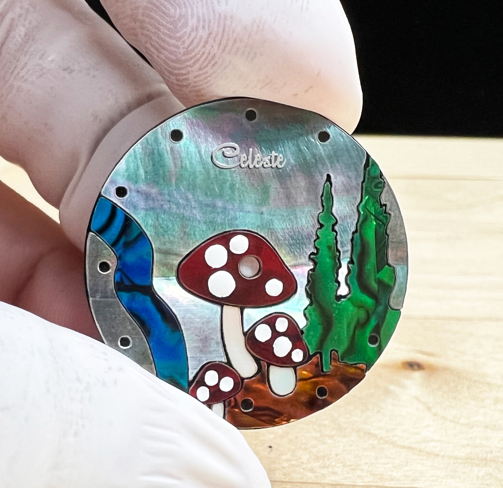 This magical mushroom forest is made up of a blue tinted abalone shell stream, green tinted trees and ochre brown dirt all inlaid in a black-lip abalone background. Black-lip abalone, with hues of turquoise, pink, purple and blue come from the Philippines. The mushrooms themselves are red tinted abalone with hand-painted white spots and Tahitian abalone stems.