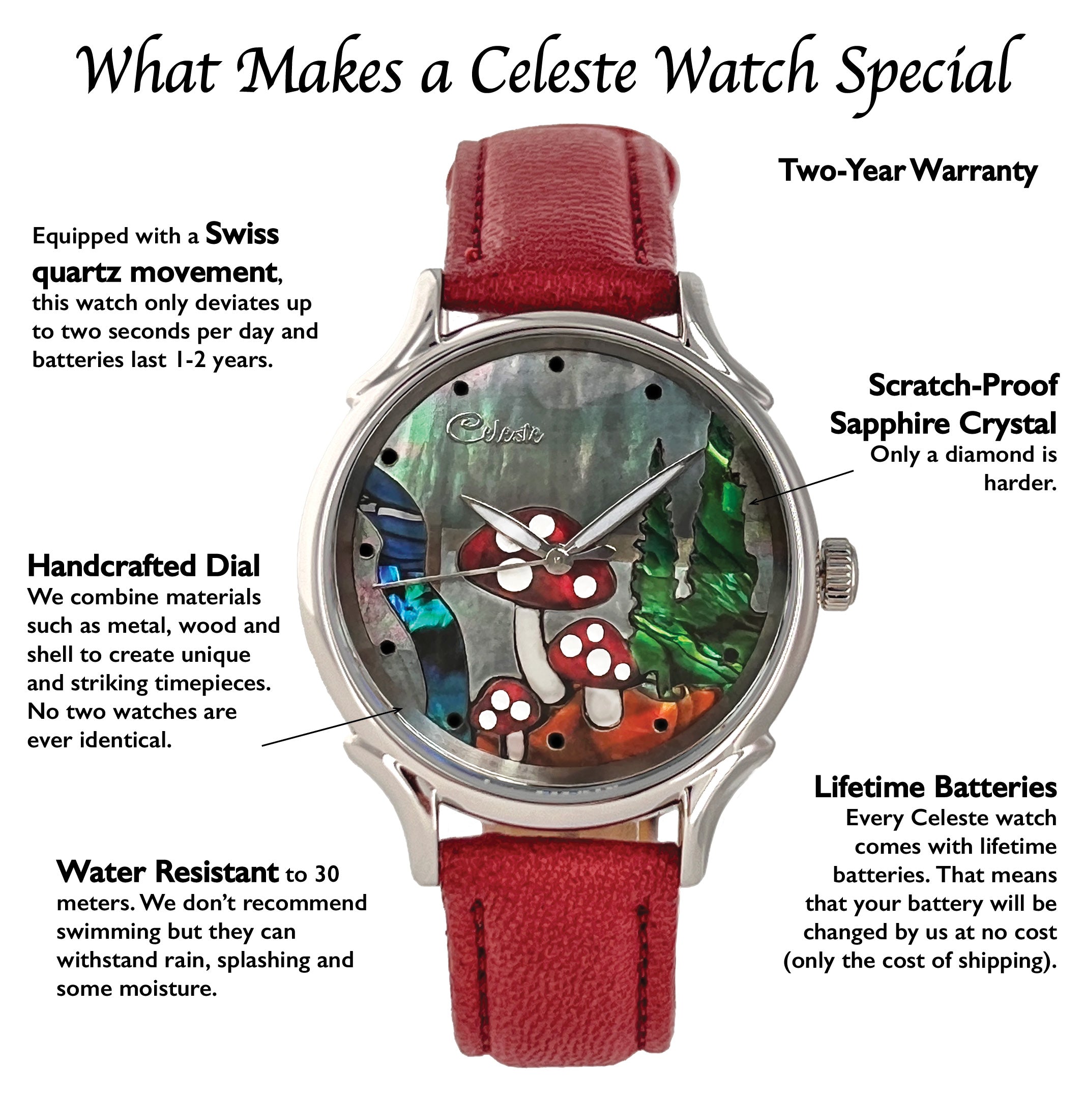 - Every Celeste watch comes with its very own travel friendly case! Perfect for storage and shipping, your watch is snuggly nestled in plush felt, protected from drops, knocks, and bangs.