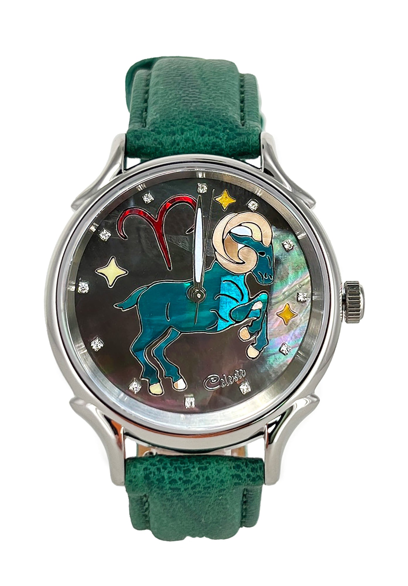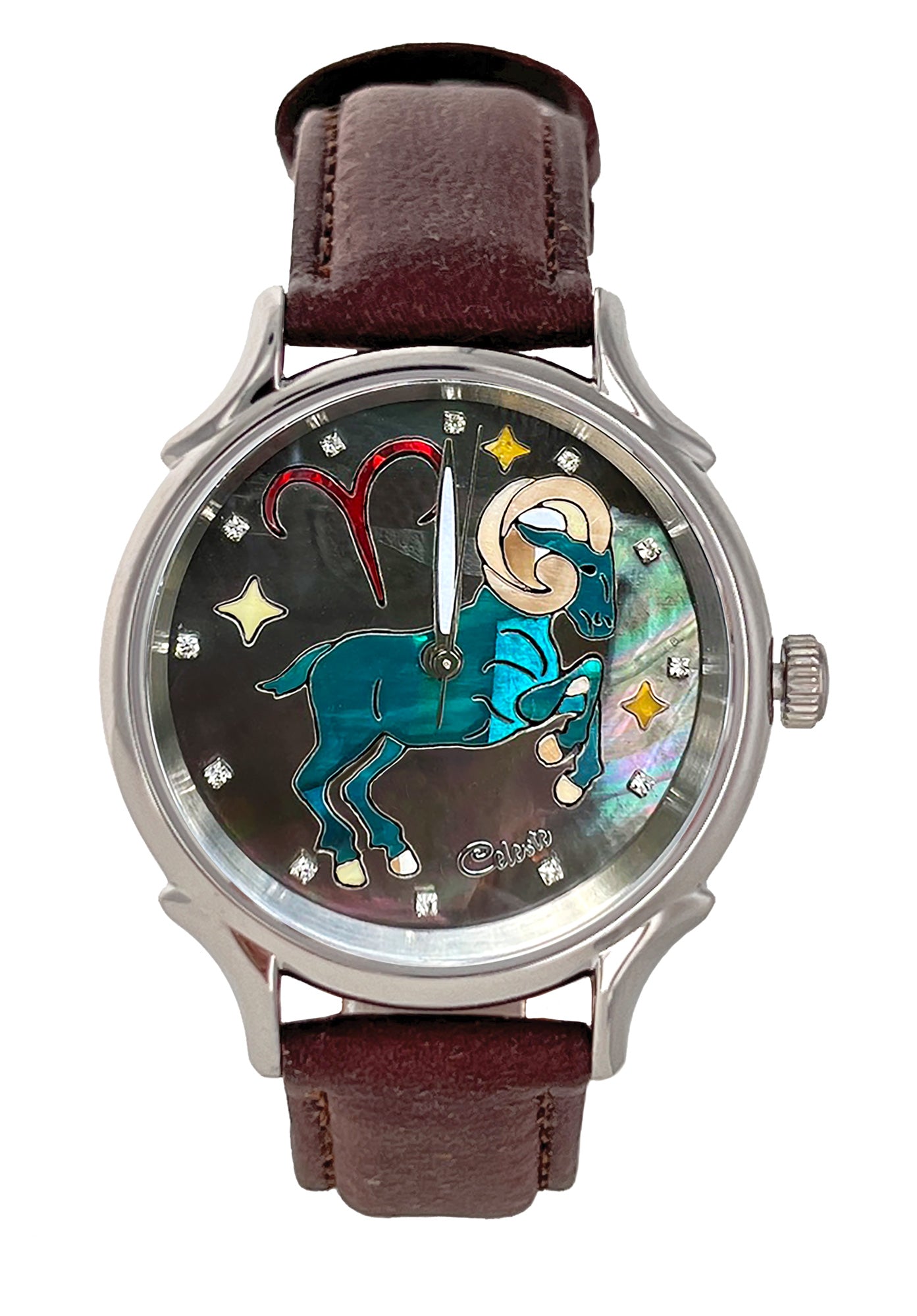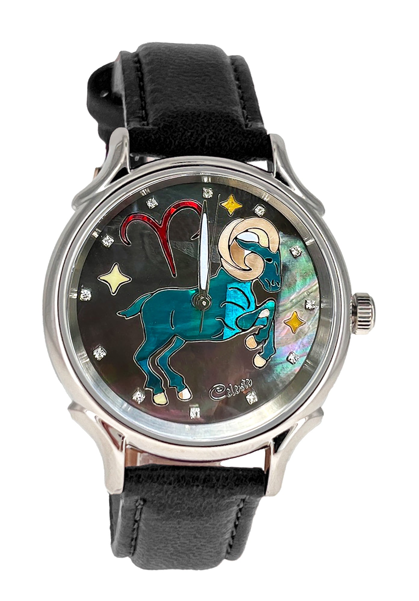 Crafted by hand, the ram was created with an angel wing abalone body and creamy Tahitian abalone horns and hooves. The yellow stars and Aries symbol are all inlaid in a Tahitian black-lip abalone background. Clear CZ stones serve as time markers around the dial.