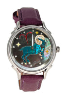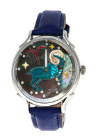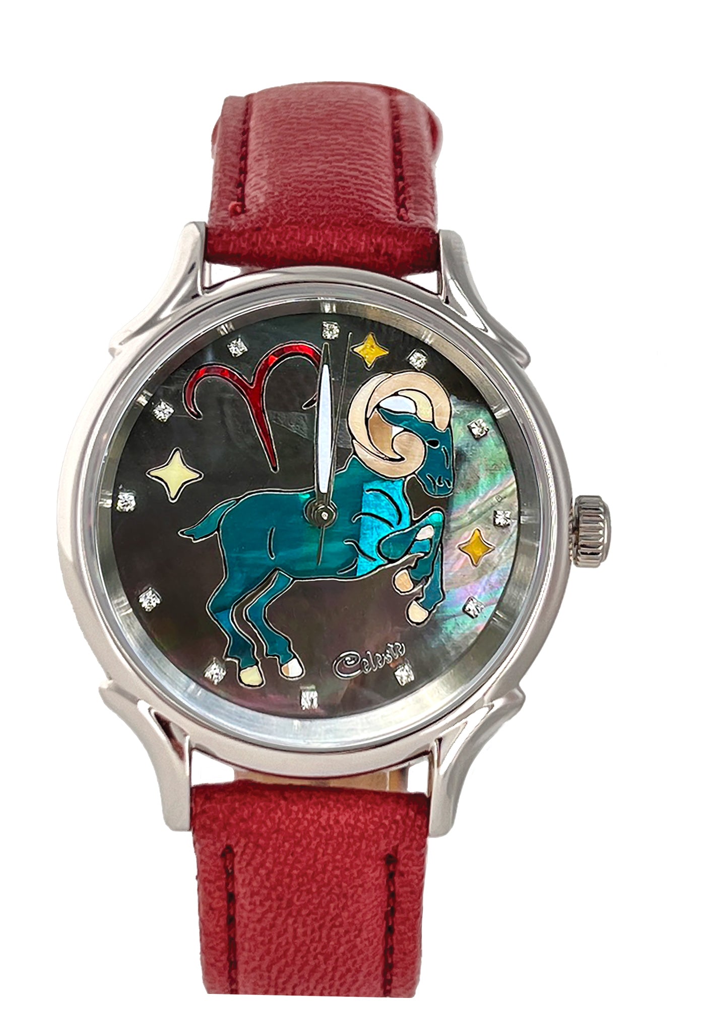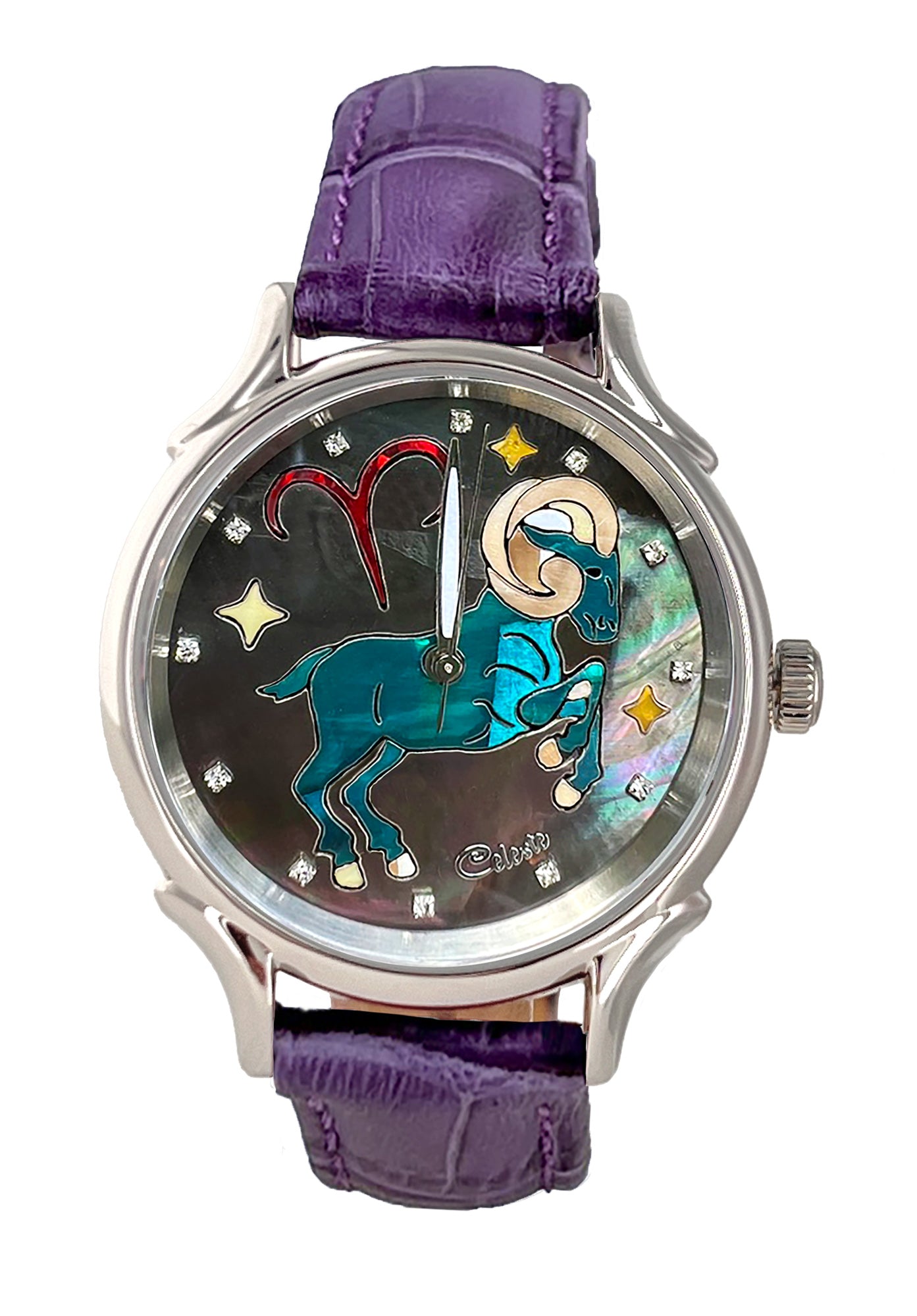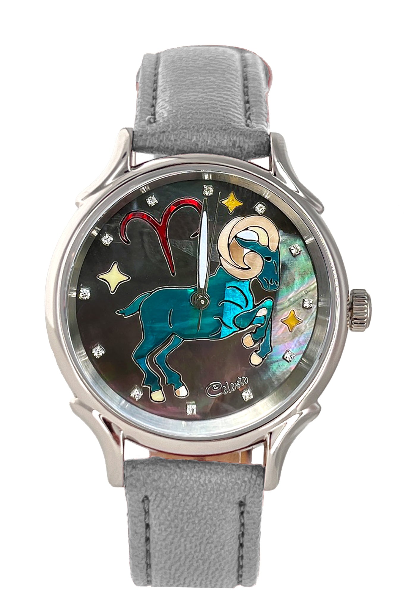 Crafted by hand, the ram was created with an angel wing abalone body and creamy Tahitian abalone horns and hooves. The yellow stars and Aries symbol are all inlaid in a Tahitian black-lip abalone background. Clear CZ stones serve as time markers around the dial.