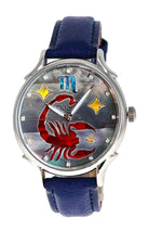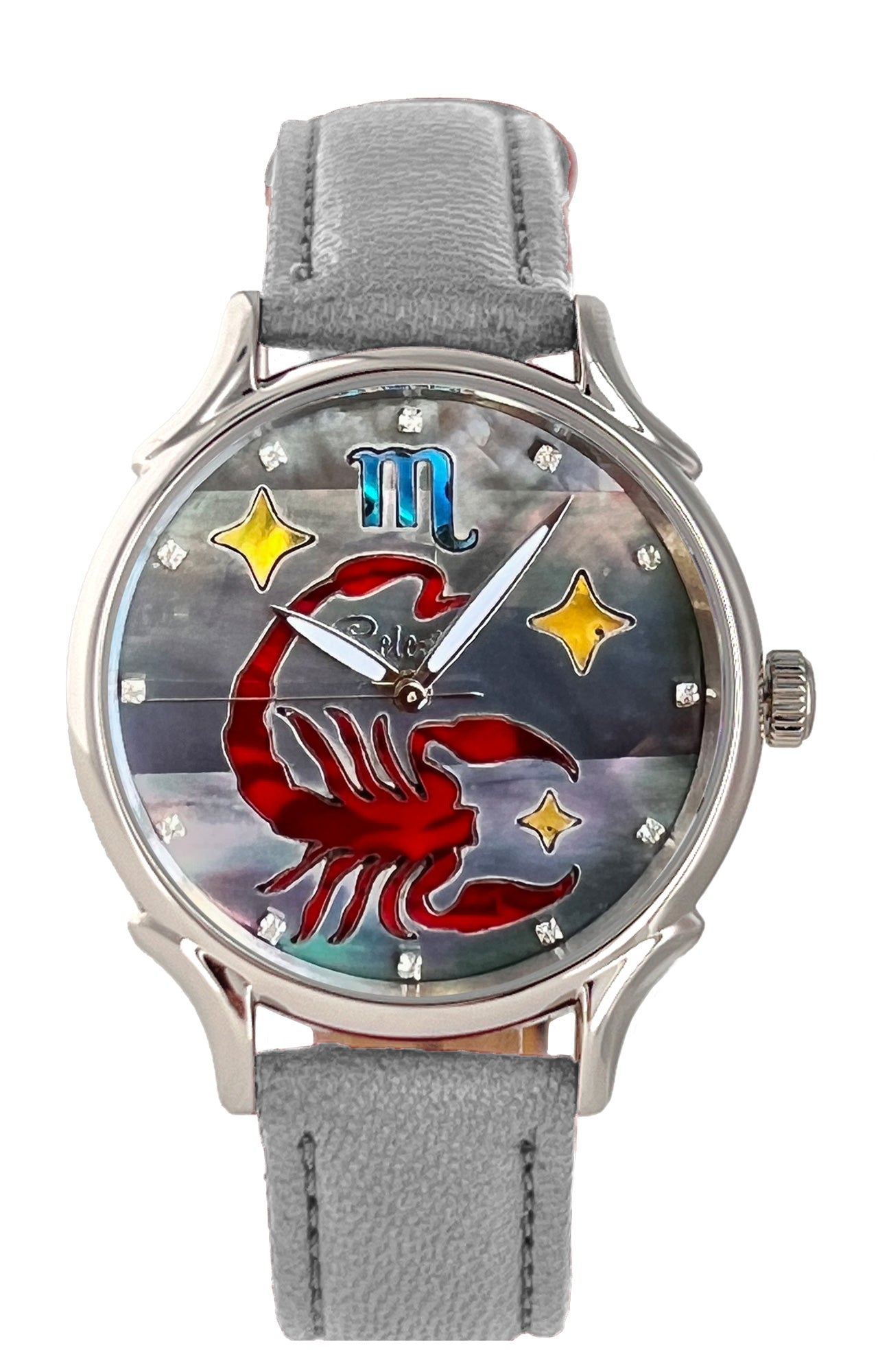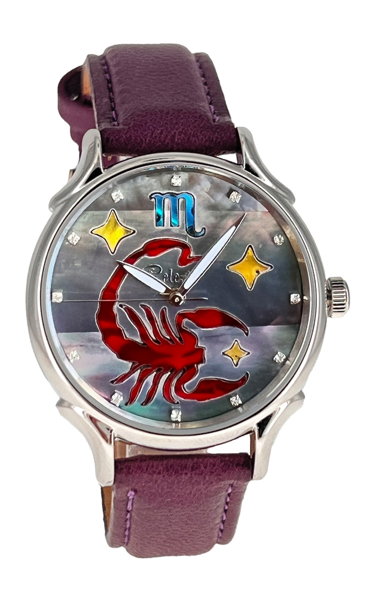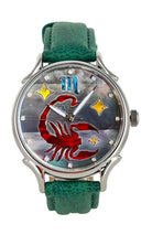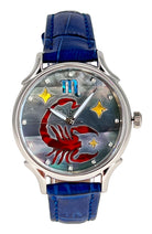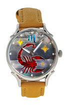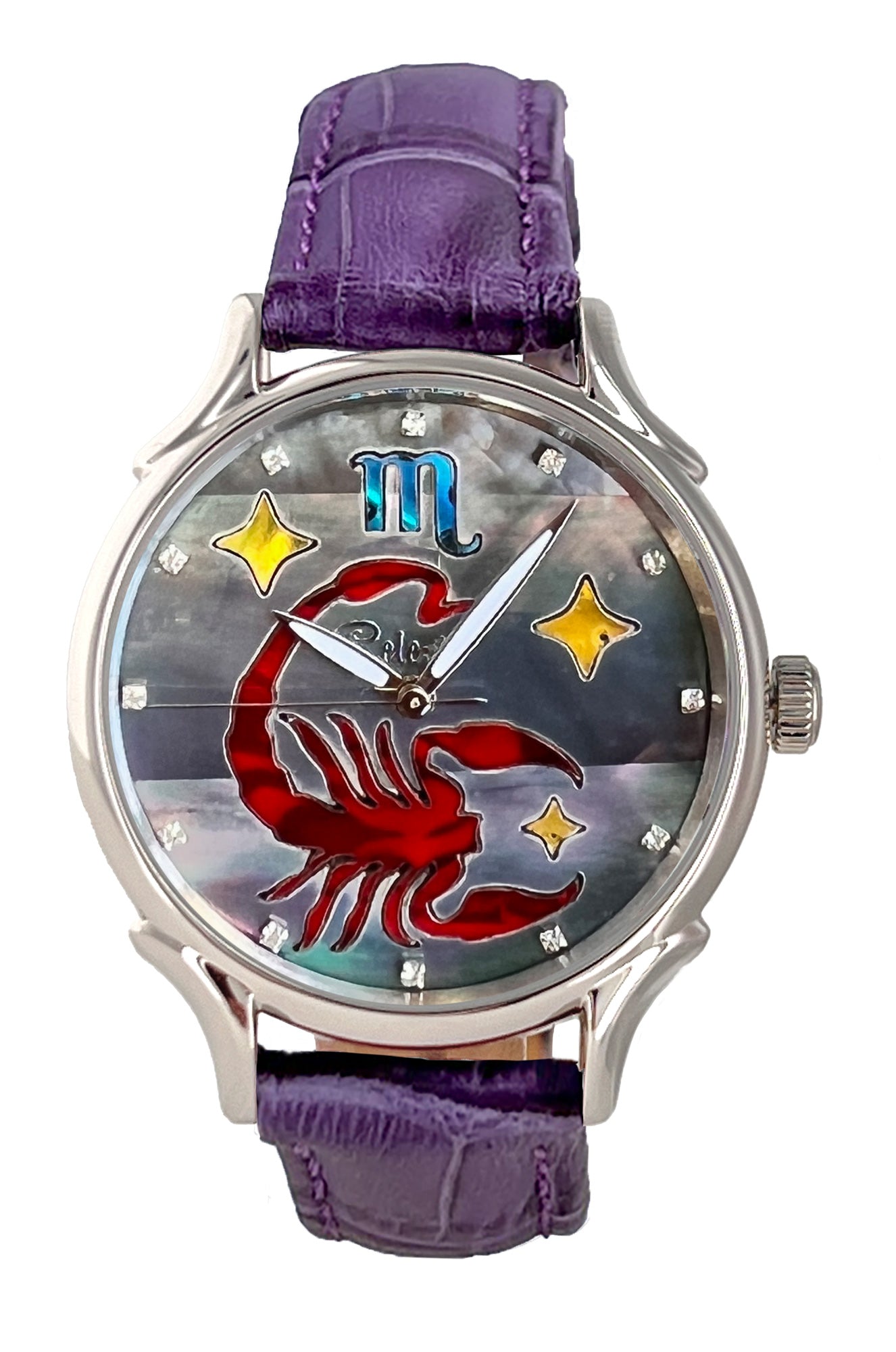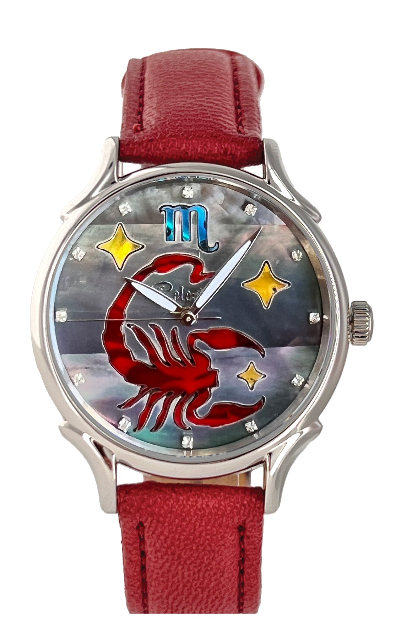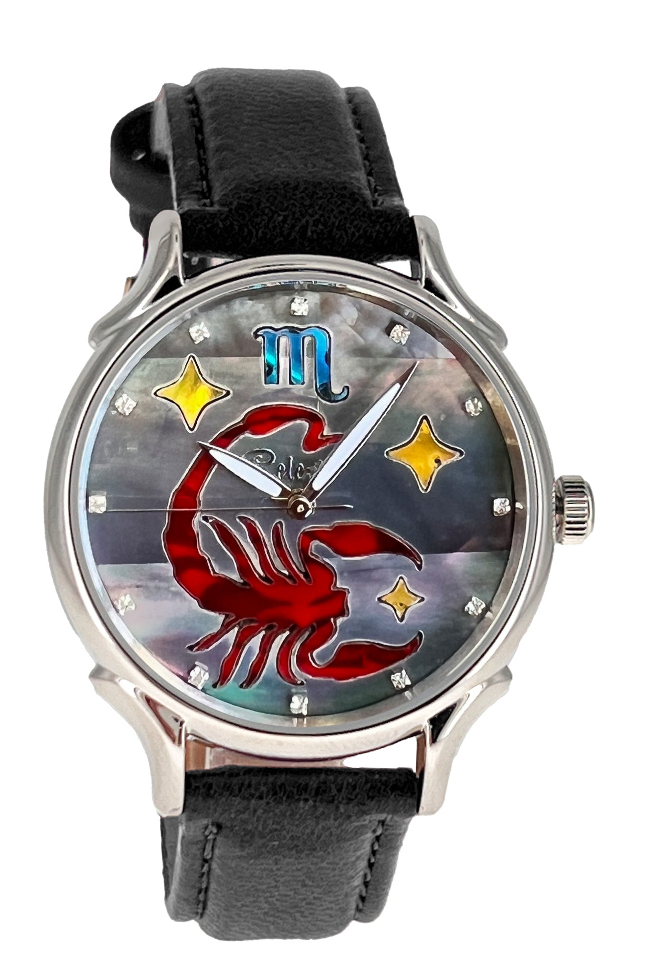 Crafted by hand, the red scorpion is created with red tinted abalone. The blue tinted abalone scorpio symbol and yellow abalone stars are all inlaid in a Tahitian black-lip abalone background. Clear CZ stones serve as time markers around the dial.