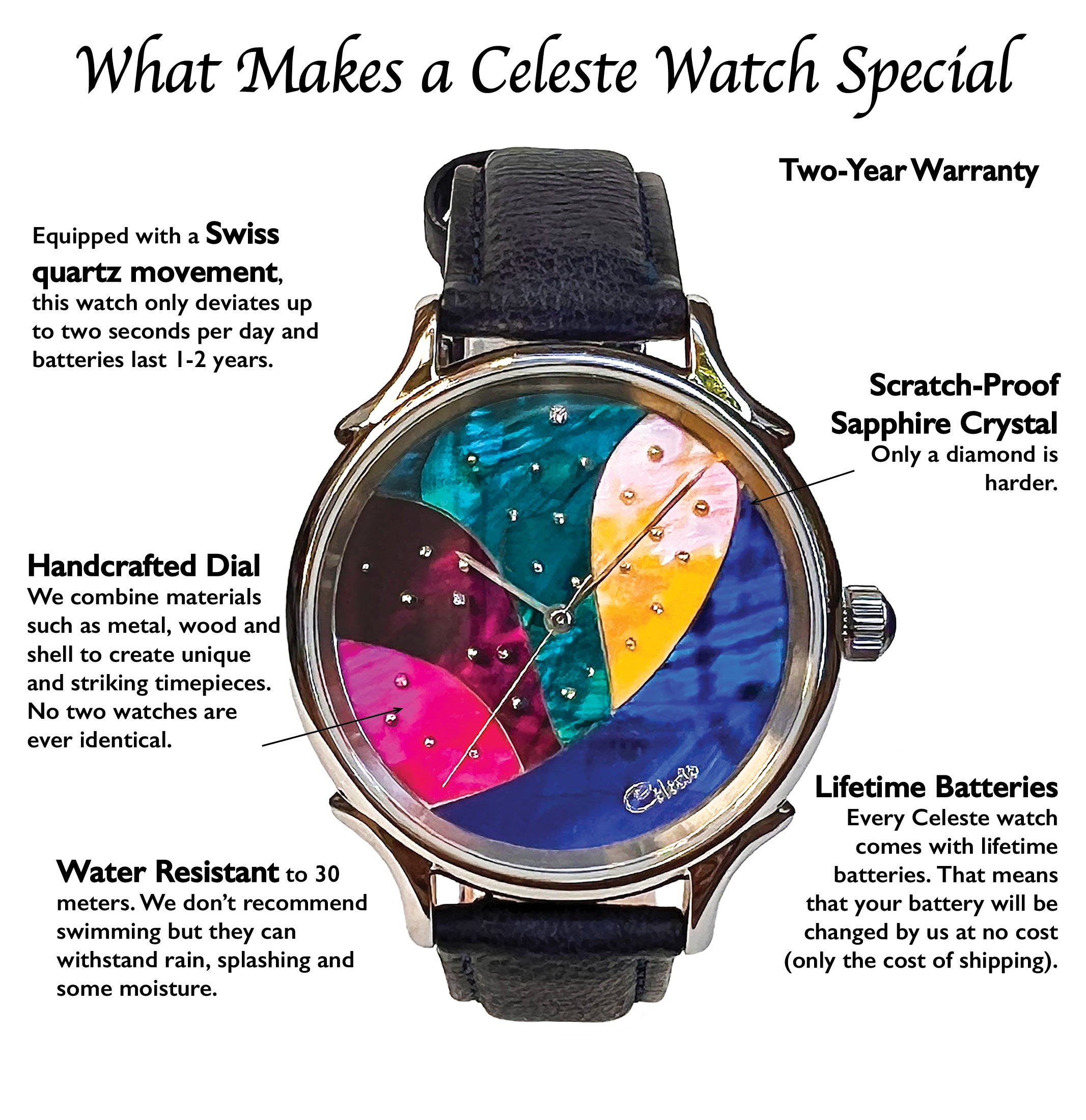Celeste watches are designed to reflect the joys found in life and the breathtaking wonders of nature. These watches are our contribution to making a better world, a world filled with more color, beauty and goodness.