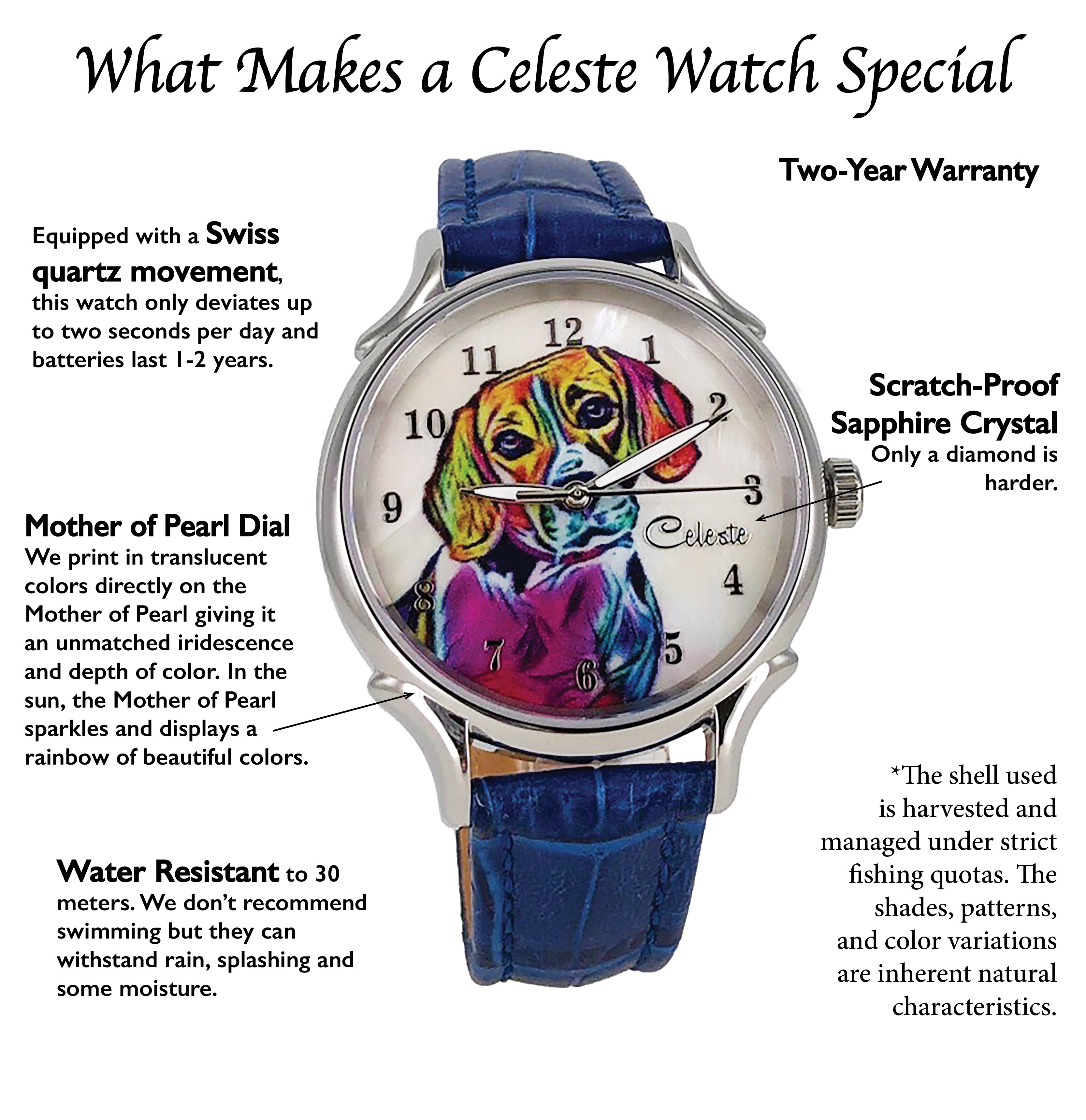 If you are unsatisfied with the performance of your watch, we'll make it right. Whether you made the purchase or received your watch as a gift, it's Celeste's guarantee that your watch will maintain its beauty and precision.