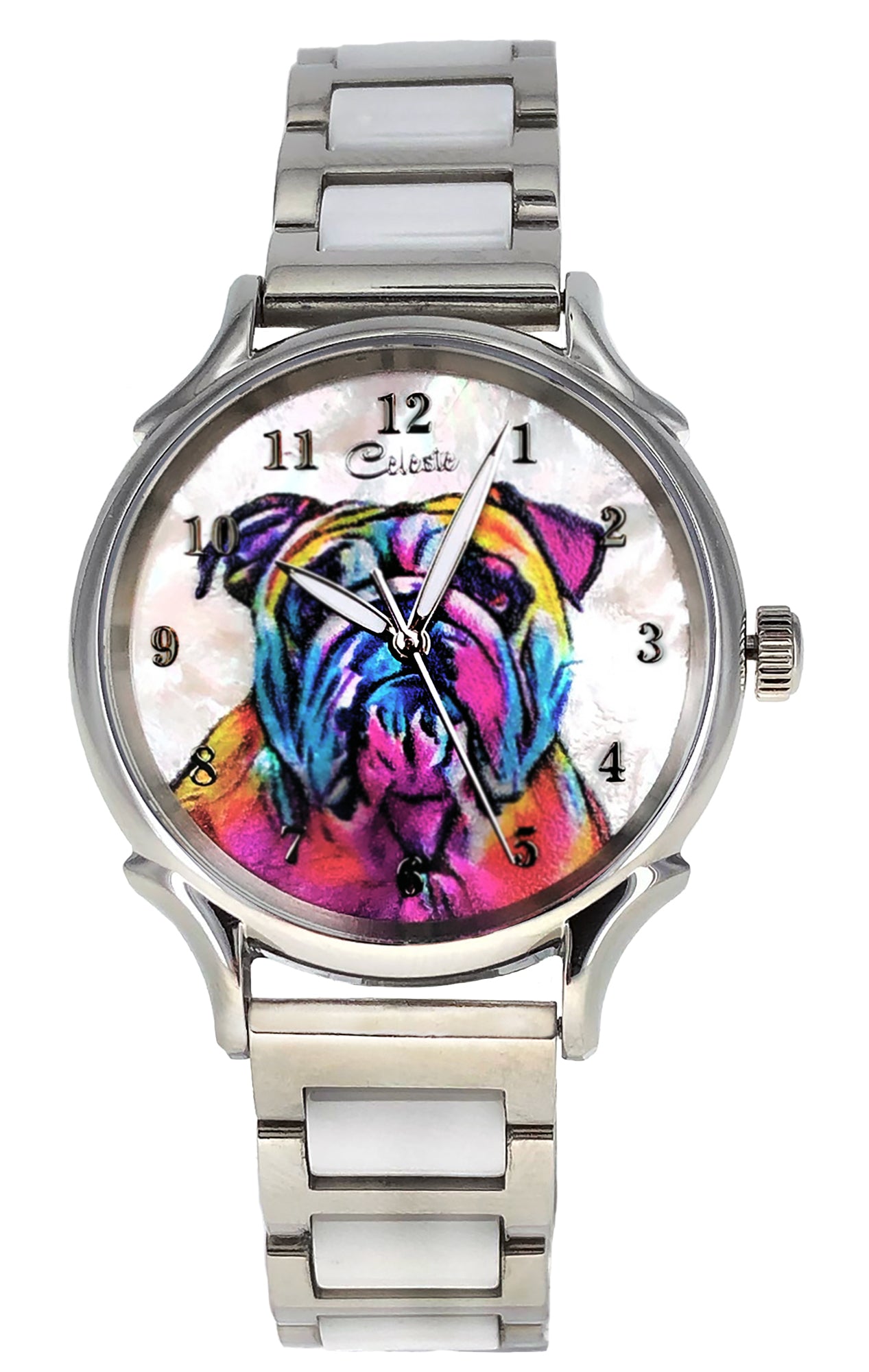 The pop art rainbow dog portrait is printed directly on the Mother of Pearl giving it an unmatched iridescence and depth of color. In the sun, the Mother of Pearl sparkles and displays a rainbow of beautiful colors that compliment your every outfit.