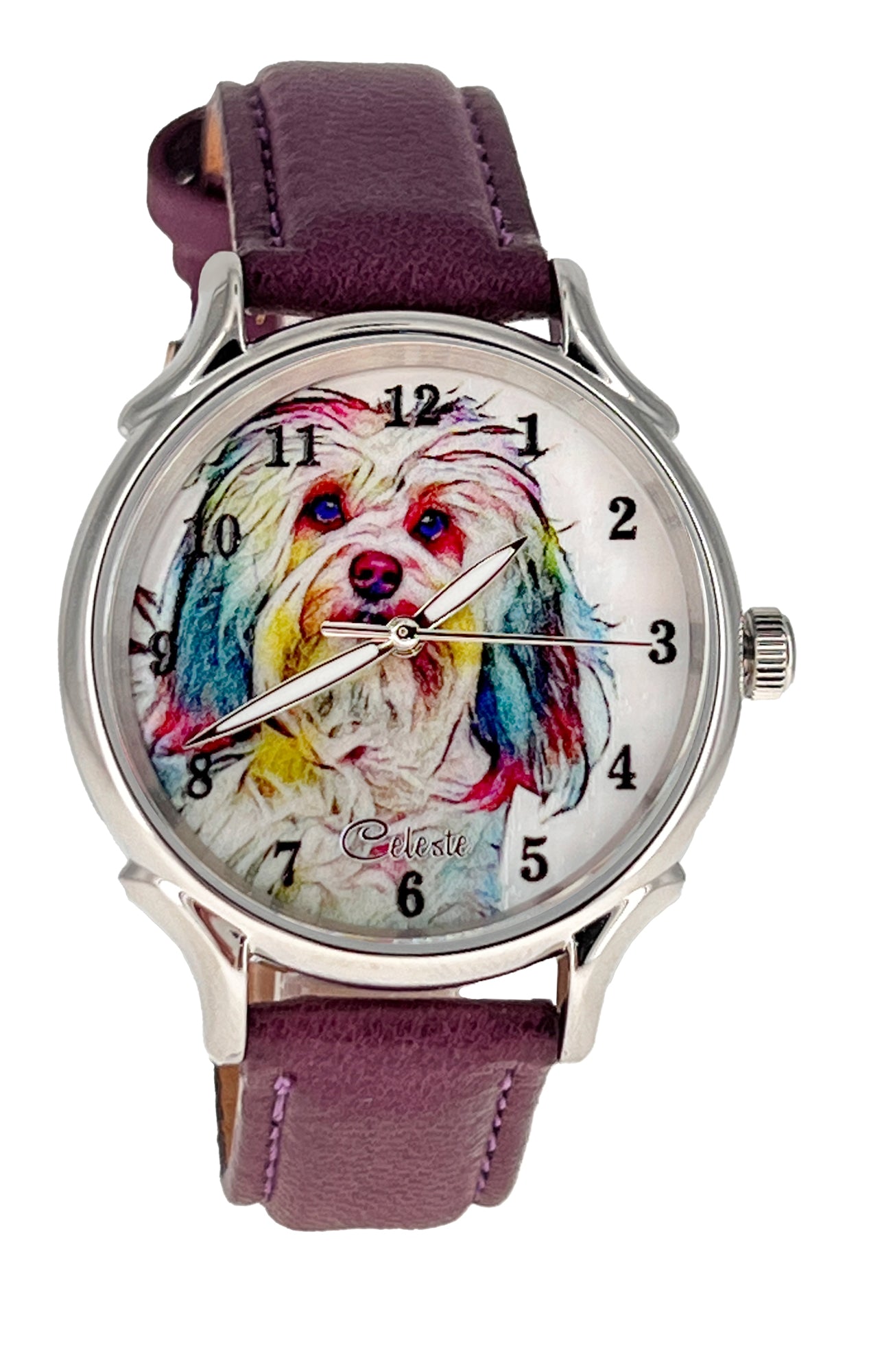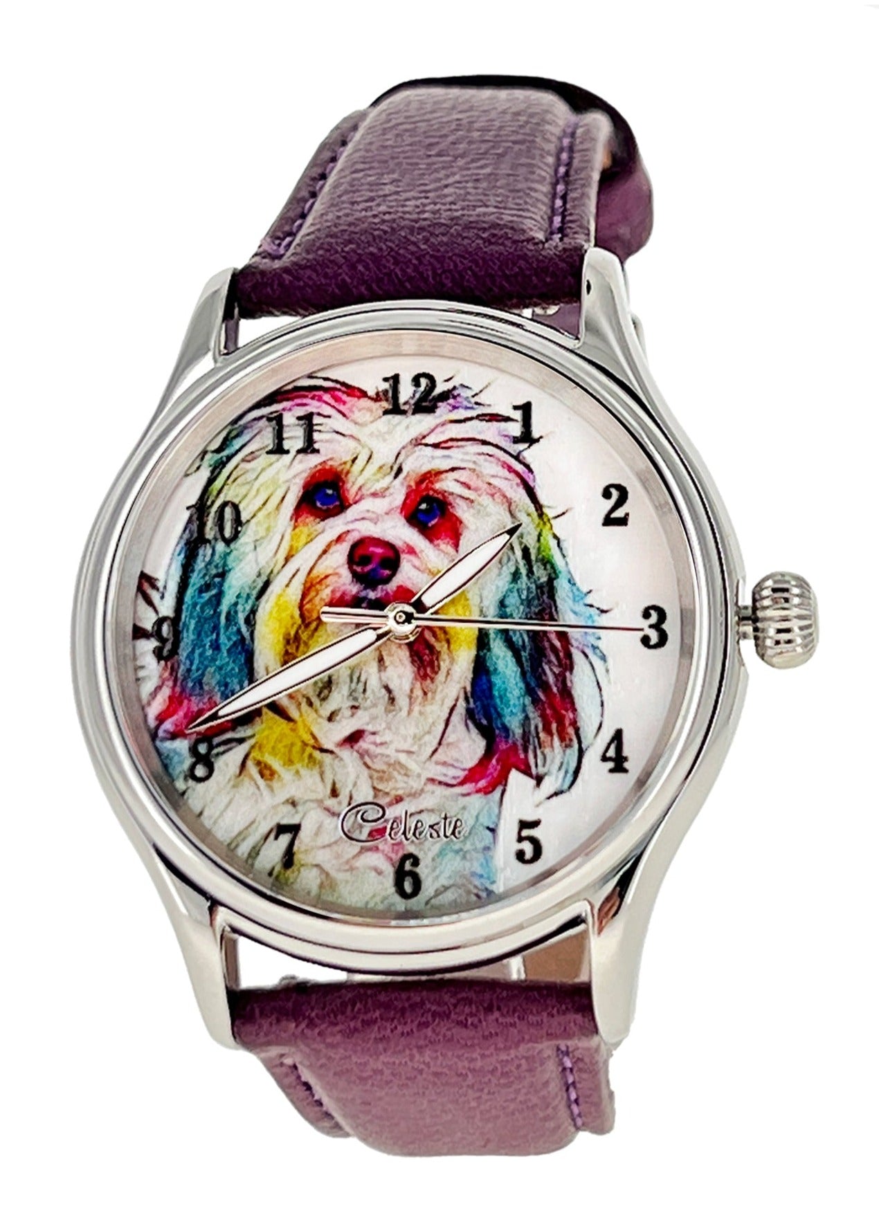 • Many colorful leather strap colors are available for every Celeste watch. From electric blue, purple, and red to turquoise, pumpkin, and grey there is a color for everyone. Metal bands are also available for the same price.