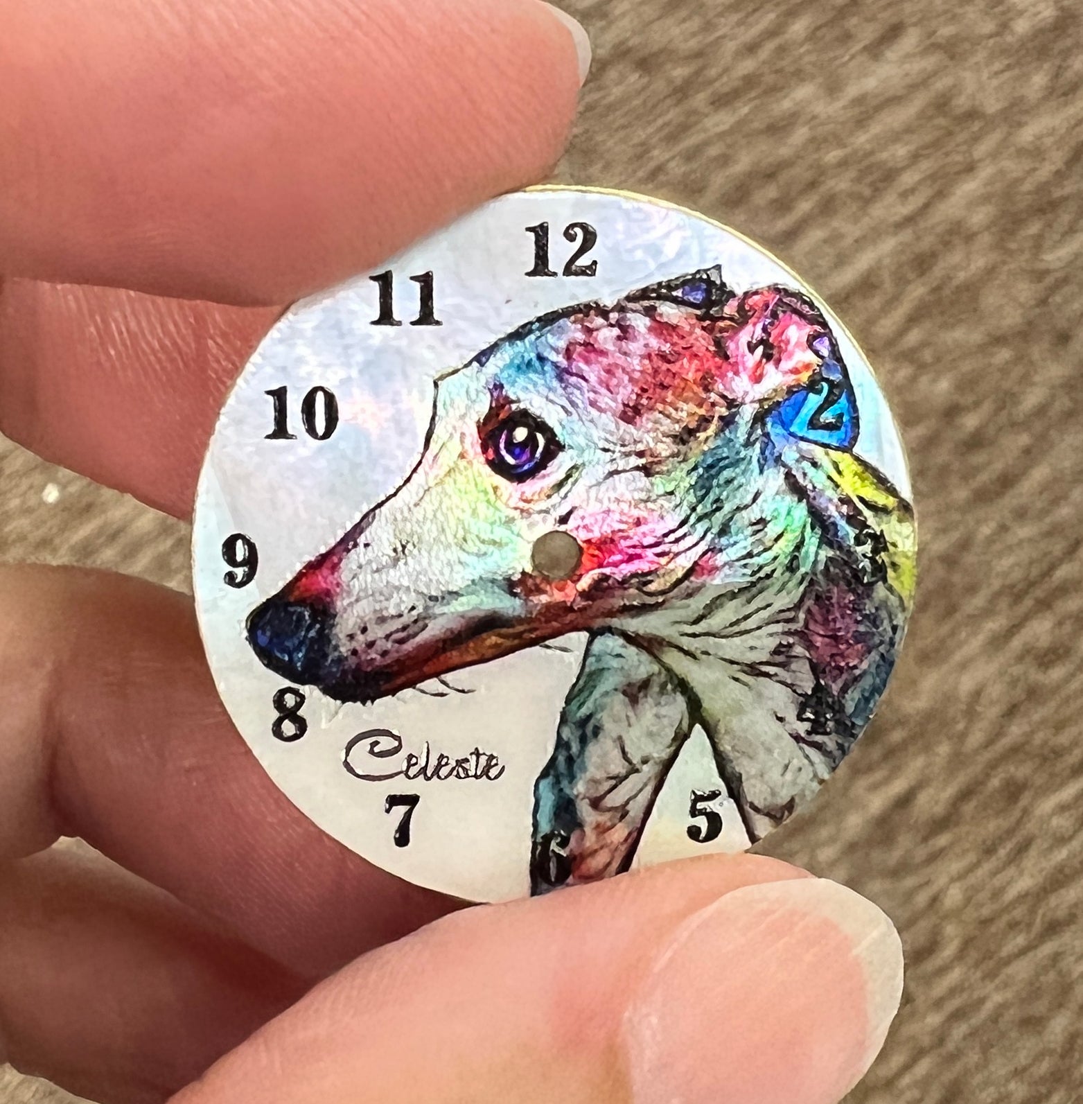 The pop art rainbow dog portrait is printed directly on the Mother of Pearl giving it an unmatched iridescence and depth of color. In the sun, the Mother of Pearl sparkles and displays a rainbow of beautiful colors that compliment your every outfit.