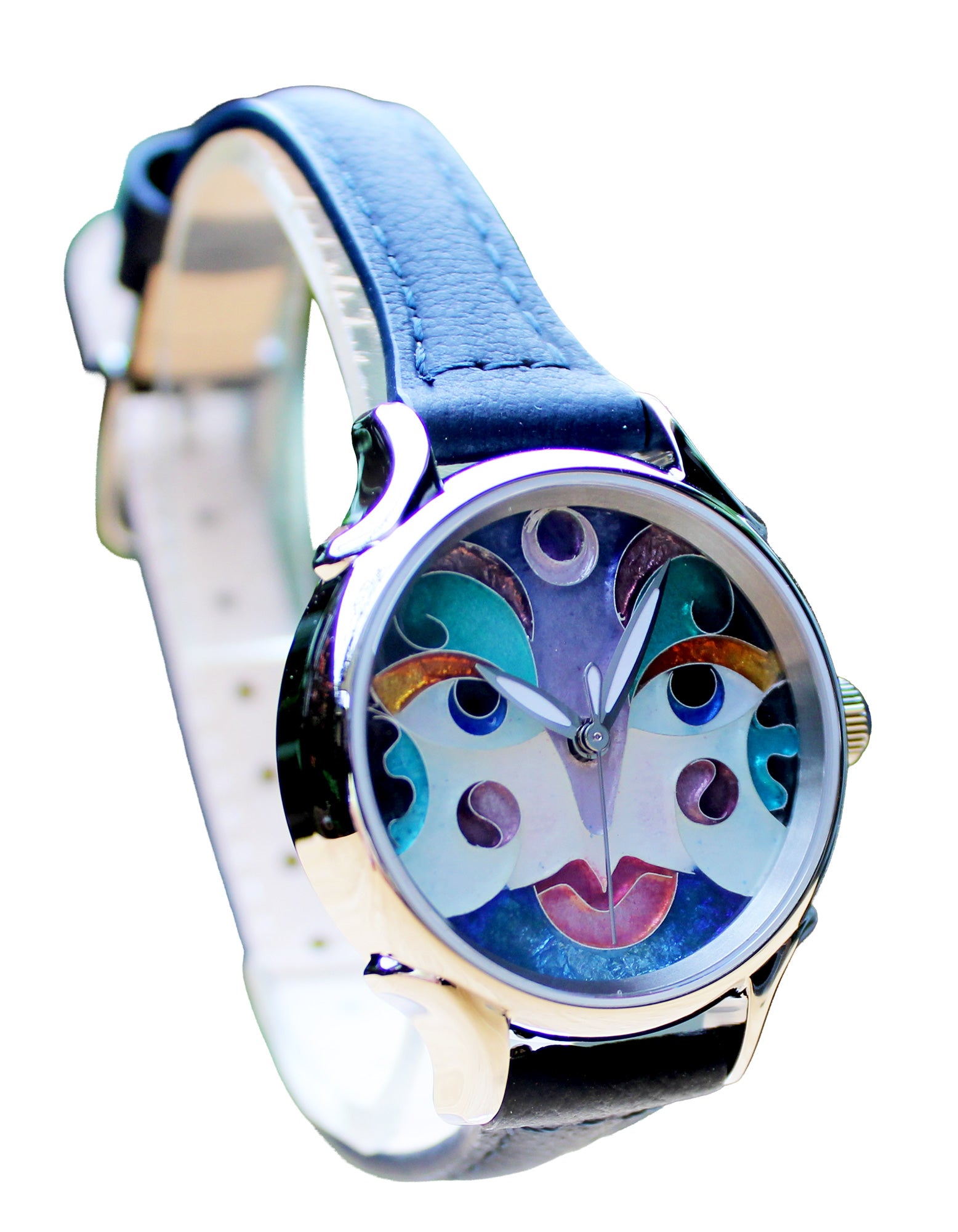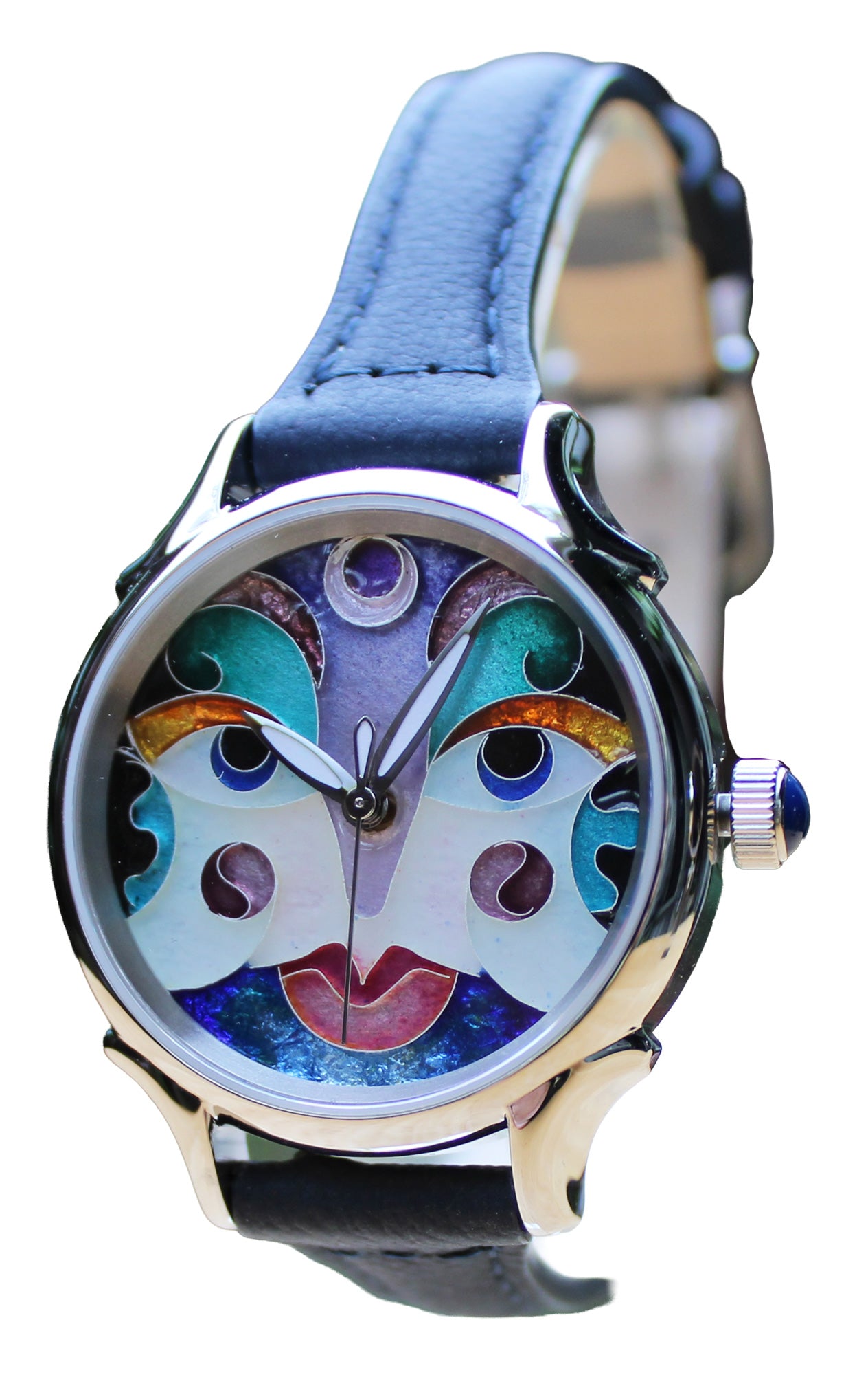 This colorful fine silver and cloisonné enamel watch dial exemplifies the festivity, party and ceremony of a Masquerade. With her 24K gold enhanced eyebrows, her blue-violet head piece and her impish pucker she is both vibrant and mysterious at the same time.