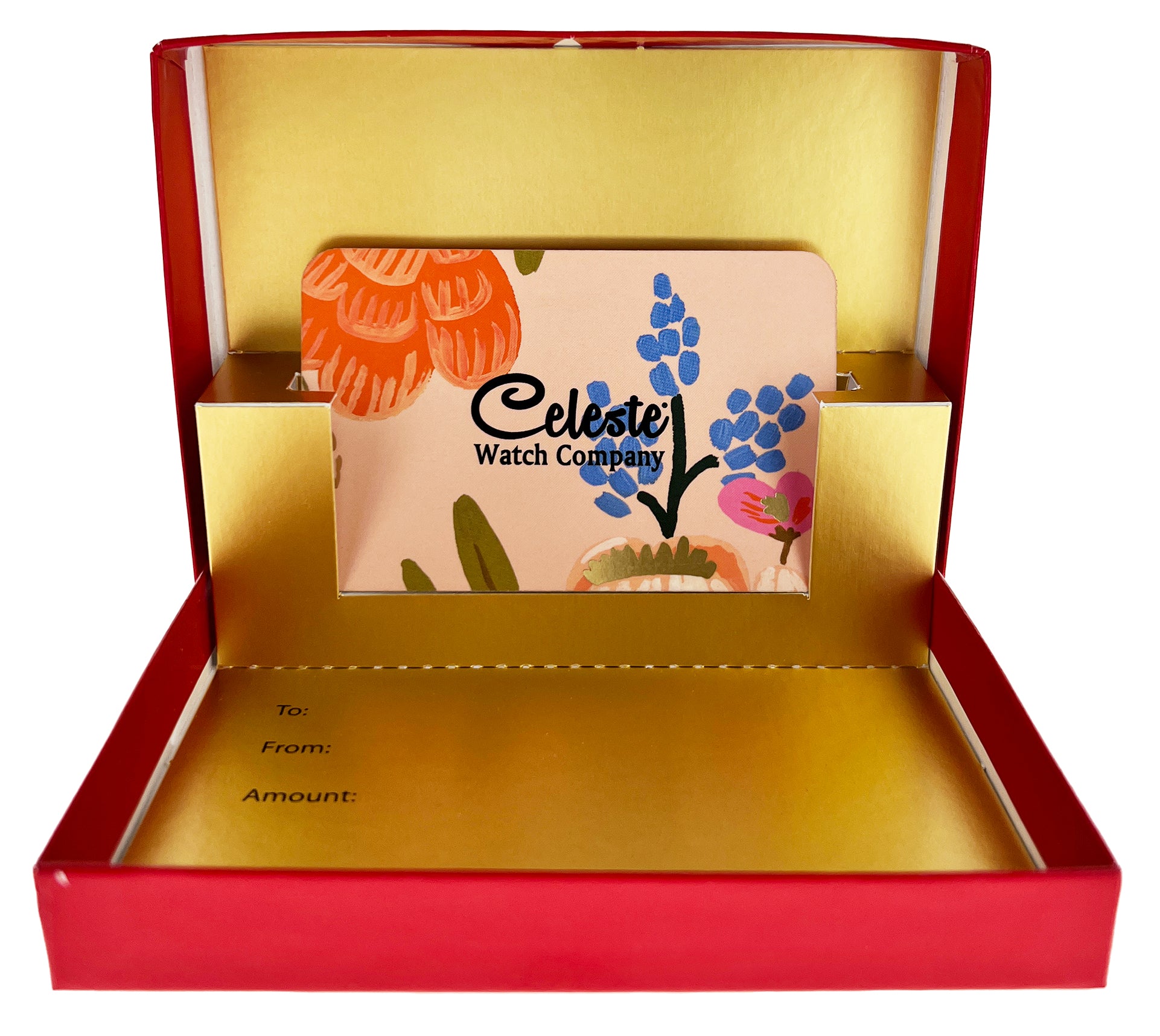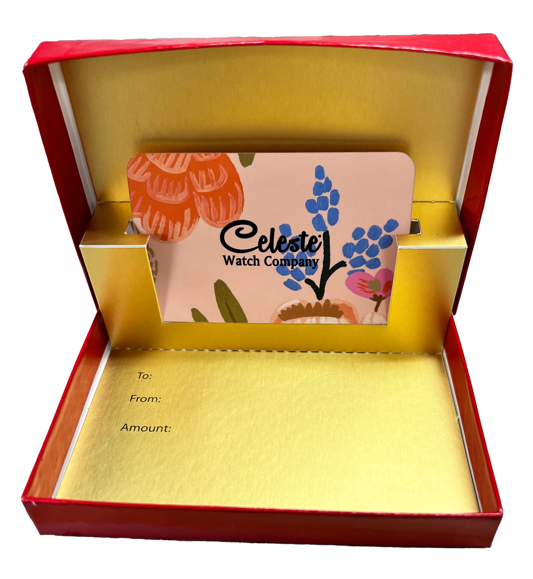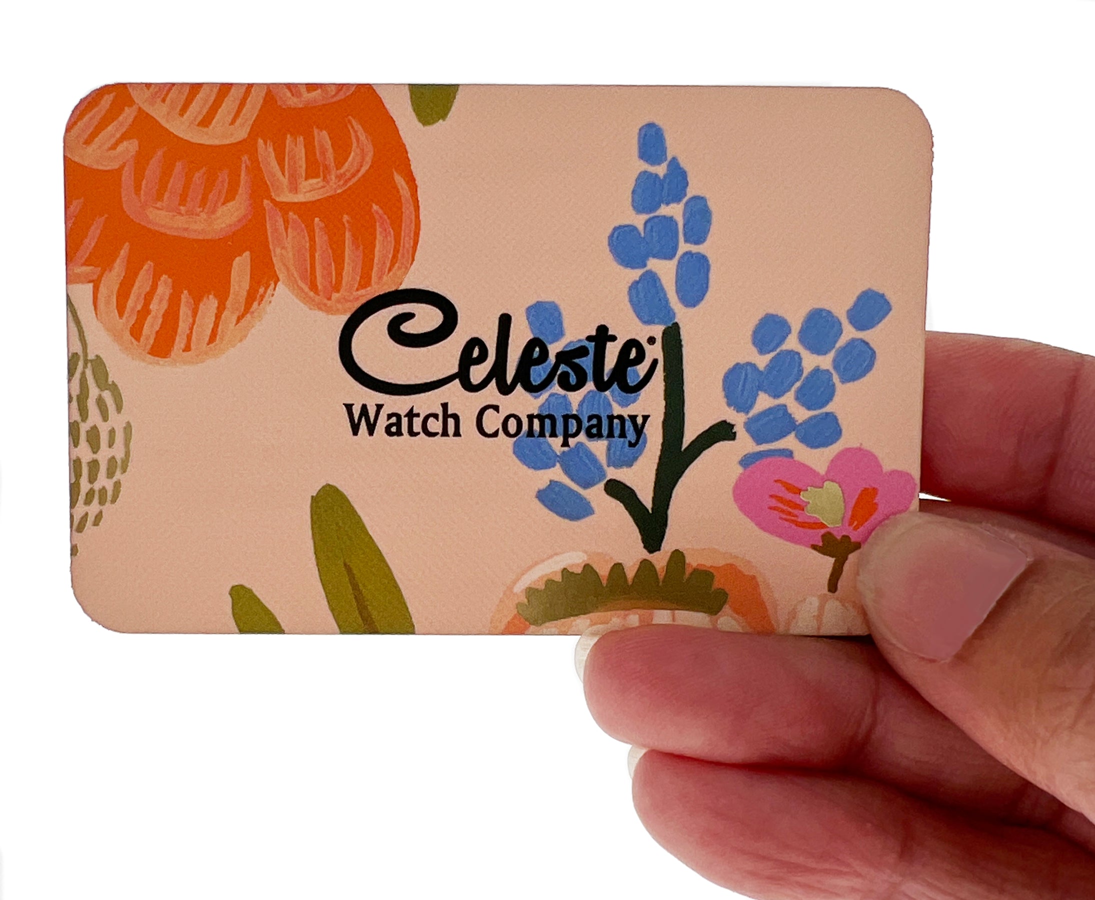 Cards can be used just like cash in our store. They are good for anything sold by Celeste Watch Company.