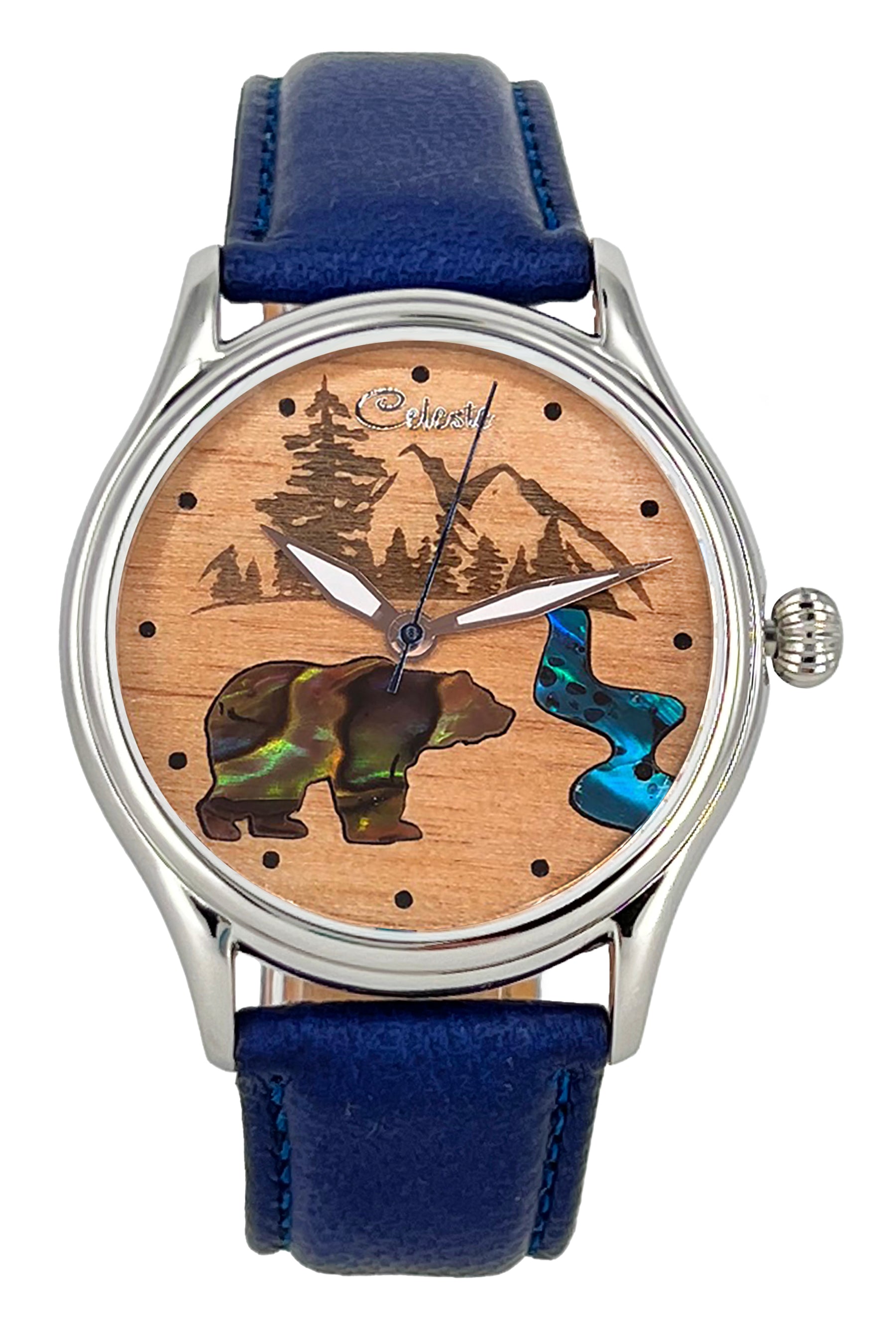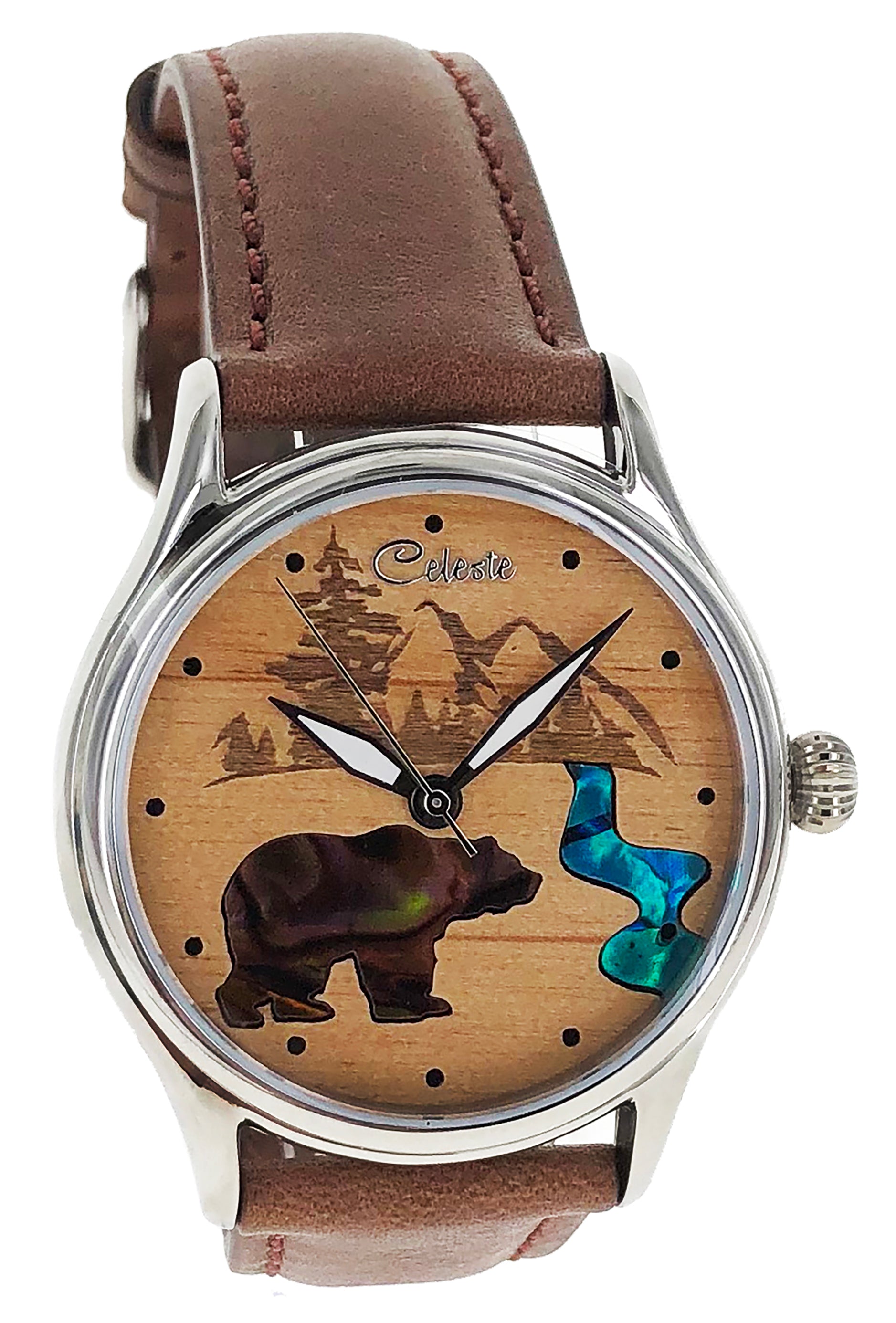 The bear symbol represents strength, family, vitality, courage and health. The bear is thoughtful and independent, with little need for fellowship. The bear is also self-contained and strong-willed in nature. This timepiece is designed to help you connect to those values and strengths within yourself. Down to Earth and suitable for everyday wear, yet dressy too, for your special occasions.