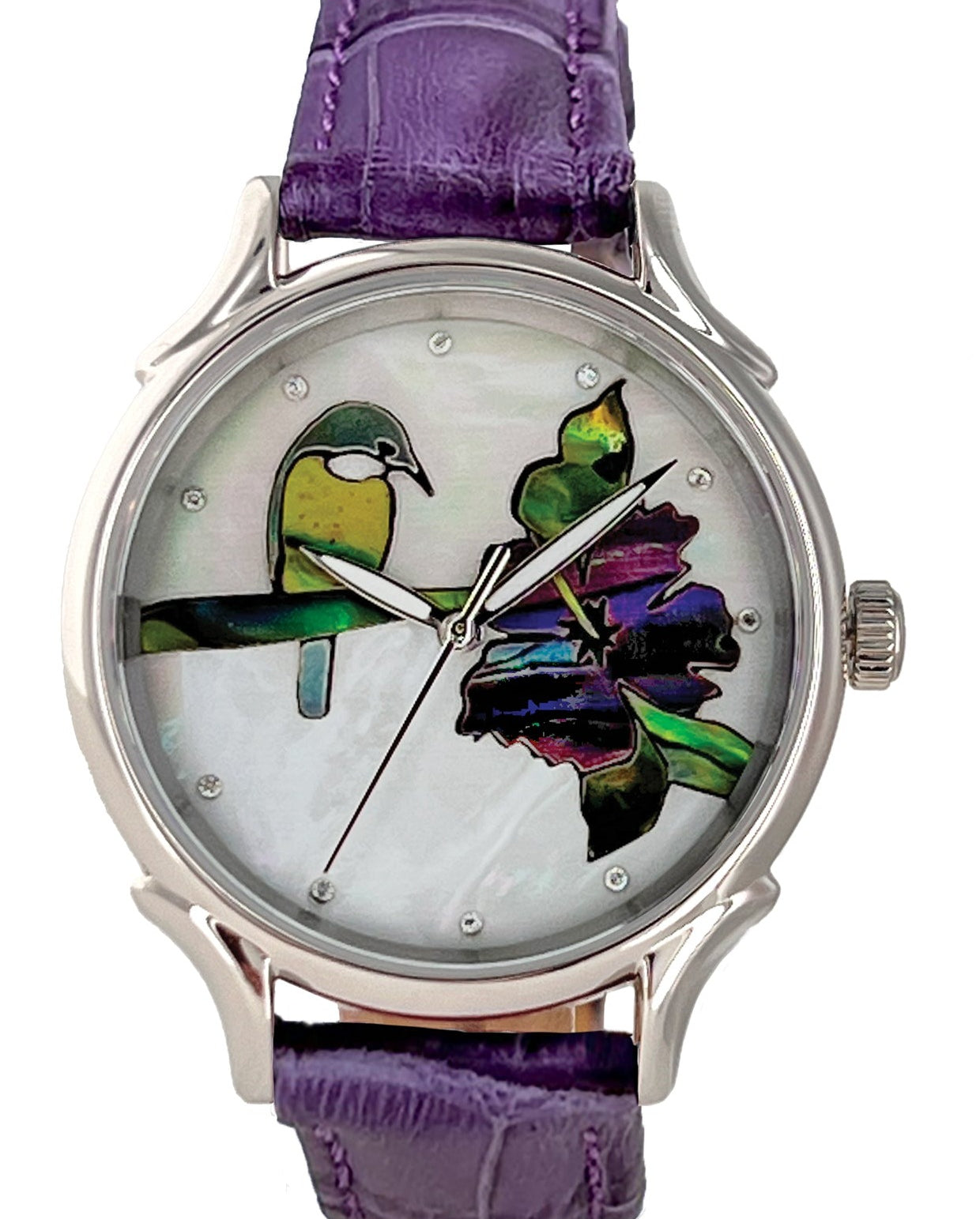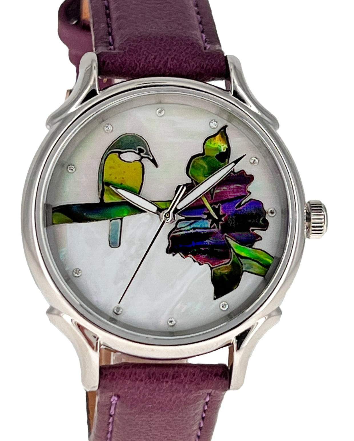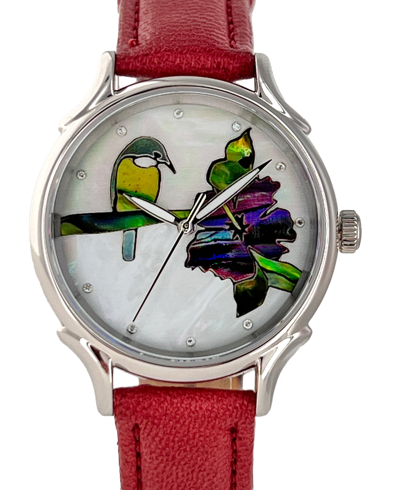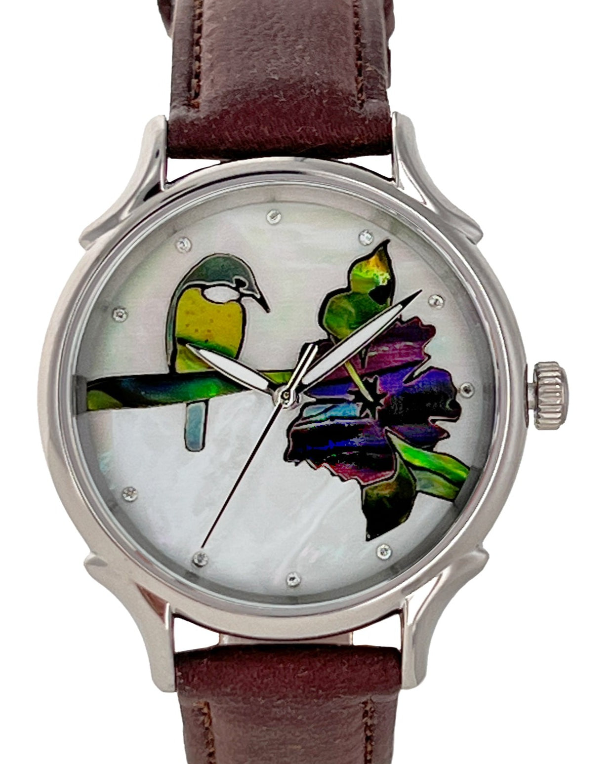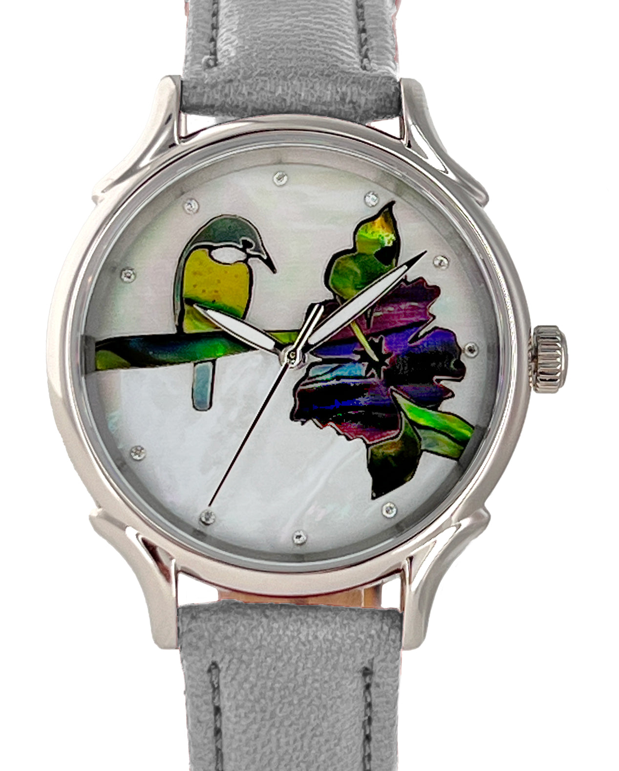 This collection explores many types of birds - their personalities, color, and character across sixteen distinct designs. Each watch is a handcrafted dial for depth or so light shifts and lifts the imagery from within the surface.
