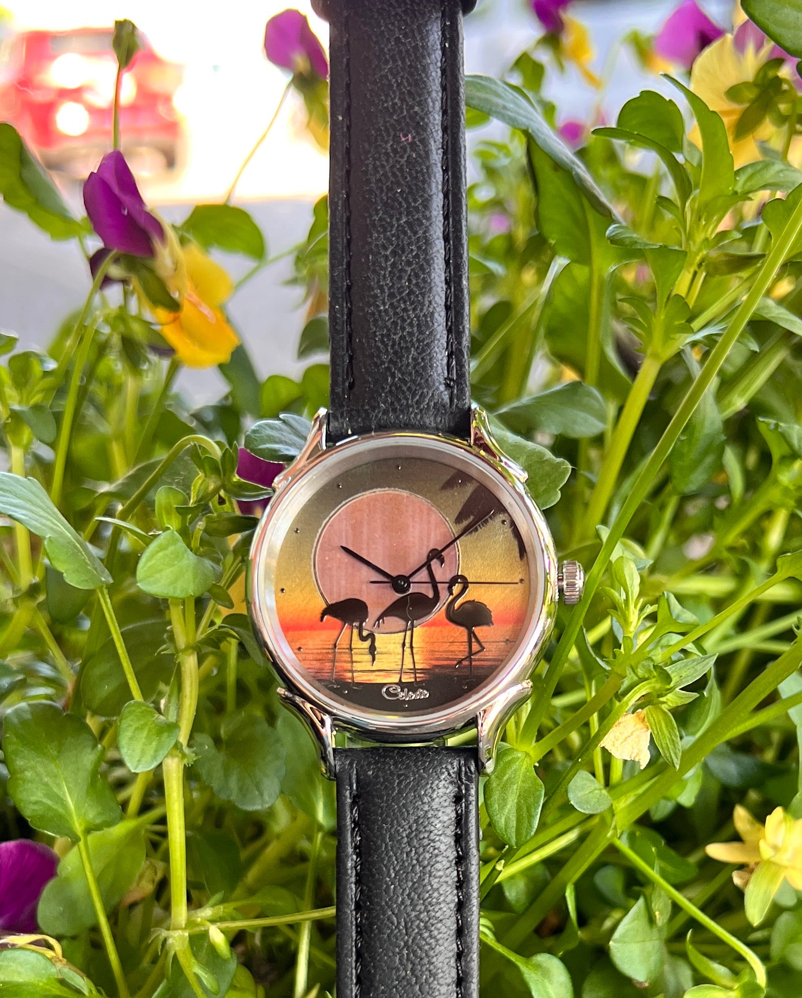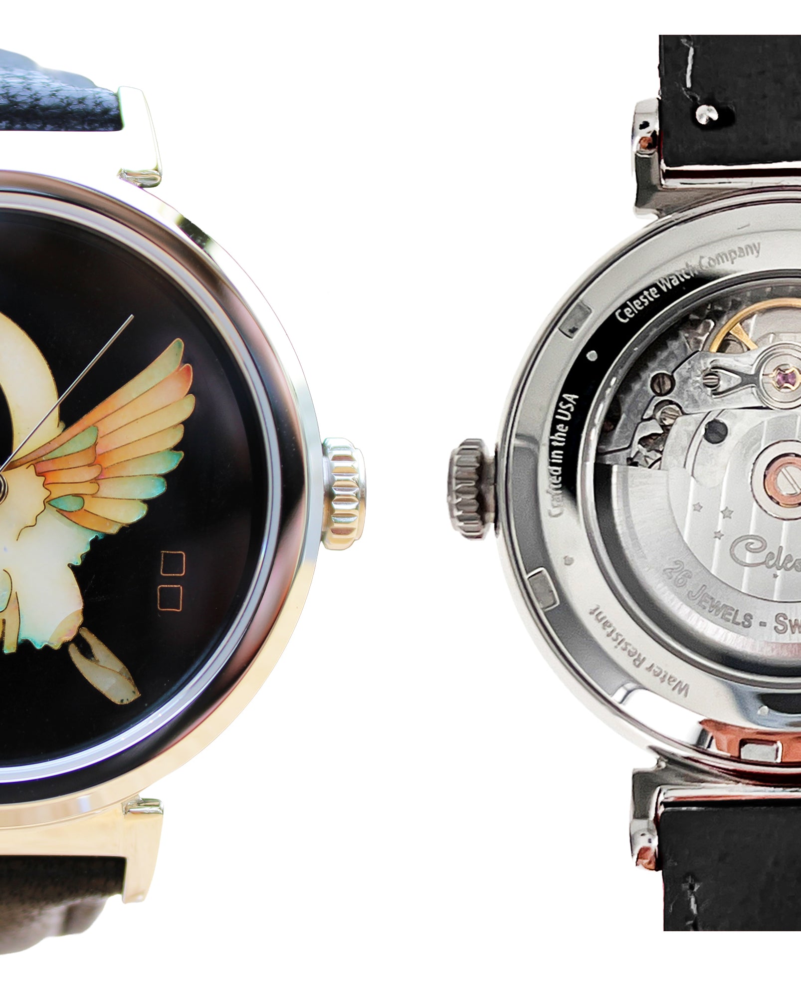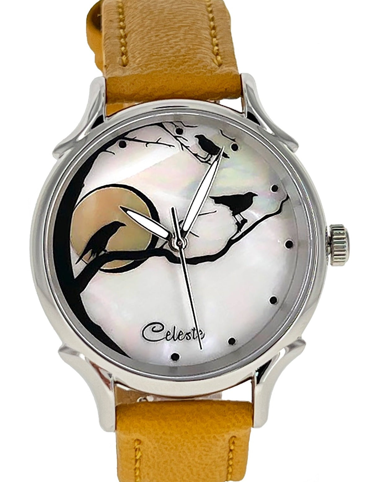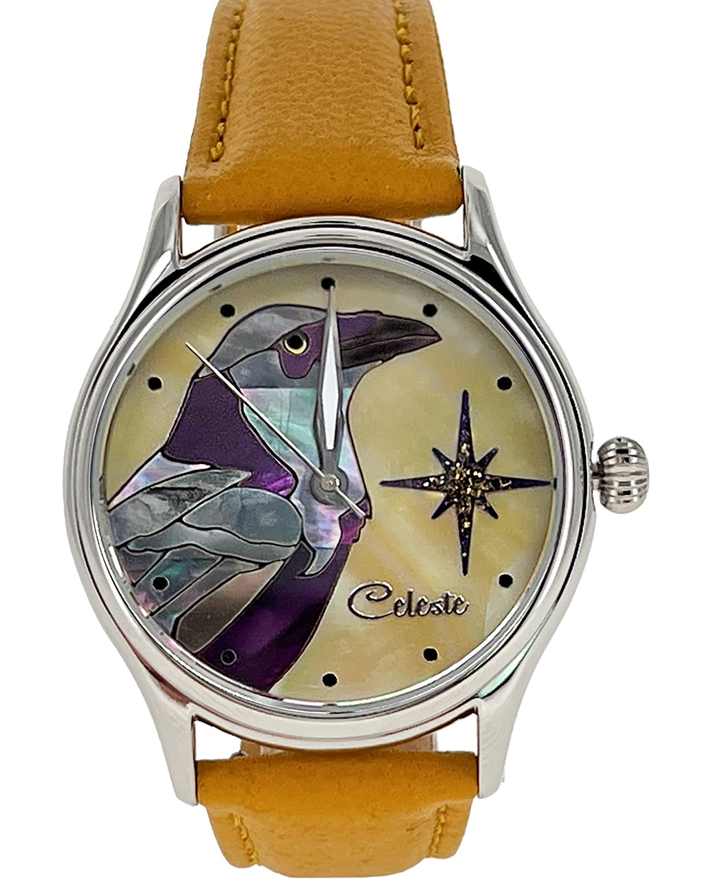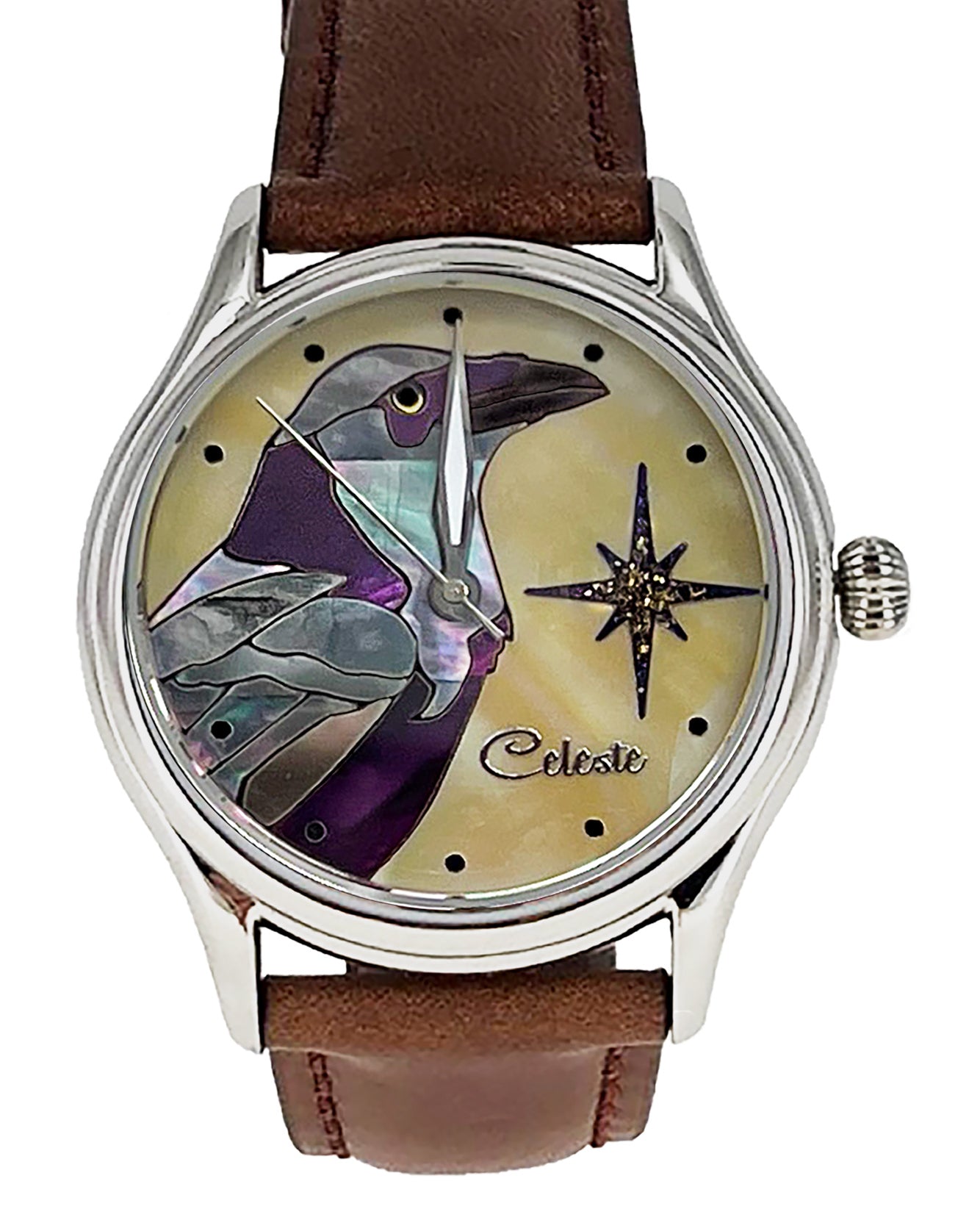 This collection explores many types of birds - their personalities, color, and character across sixteen distinct designs. Each watch is a handcrafted dial for depth or so light shifts and lifts the imagery from within the surface.
