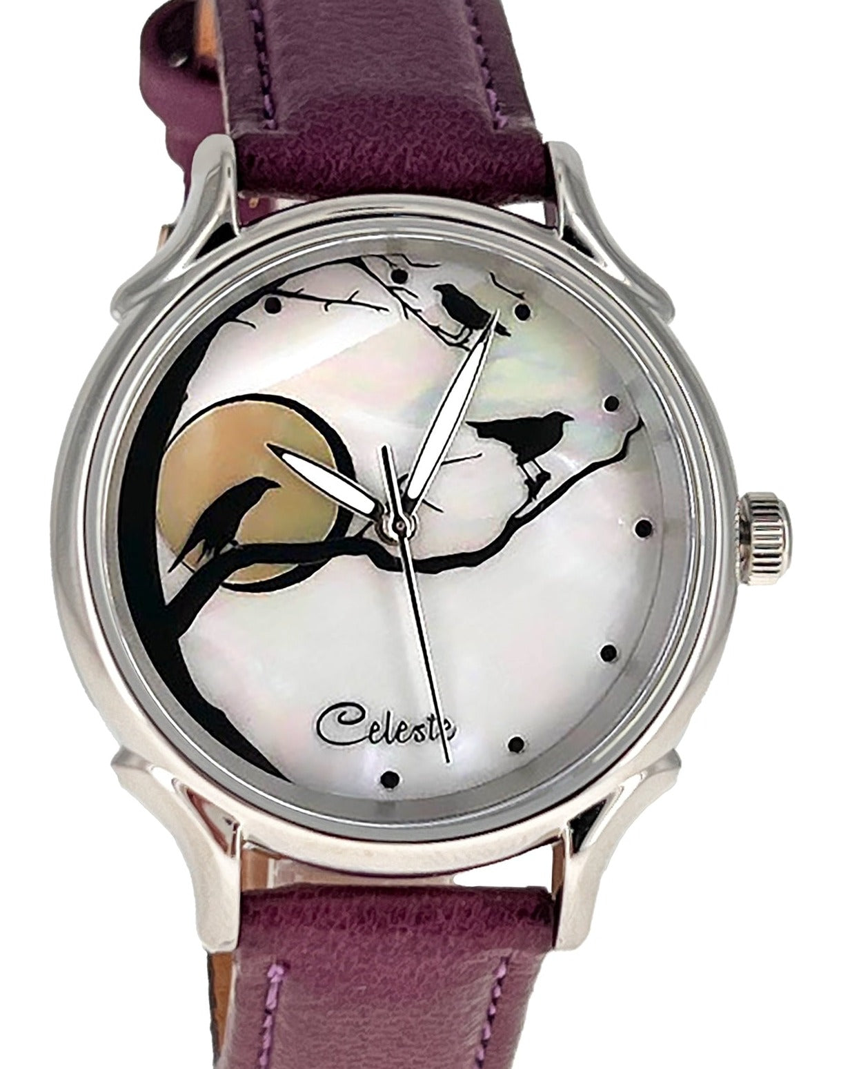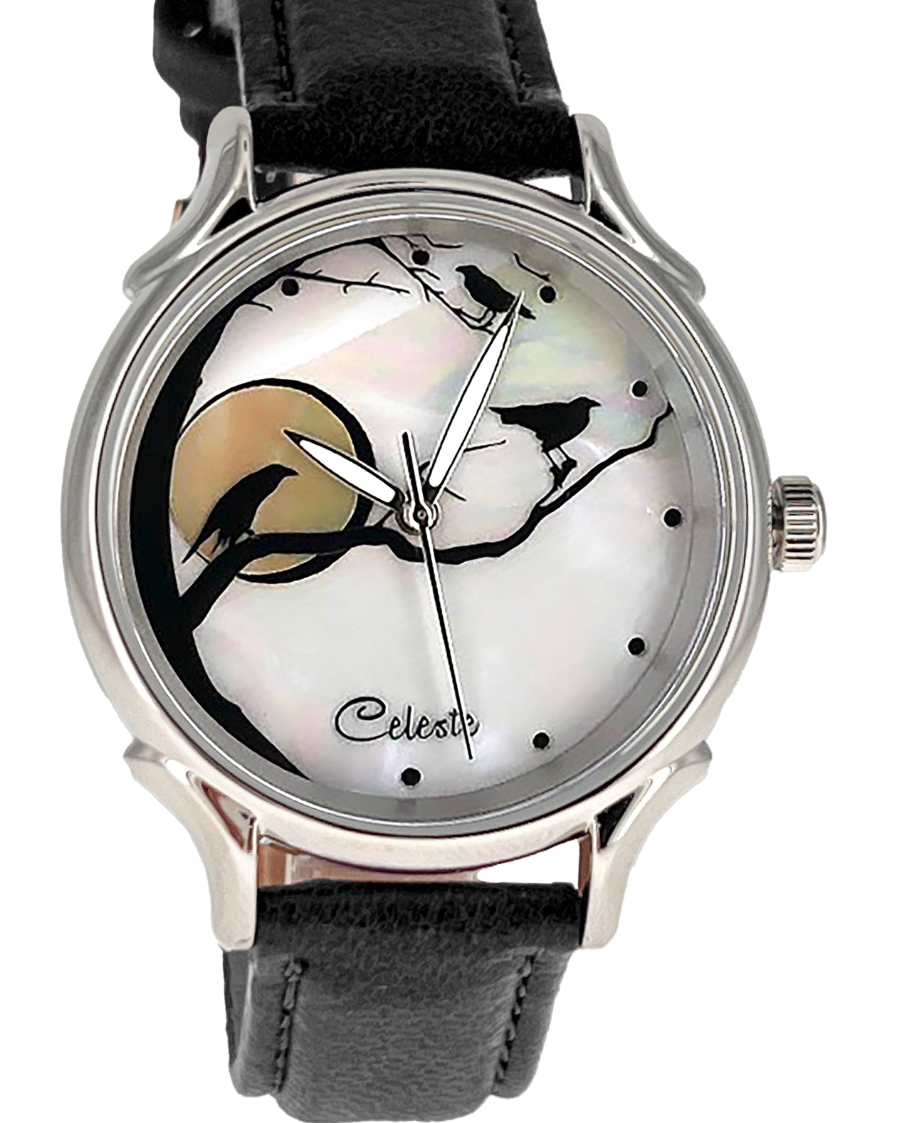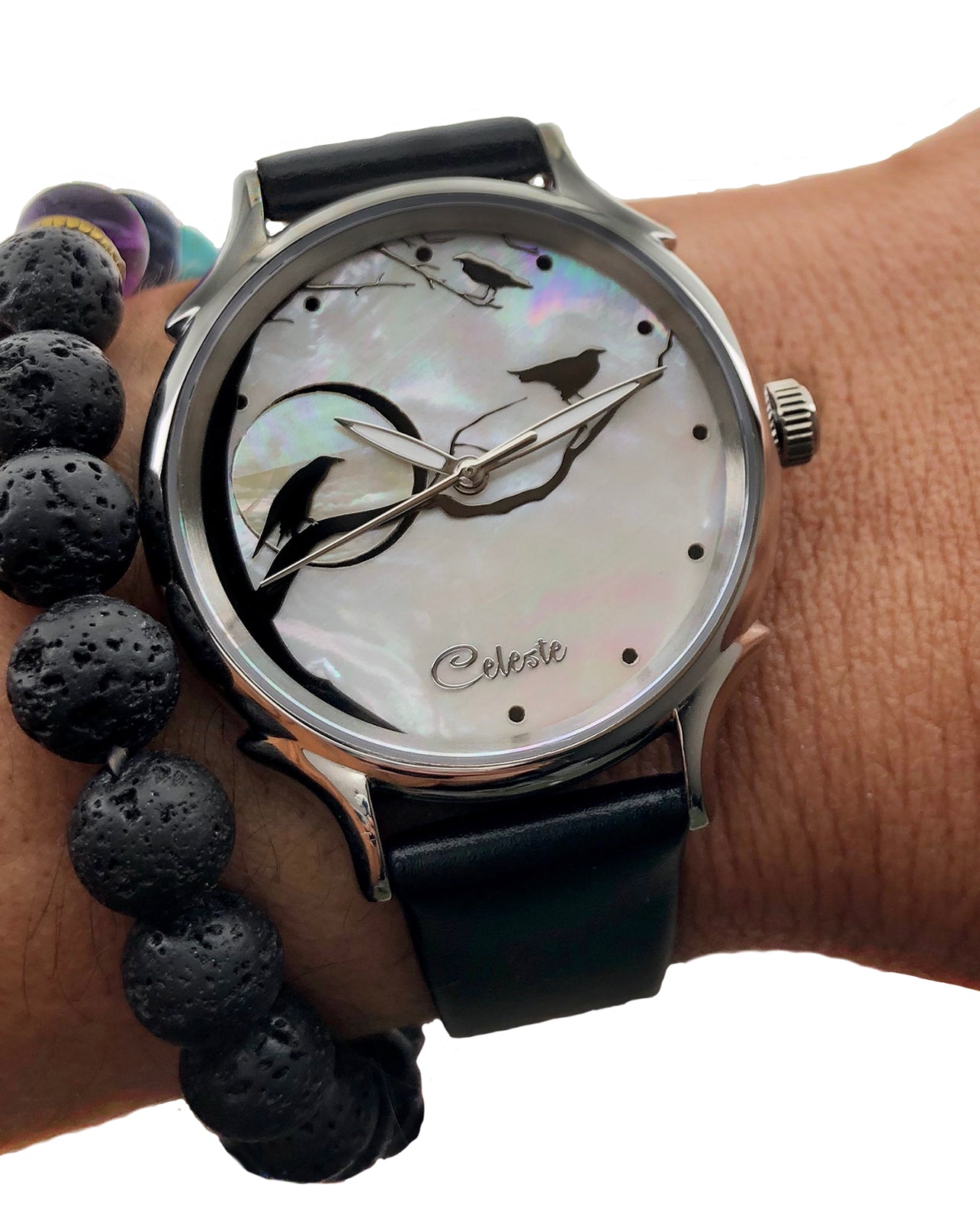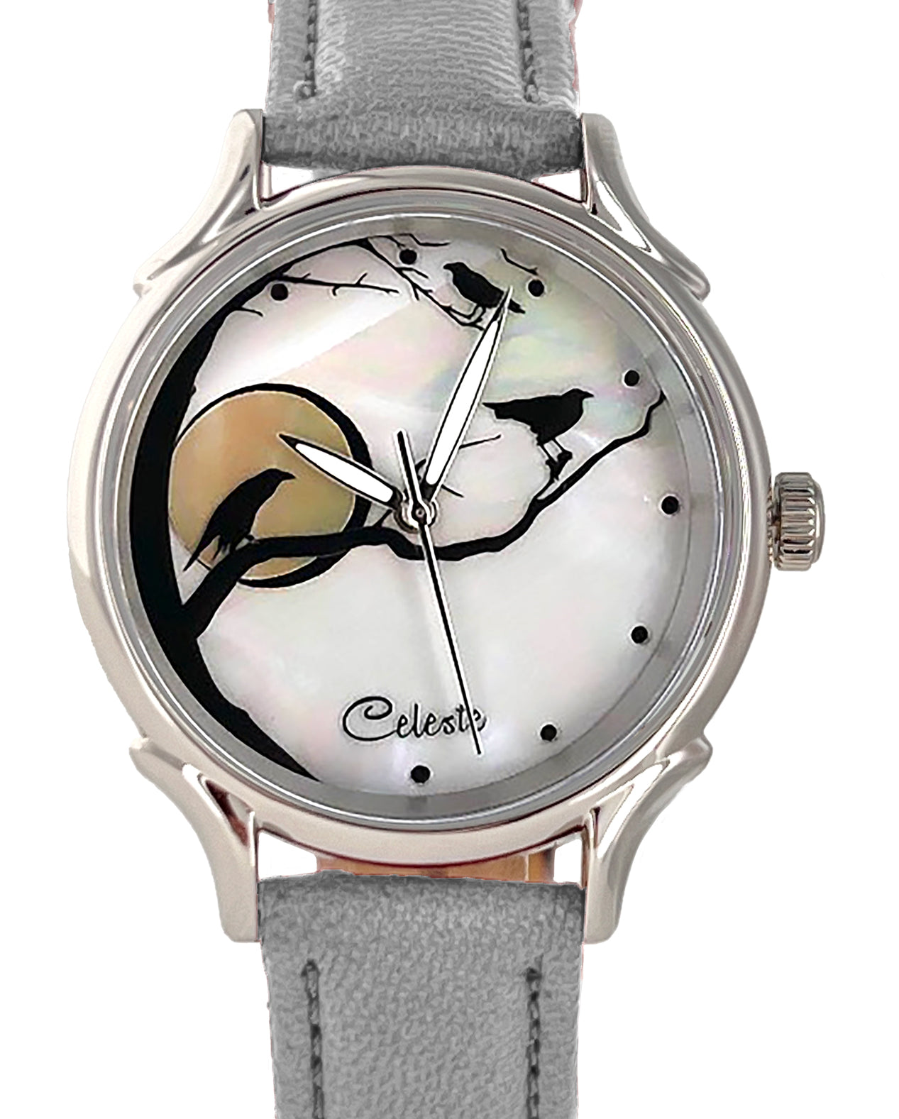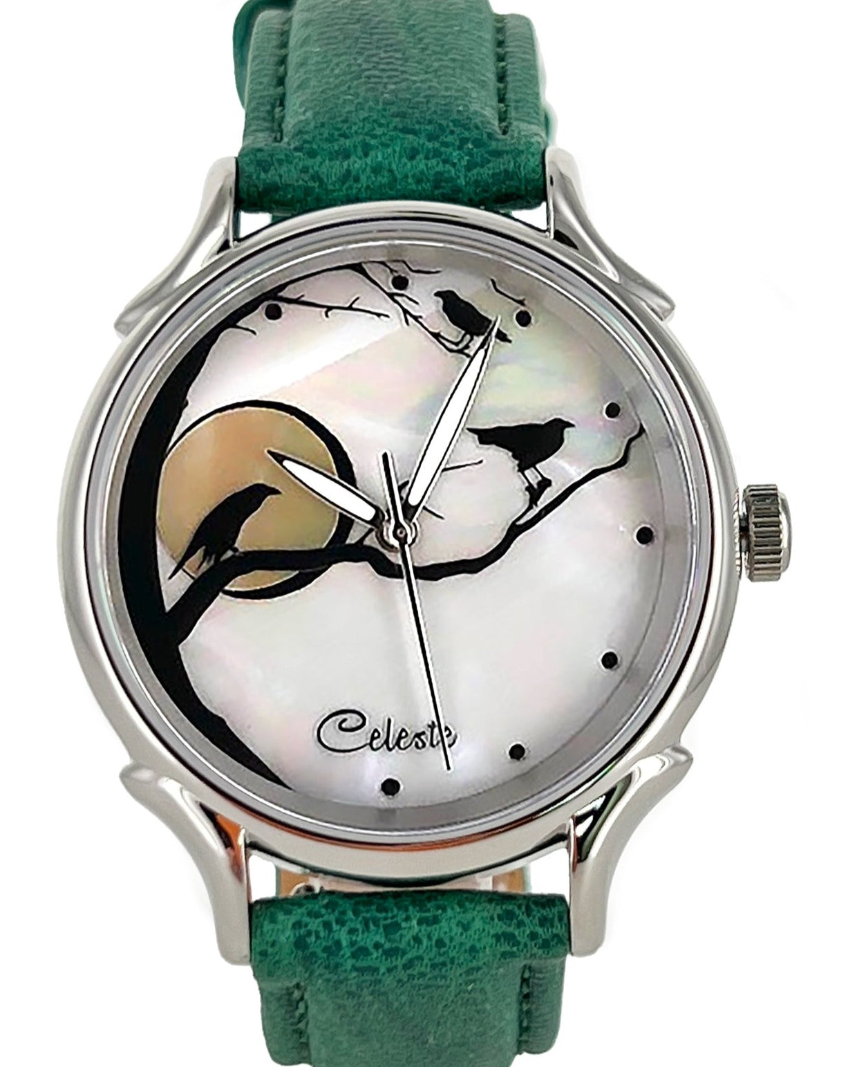 This collection explores many types of birds - their personalities, color, and character across sixteen distinct designs. Each watch is a handcrafted dial for depth or so light shifts and lifts the imagery from within the surface.