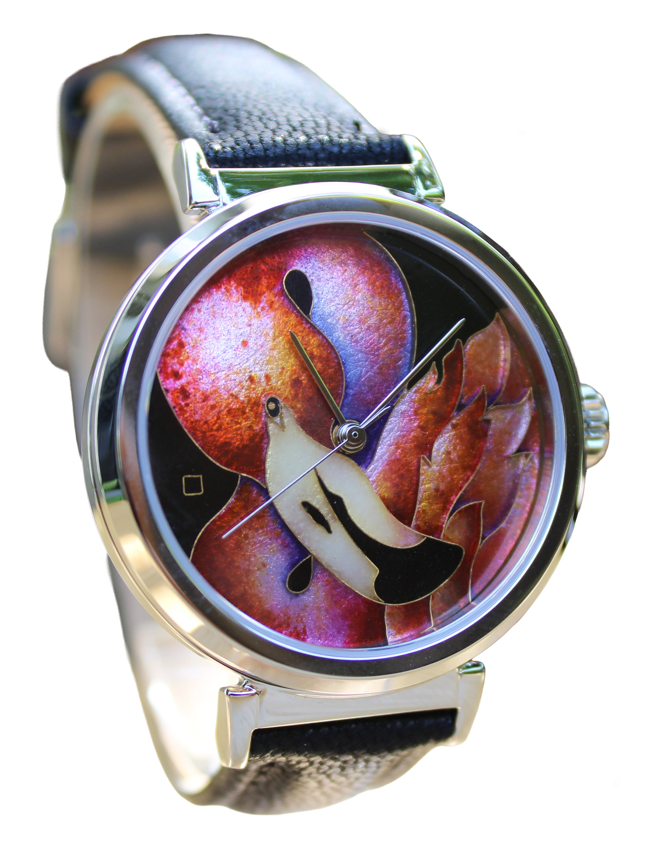 38mm Cloisonné Flaming Flamingo watch face, completely hand done by Merry-Lee Rae with 24K gold wirework.