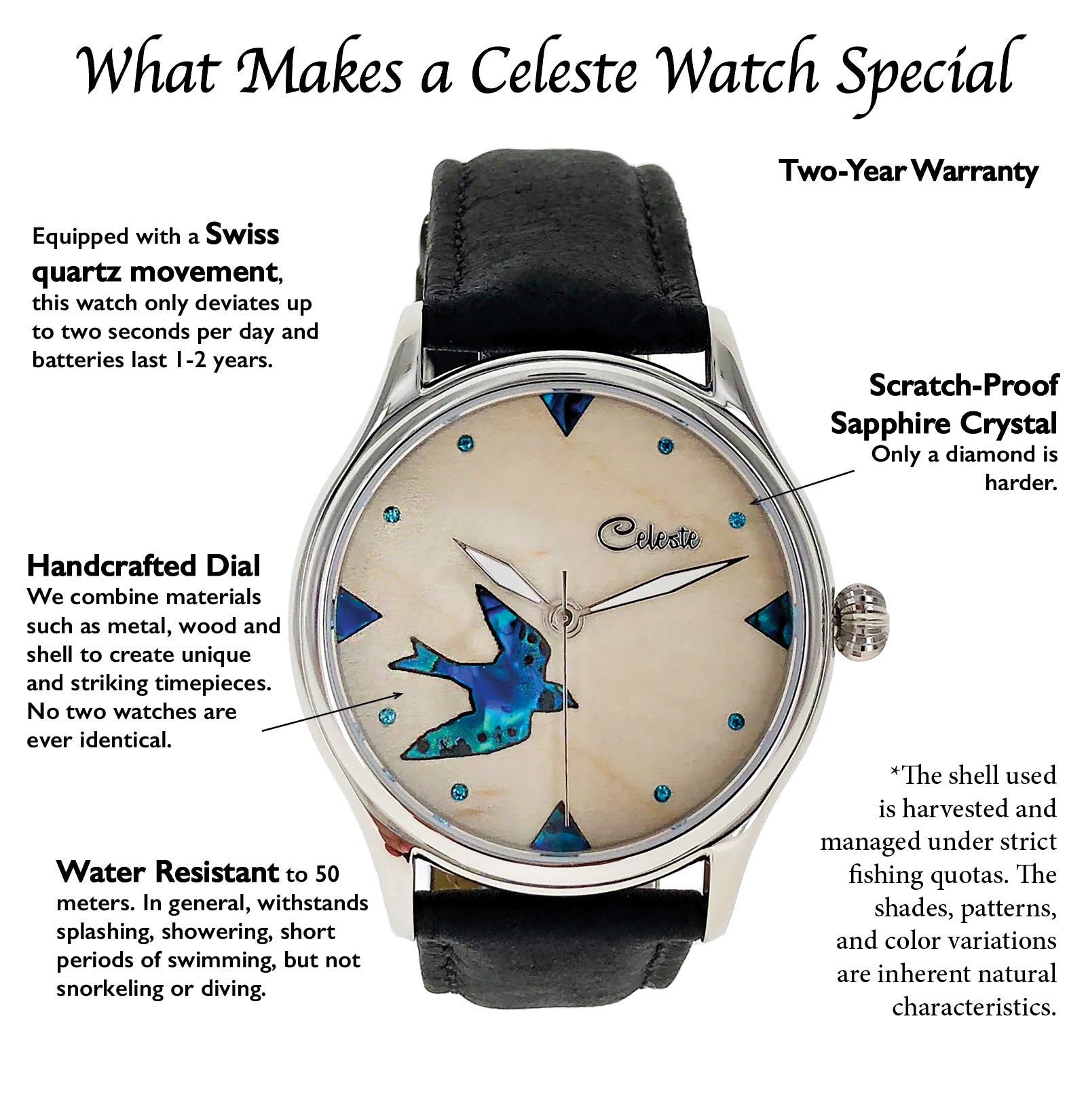 All Celeste watches come with a two-year warranty/guarantee in craftsmanship. This is Celeste's unwavering promise and at the heart of every watch.