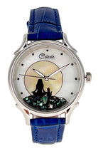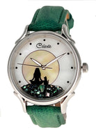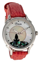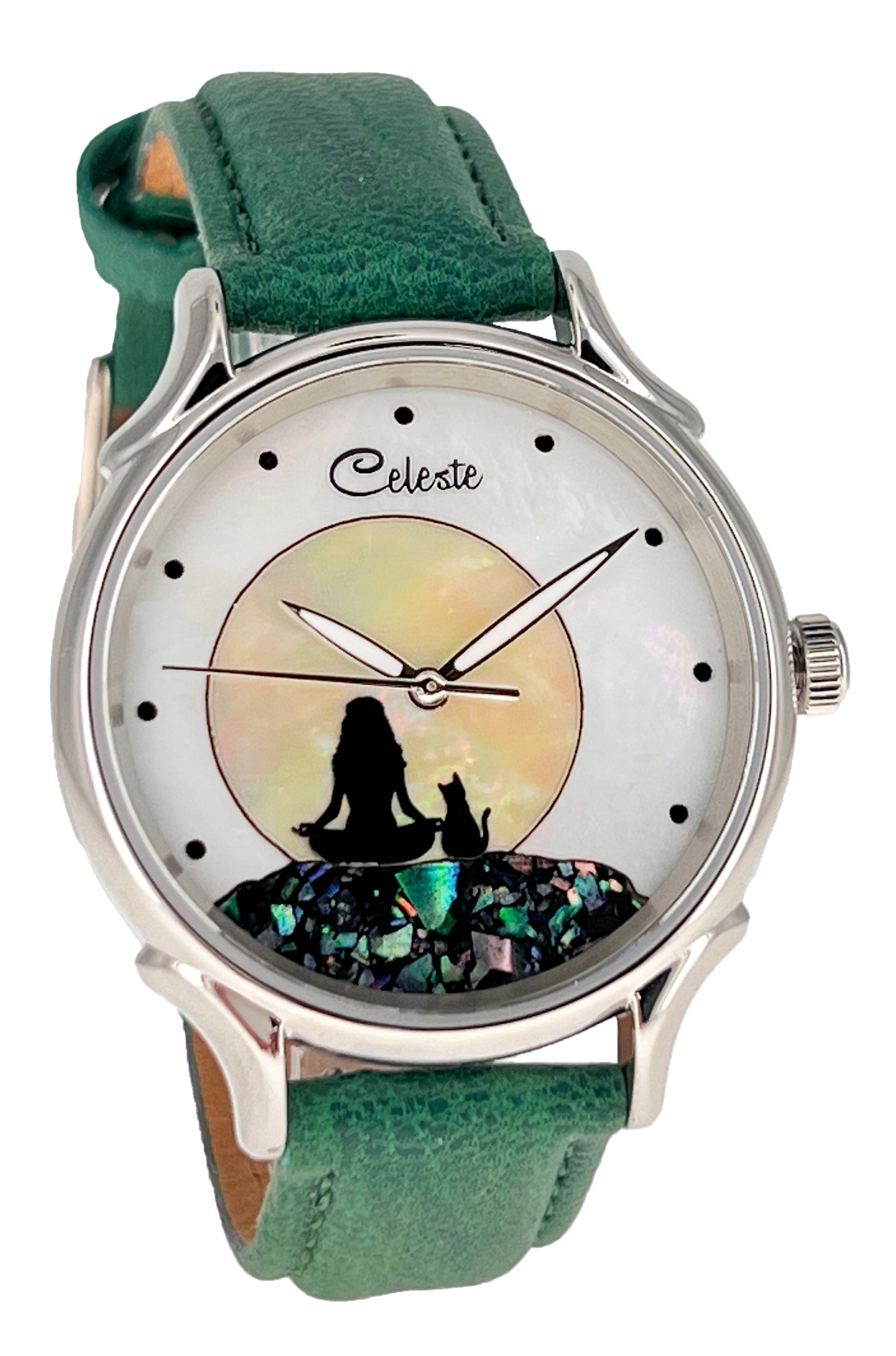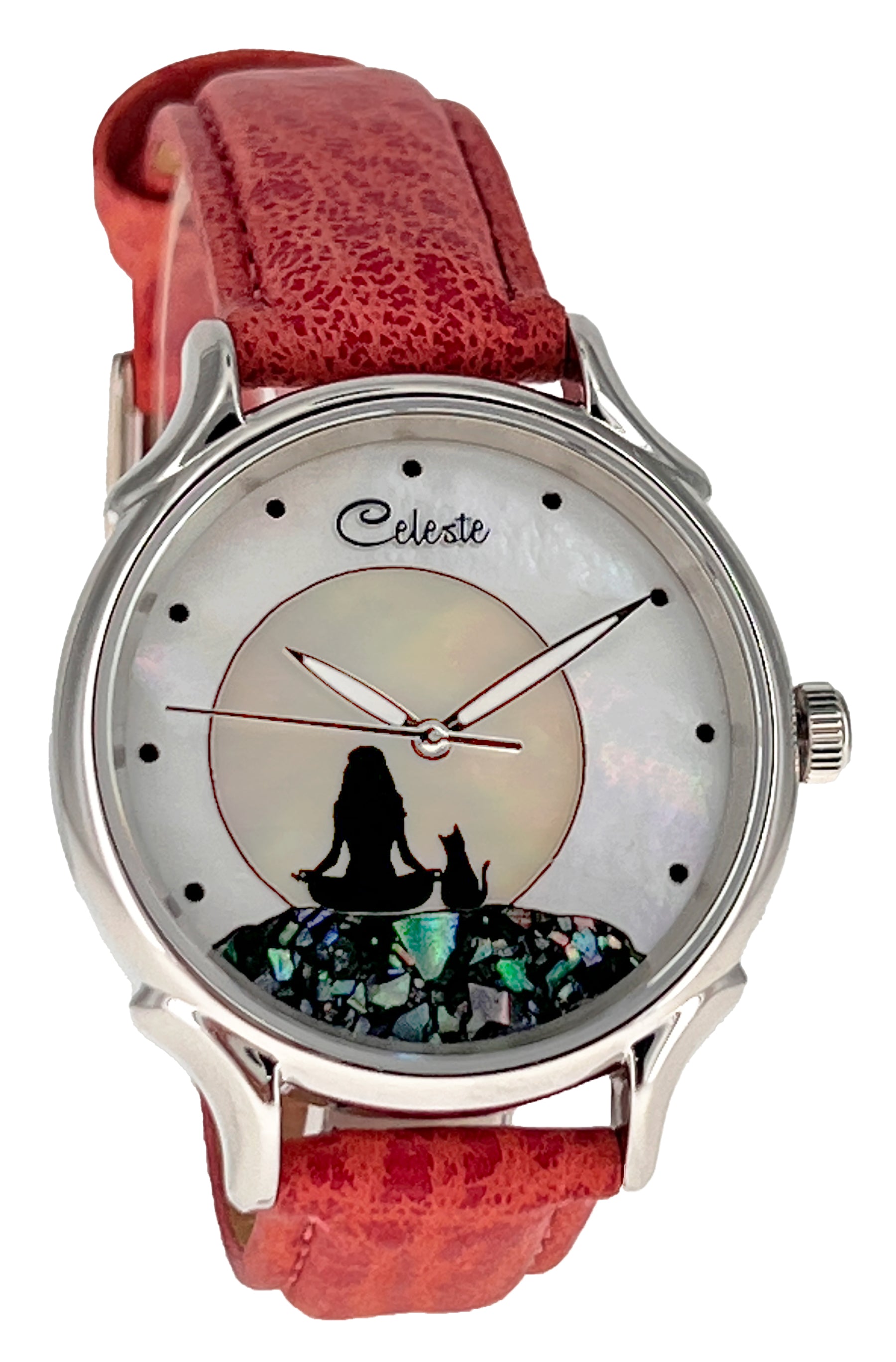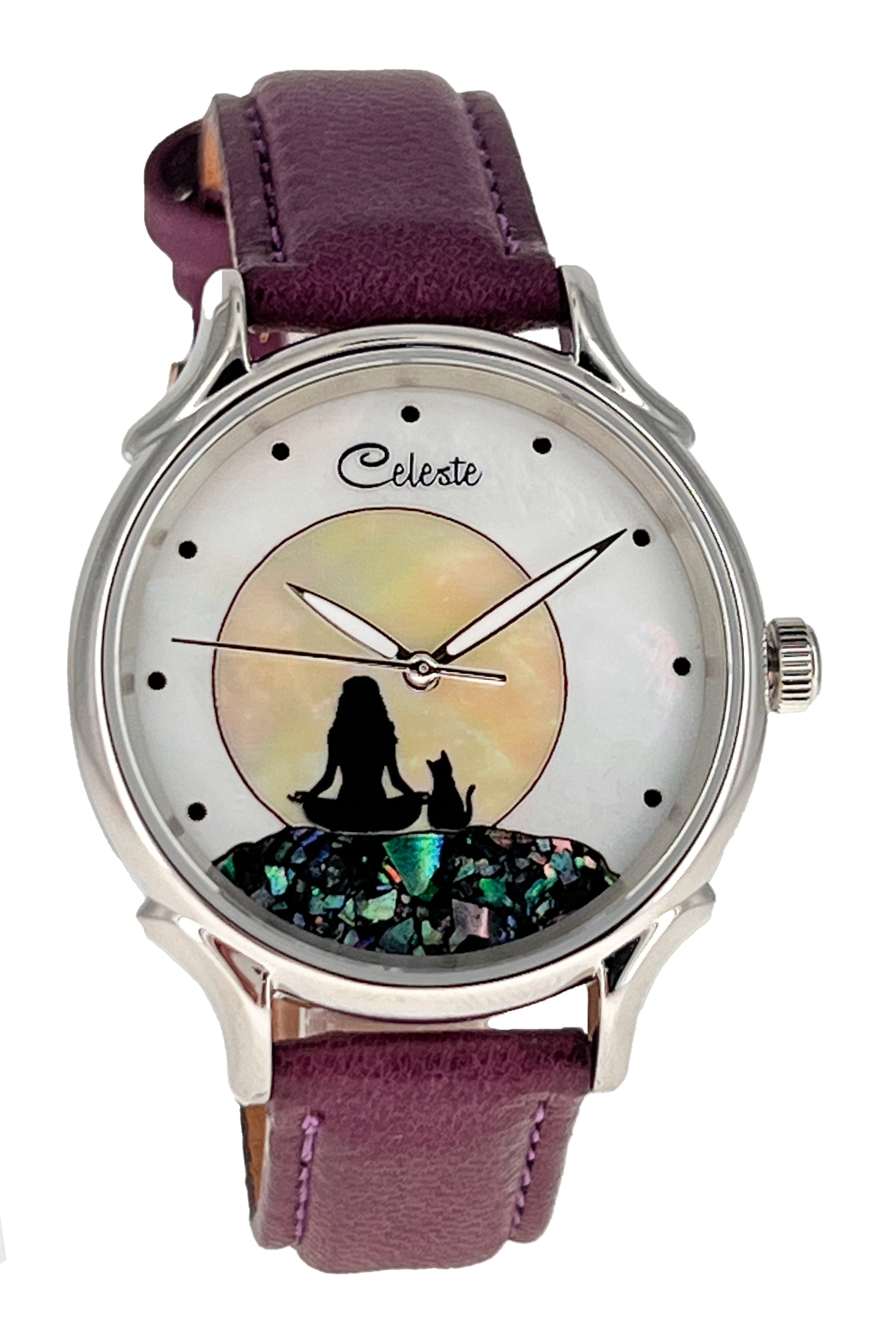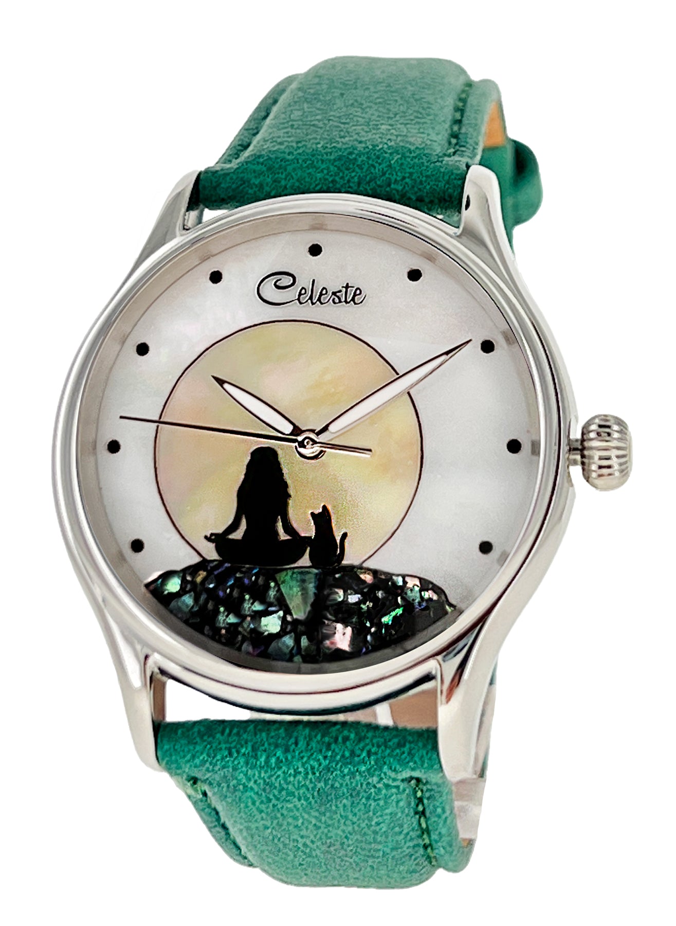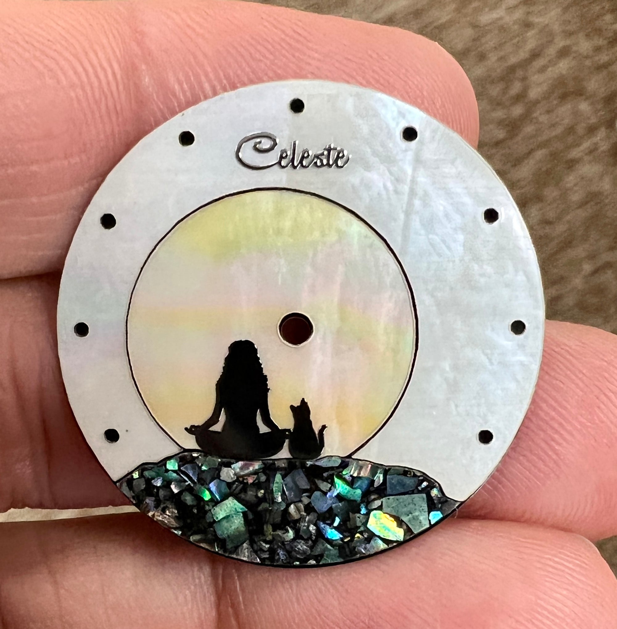 The iridescent and sparkly white shell on the dial is Mother of Pearl. Mother of Pearl can have hues of purple, pink and green within it. The most common shimmery color is pink but shell is an organic material so the variation in shades is impossible to predict. The moon inside the Mother of Pearl is golden Mother of Pearl and the rock that the woman and cat are sitting on is mosaic abalone which is colorful pieces of abalone pressed into a sheet. The woman and cat companion are cut from metal and overlaid on the golden Mother of Pearl moon.