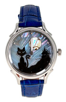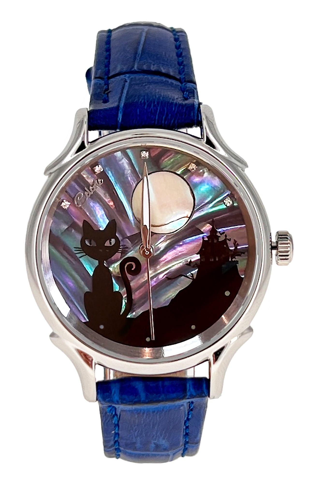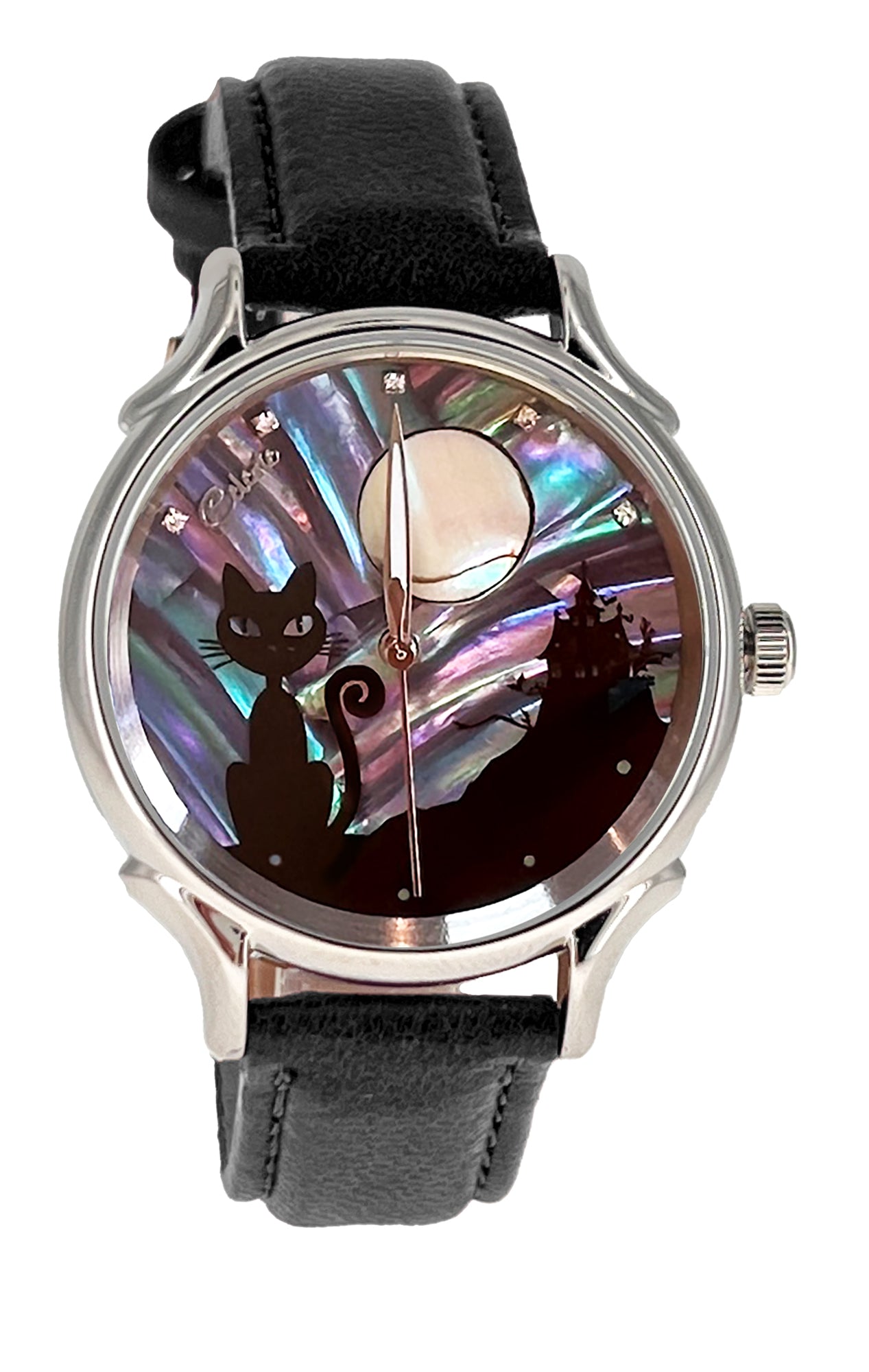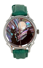 Handcrafted with care and a touch of mischief, this dial shimmers like a night under the Northern Lights. The sky is Japanese Awabi abalone, glowing with color and movement. A bright green abalone moon casts its light over the curious cat and haunted house, both gleaming in metal overlay. Five sparkling CZ stars twinkle from 10 to 2, completing this magical midnight scene, where every cat feels right at home.