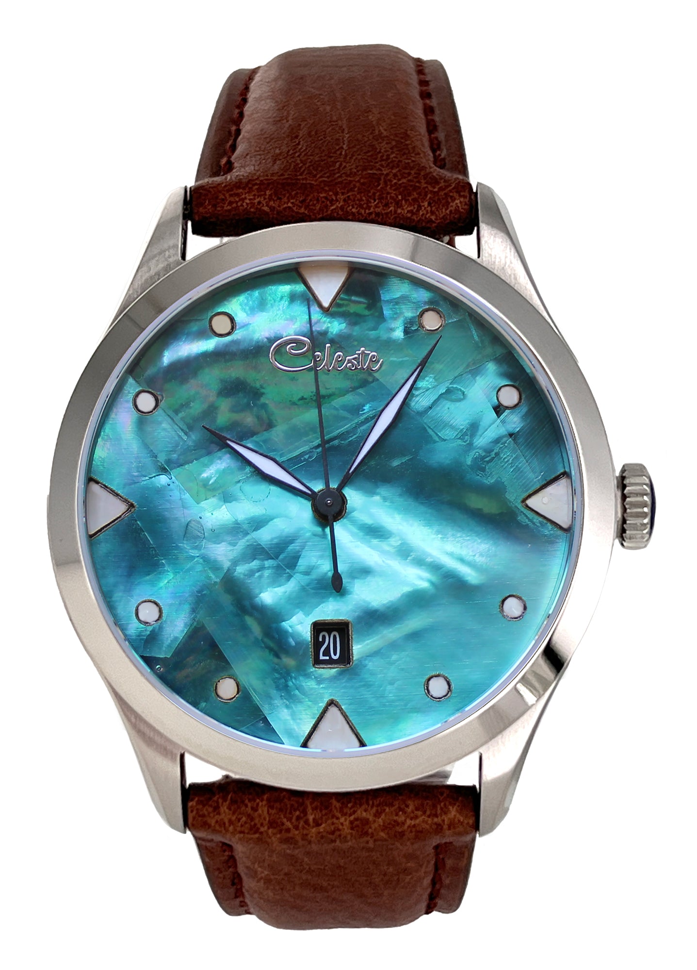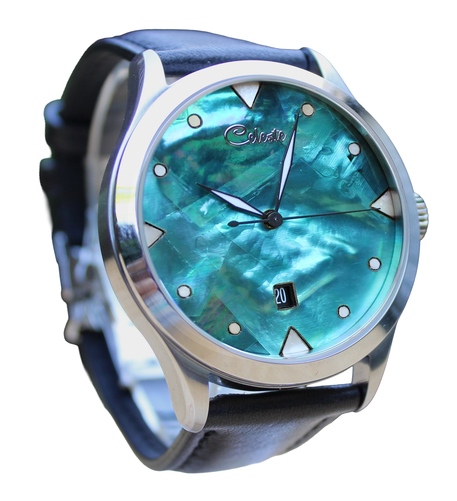 Our handcrafted dials transform natural abalone and mother of pearl shells into liquid color of shimmering blues, teals, and greens that shift like sunlight beneath the waves.