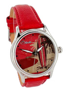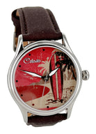 In this new style of watch dial art, the image of the surfboard and beach is transferred directly onto maple wood. Done in a retro style, this special watch reminds us to seize the day and follow our bliss.