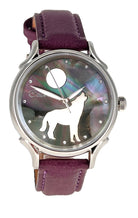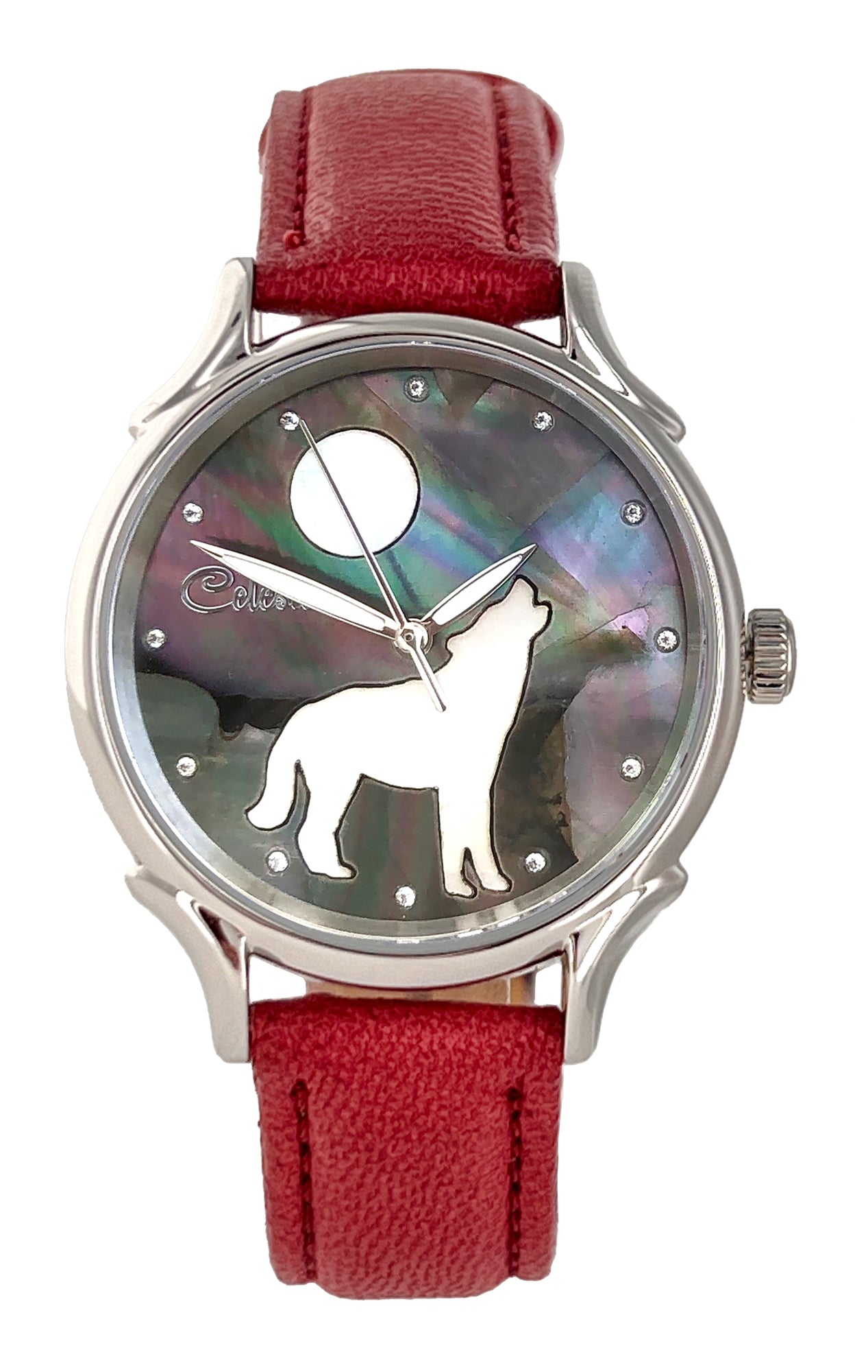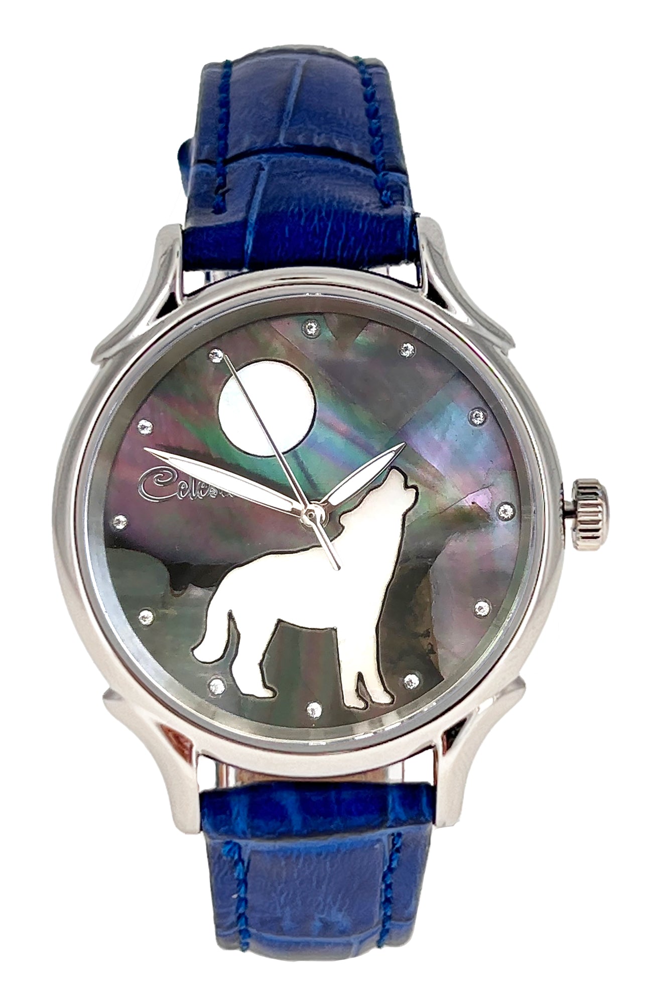 In this dial, a mother of pearl wolf and moon are surrounded by an iridescent Tahitian black-lip abalone sky. With hues of turquoise, purple, pink and blue the CZ stone time markers light-up the night and serve as twinkling stars in the sky all around the dial.