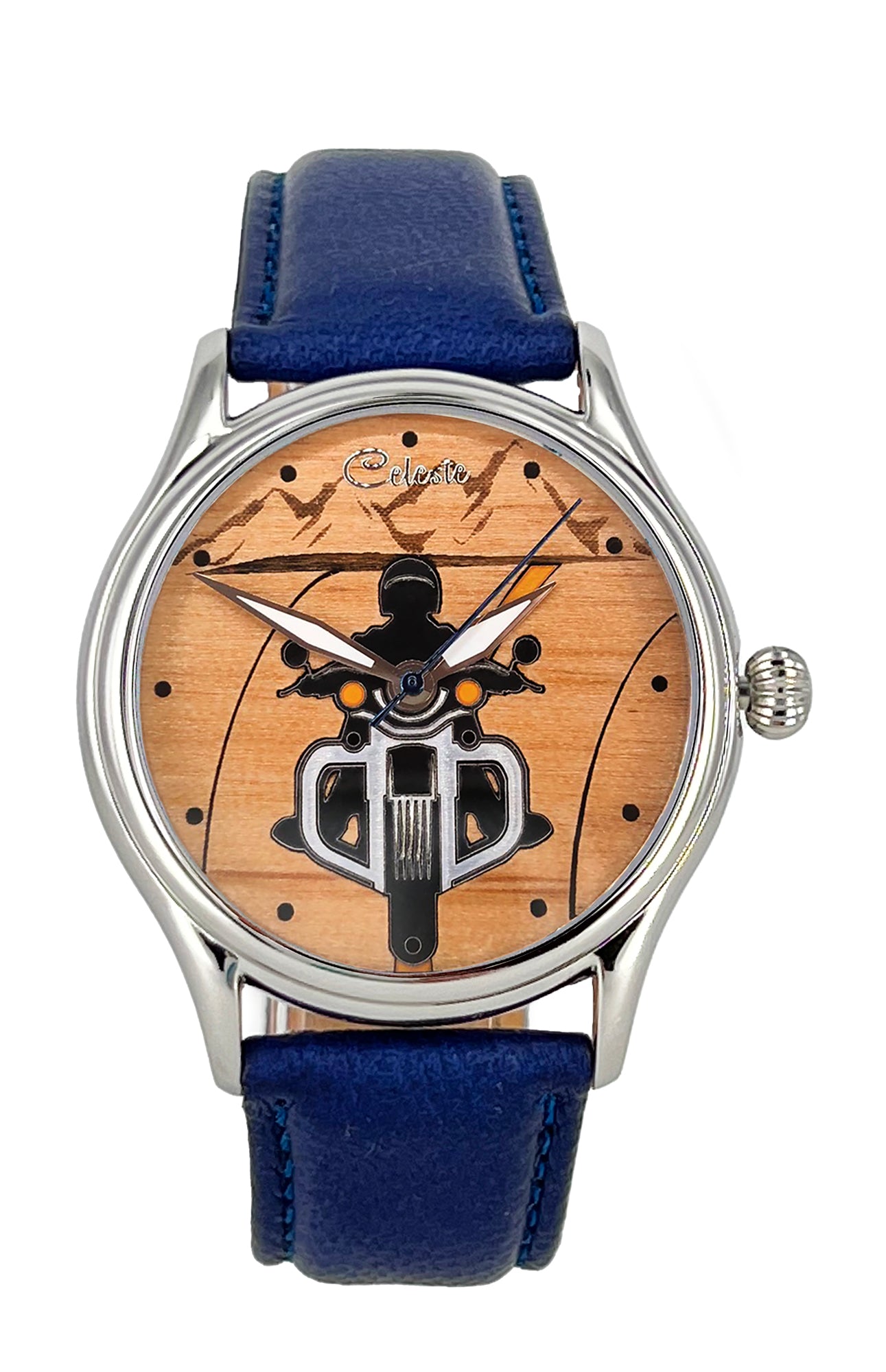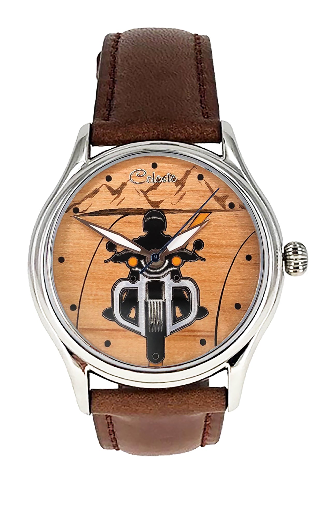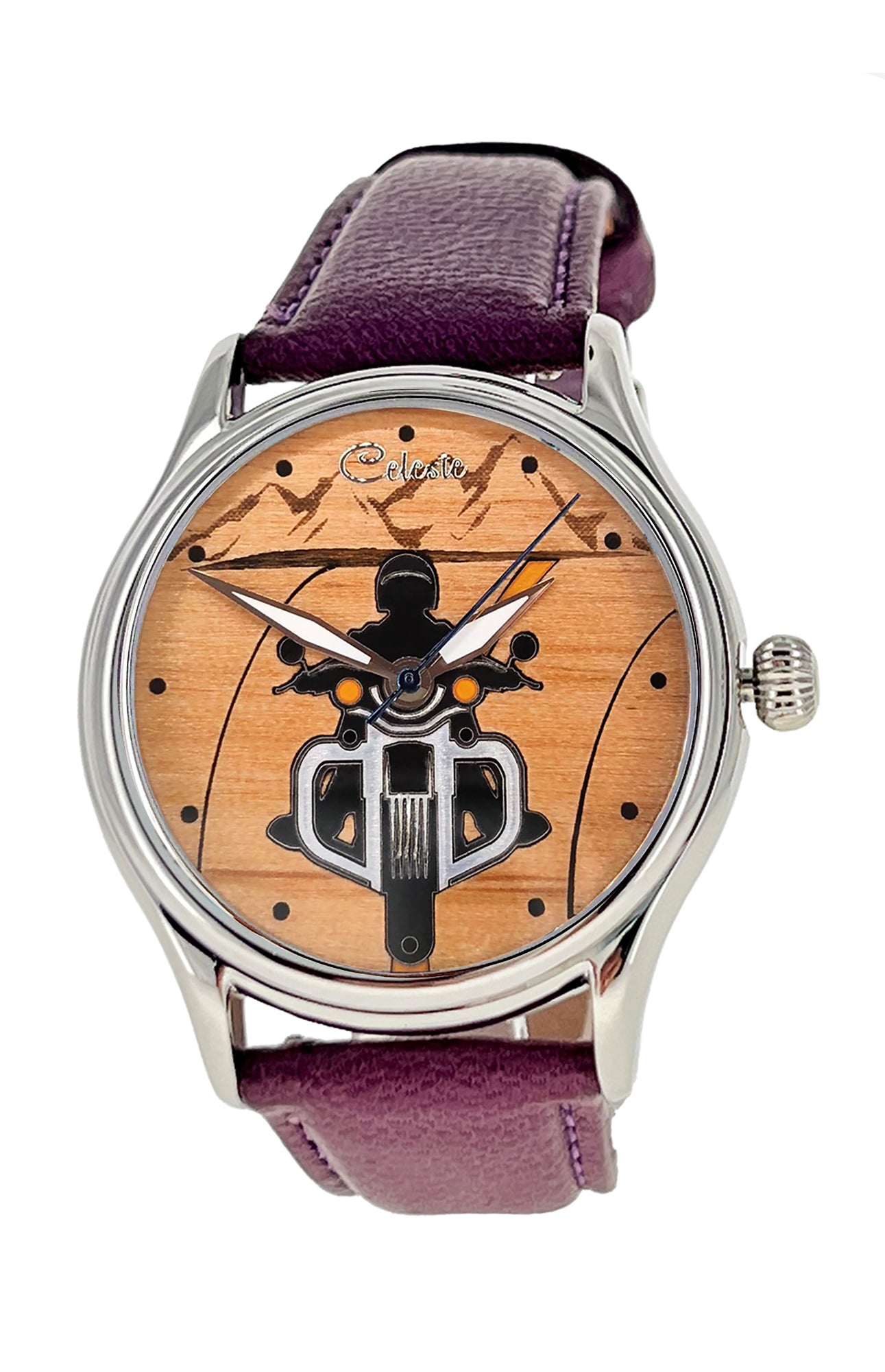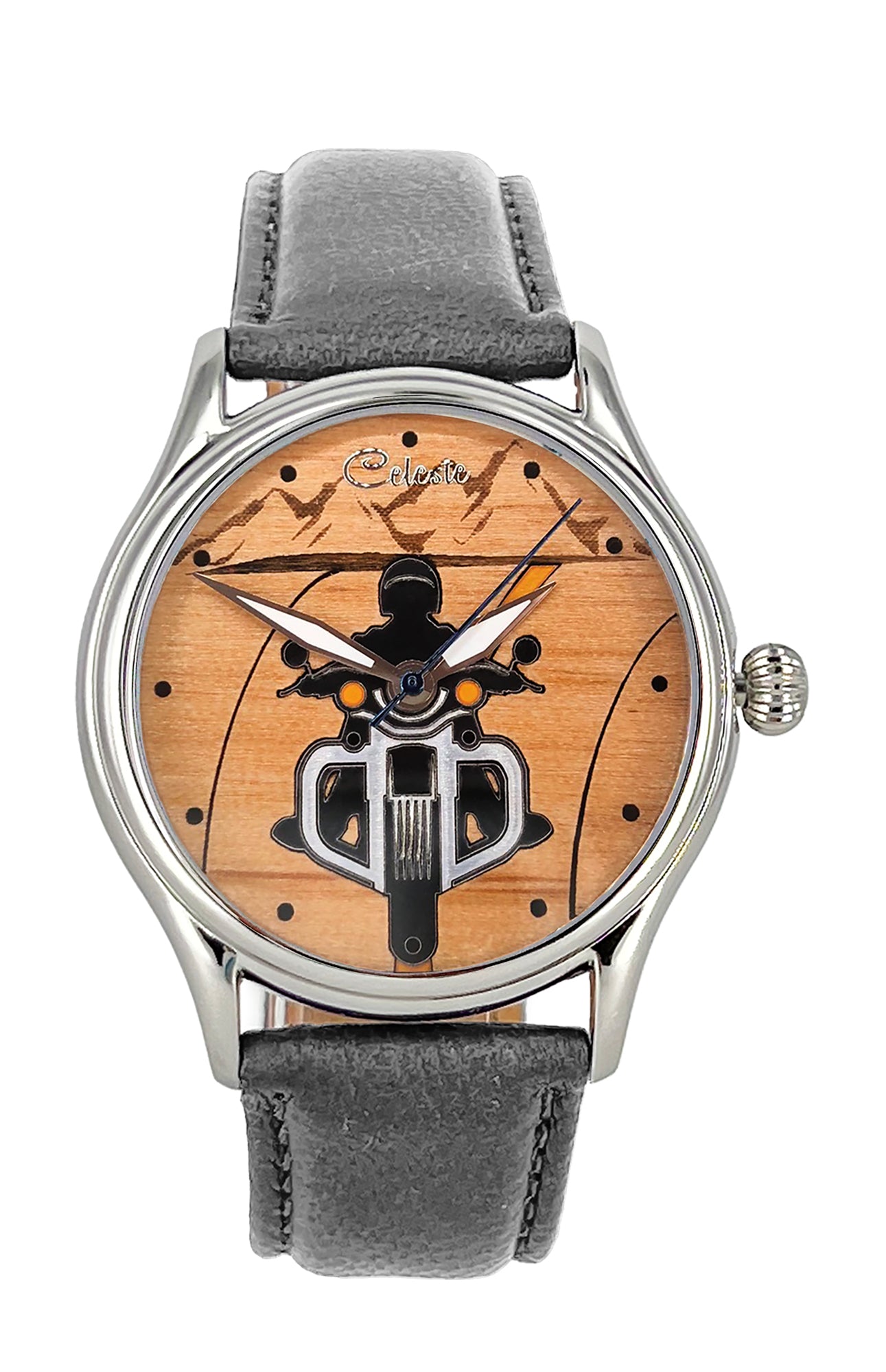 Skillfully crafted, the motorcycle, road and man are anodized aluminum inlaid in alder wood with mountains engraved in the background.