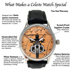 - Every Celeste watch comes with its very own travel friendly case! Perfect for storage and shipping, your watch is snuggly nestled in plush felt, protected from drops, knocks, and bangs.