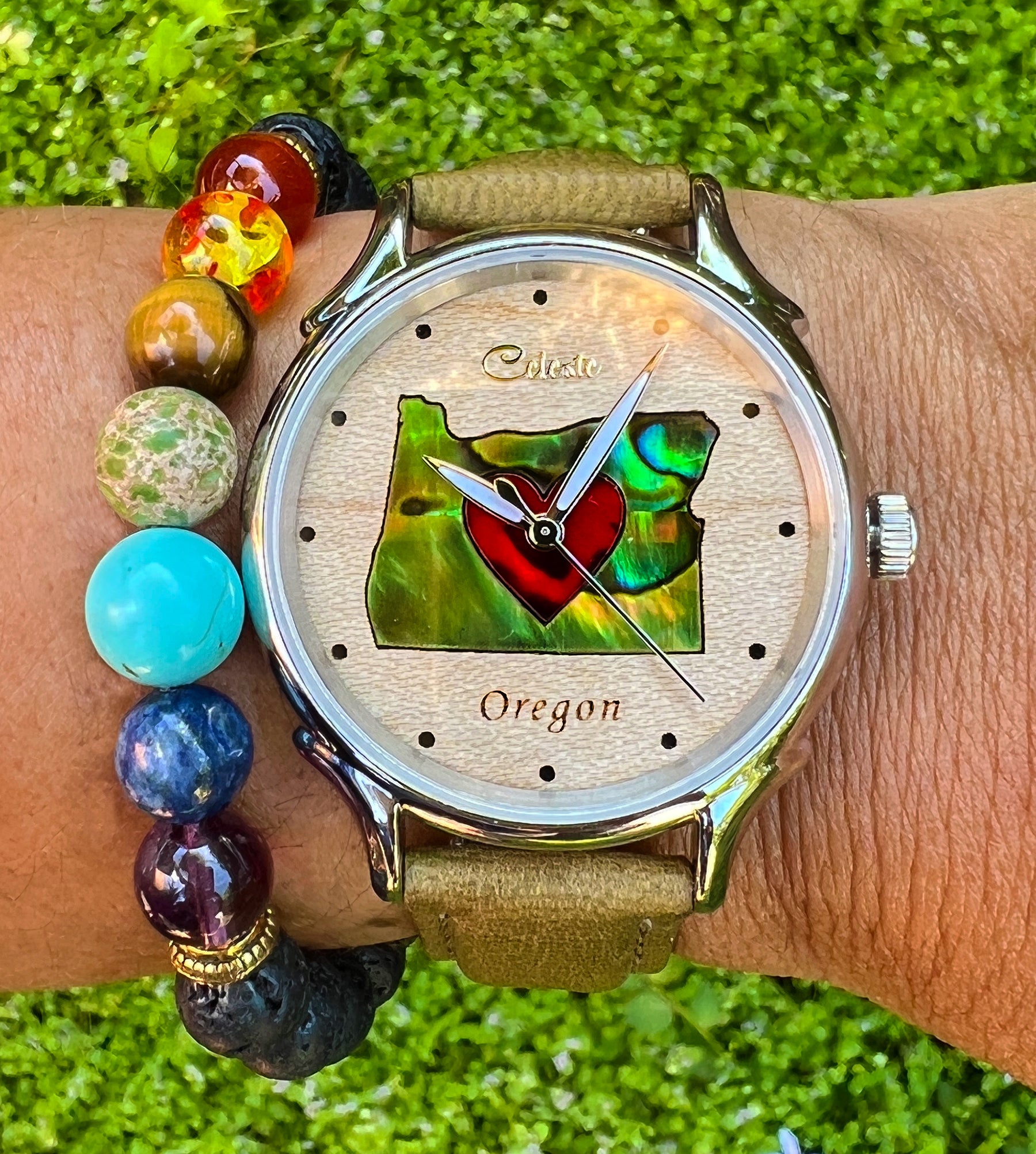 This dial is a red abalone heart inlaid in an olive abalone Oregon state. The Oregon state is then inlaid in alder or maple woods with "Oregon" engraved at the bottom.