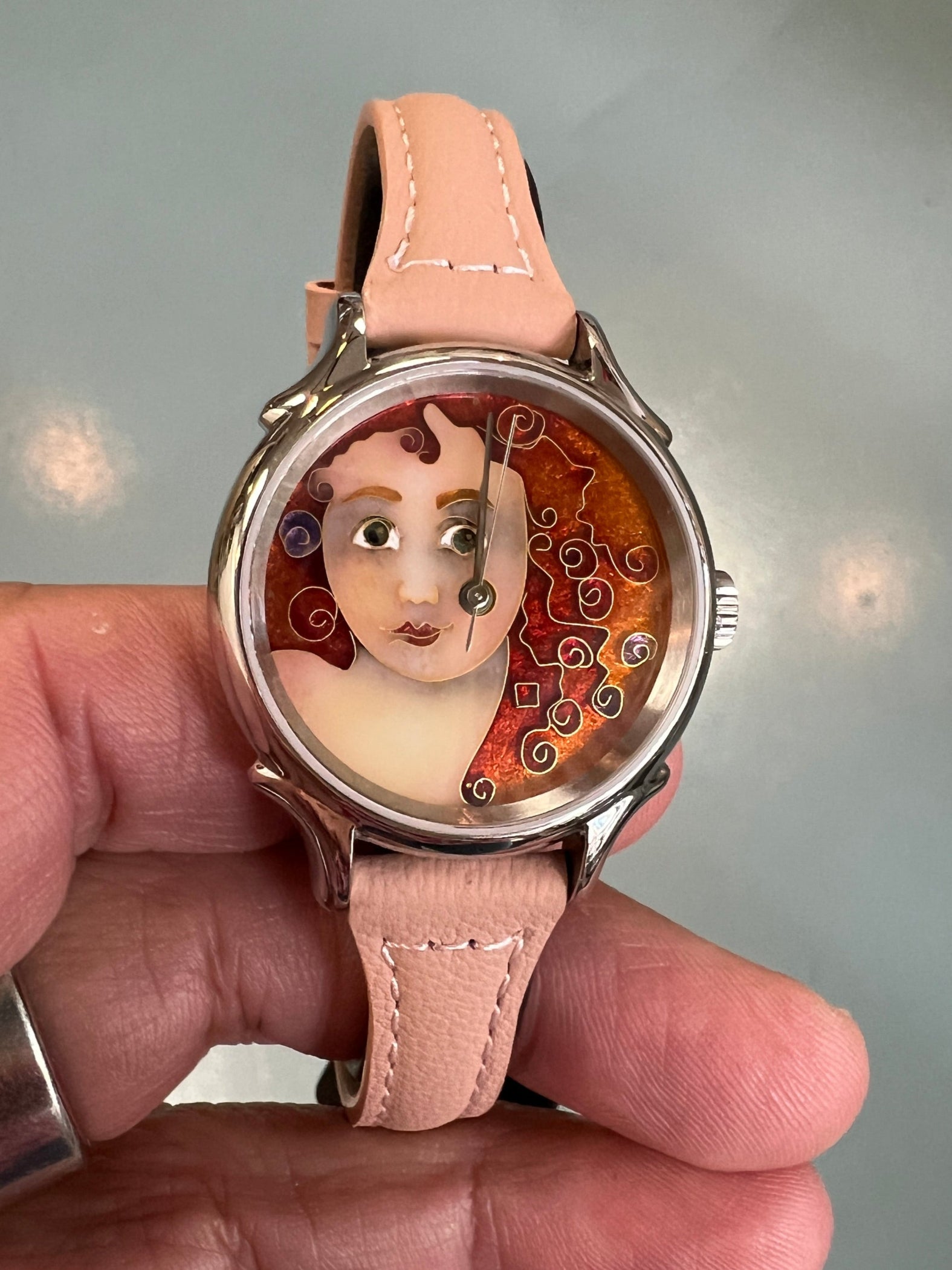 32mm Seema Lilias Face Cloisonné watch face, completely hand done by Merry-Lee Rae with 24K gold wirework.