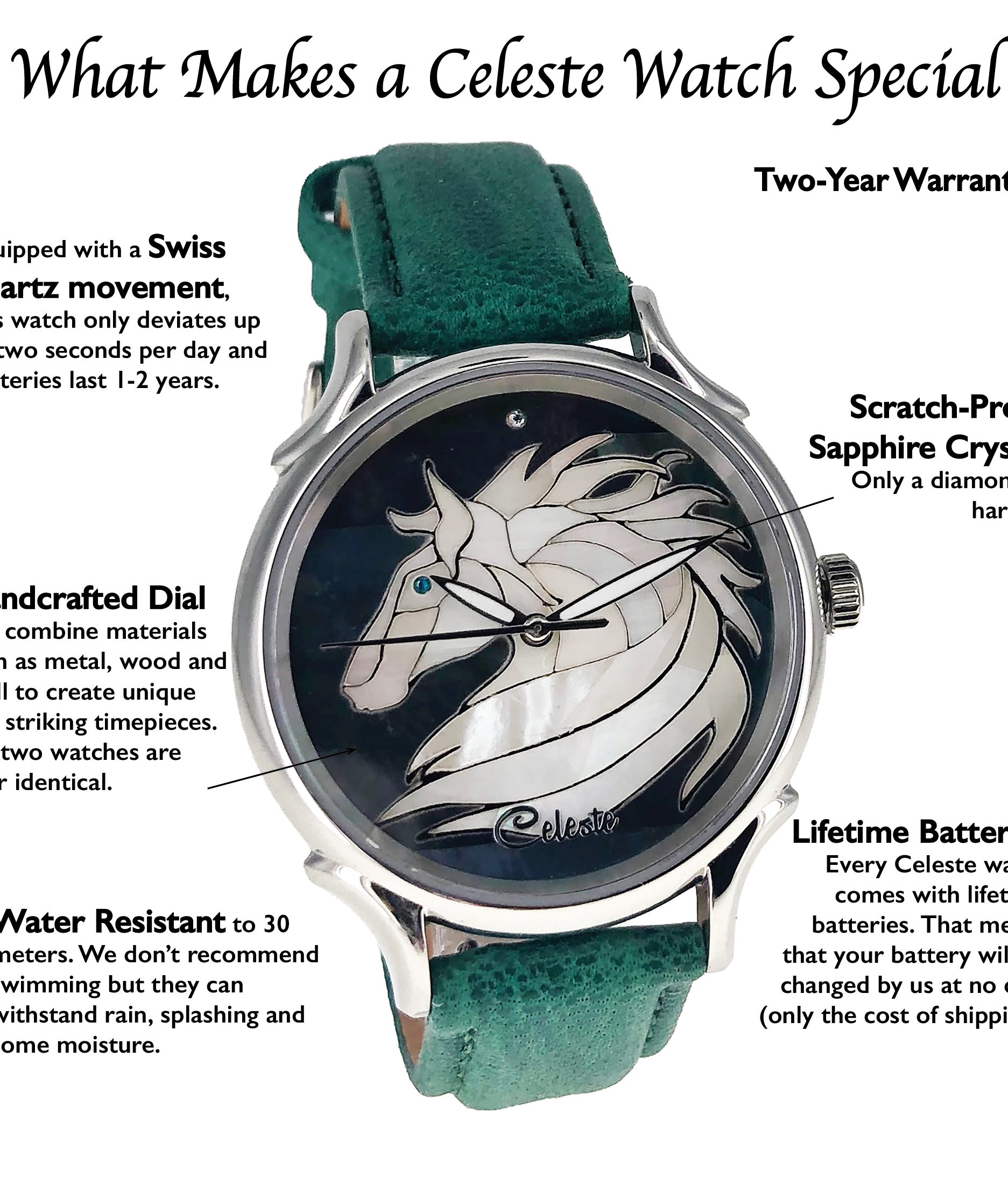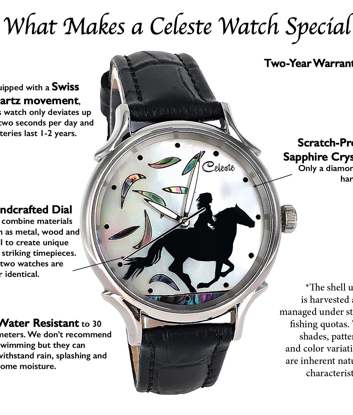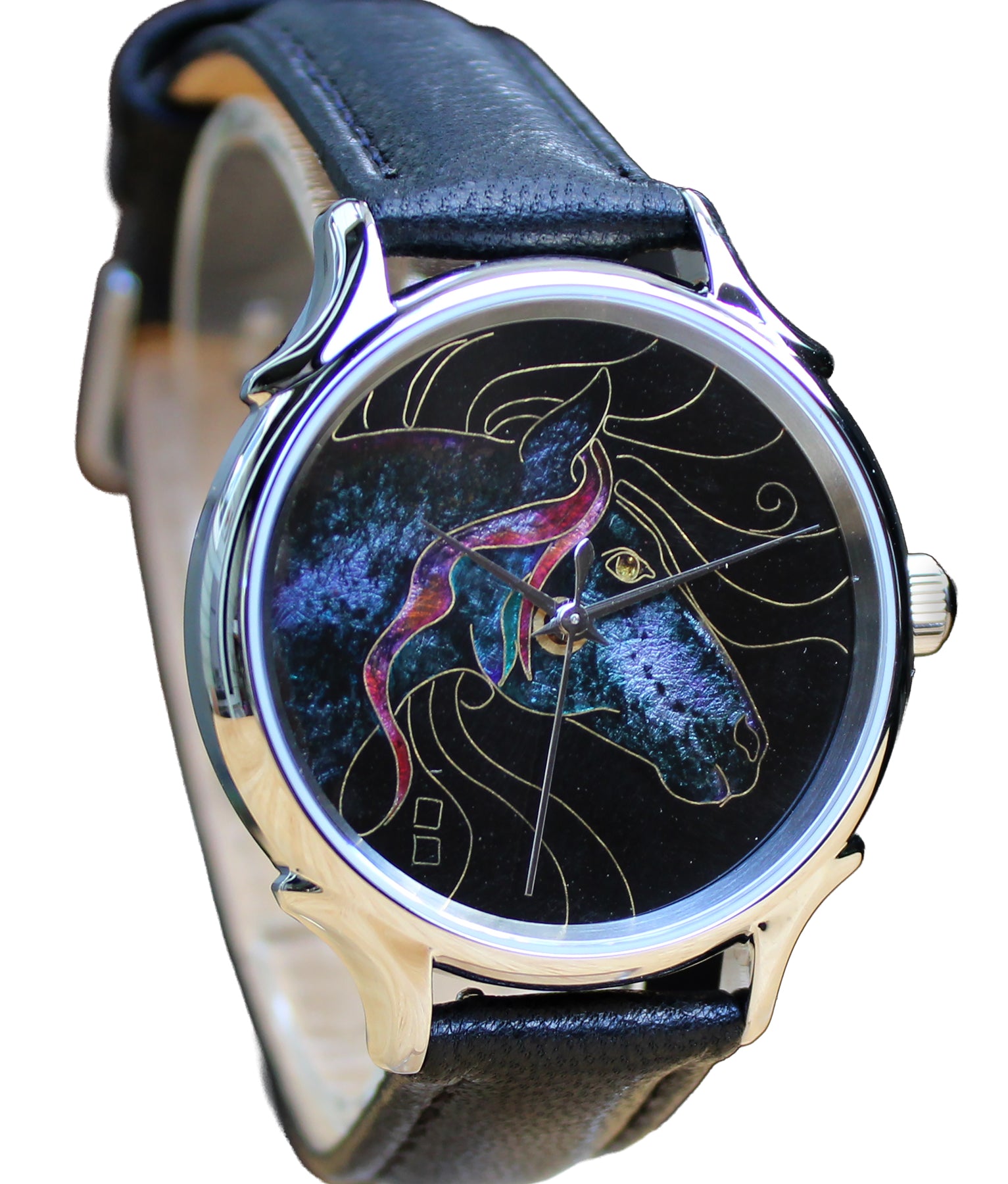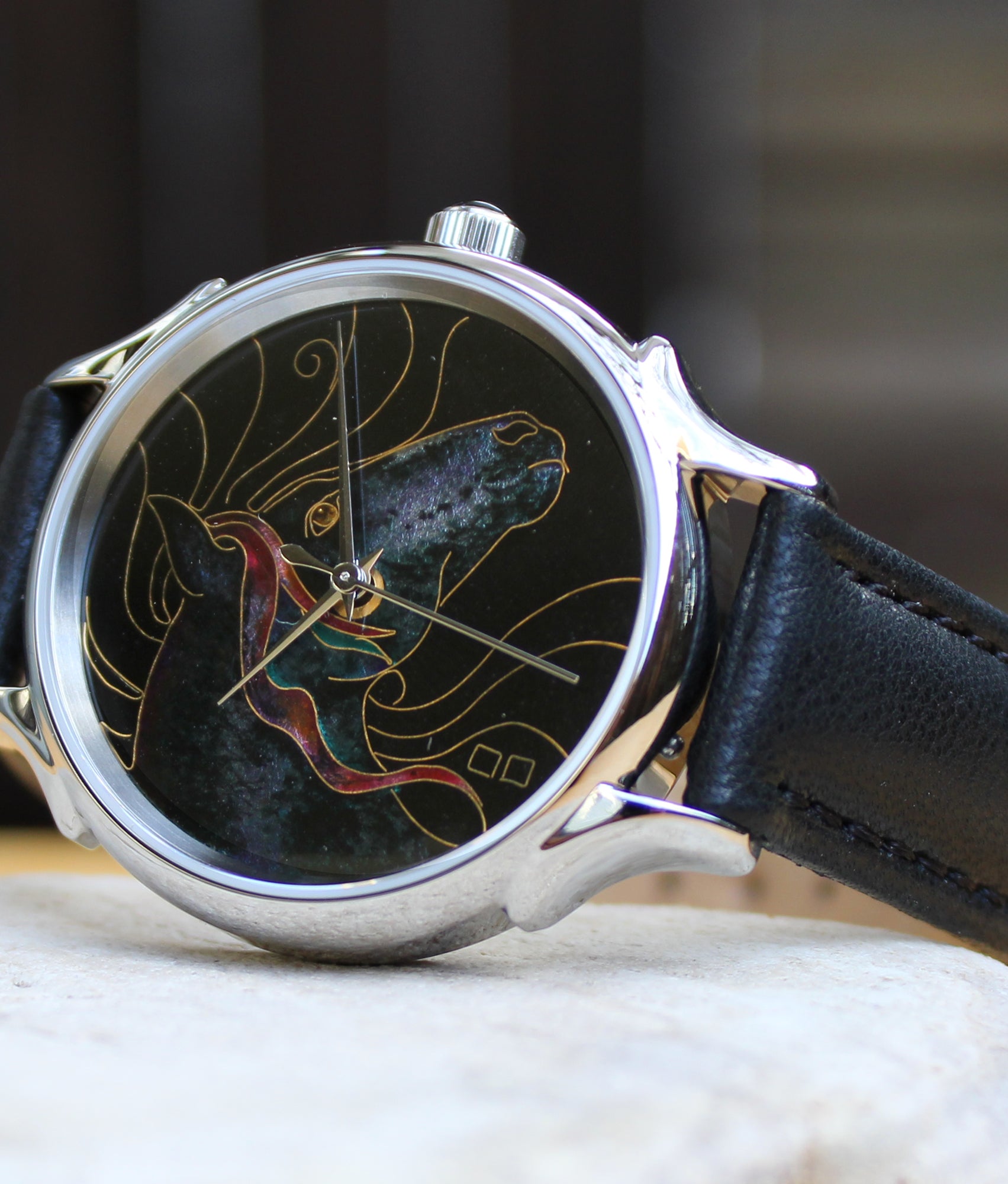 This collection brings together five designs featuring horse dials created with hand-inlaid shell and cloisonné enamel. Created by Celeste Watch Company and enamel artist Merry-Lee Rae, each dial captures movement, spirit, and dimensional detail.