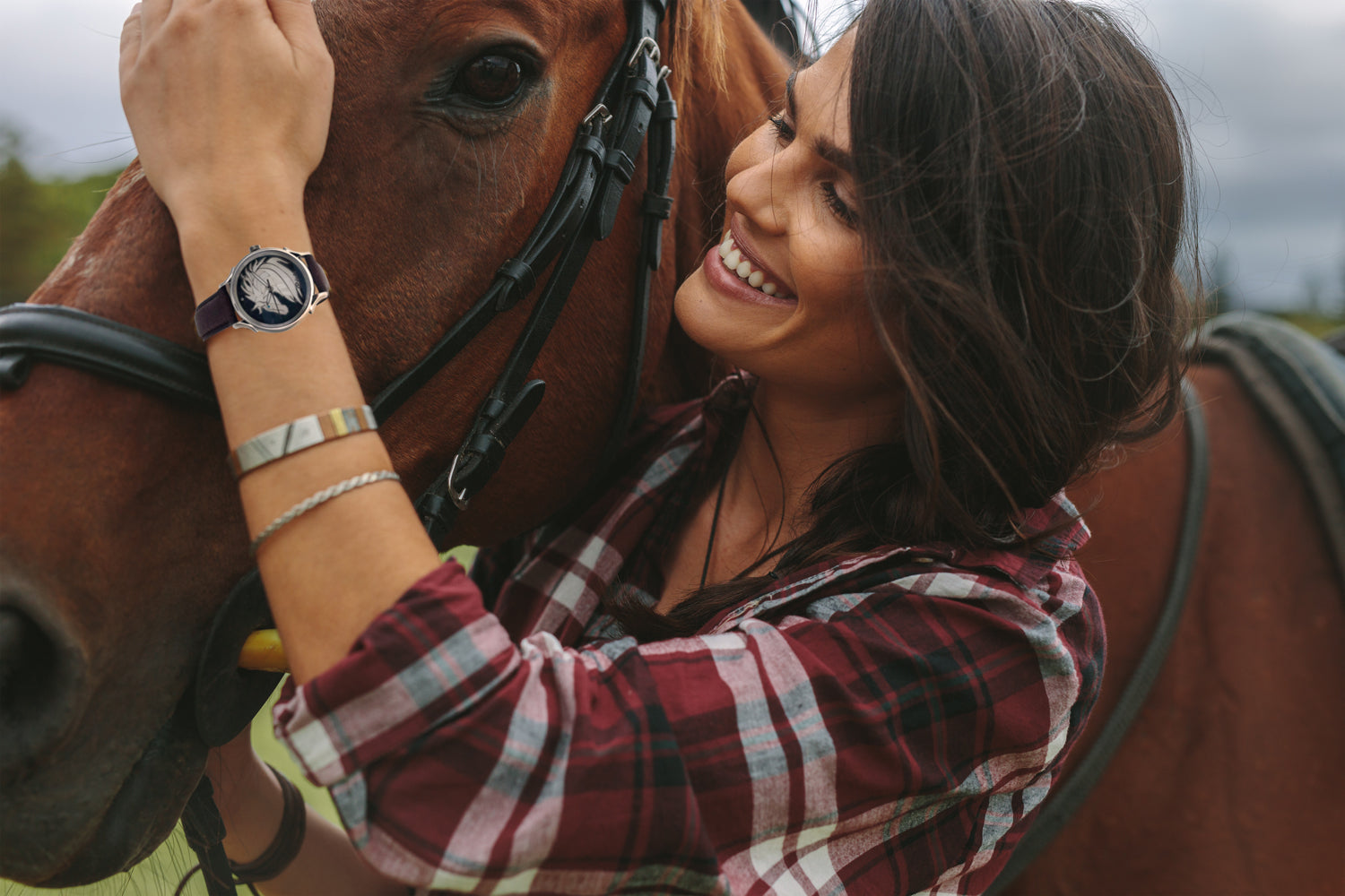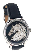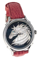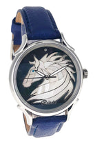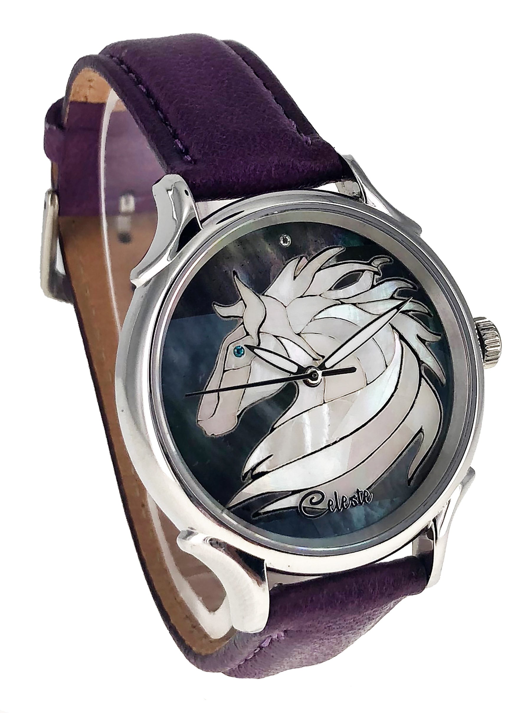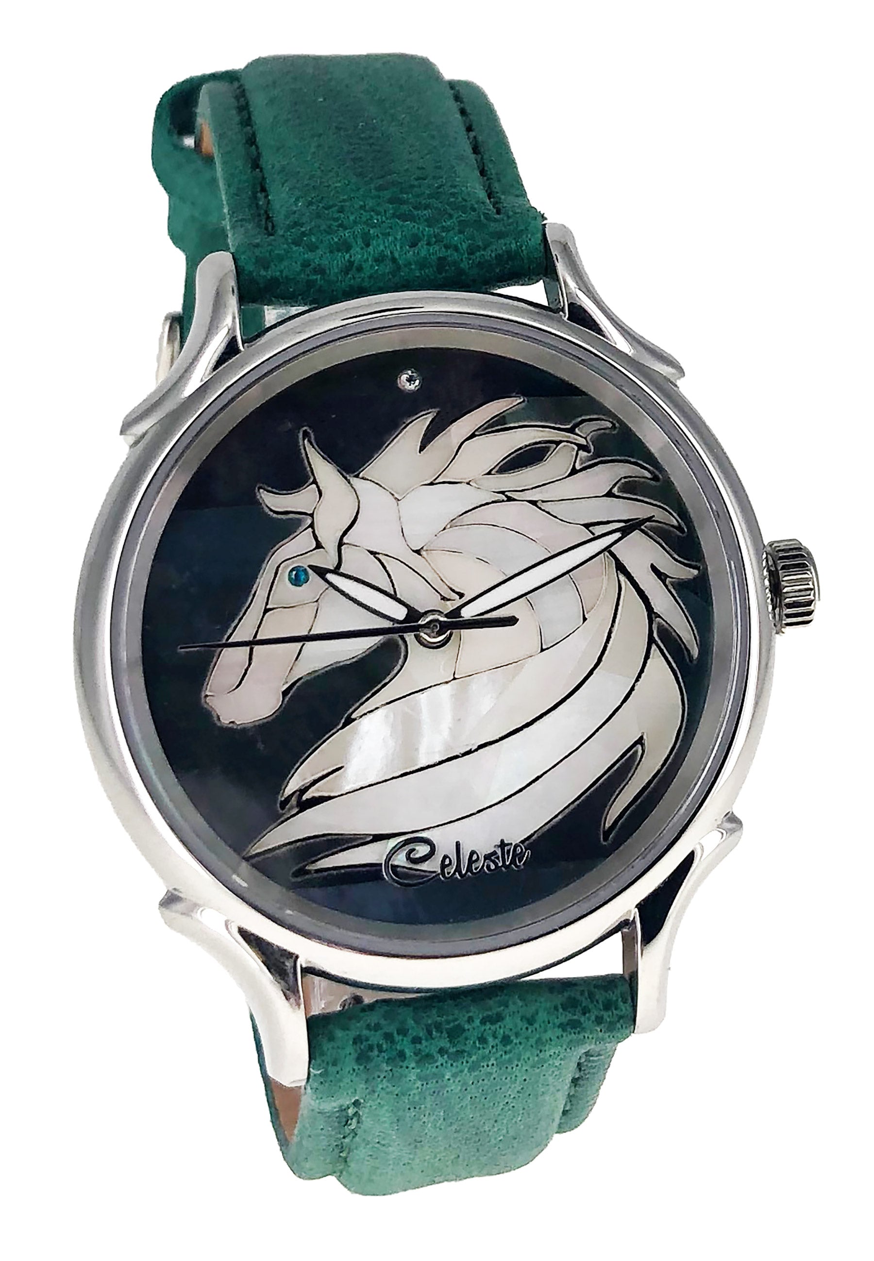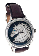 This stunning watch dial features an intricate mother of pearl inlay, expertly crafted to capture the fierce elegance of a stallion in motion. The radiant, iridescent sheen of the shell serves as the perfect canvas to showcase a meticulously detailed stallion, rendered in dynamic, lifelike strokes. As the light catches the surface, the dial seems to come to life, reflecting a spectrum of colors that enhance the beauty of the horse's graceful form. The craftsmanship of this dial makes it not just a timepiece, but a true work of art, ideal for those who appreciate fine, nature-inspired design with a bold, untamed spirit.