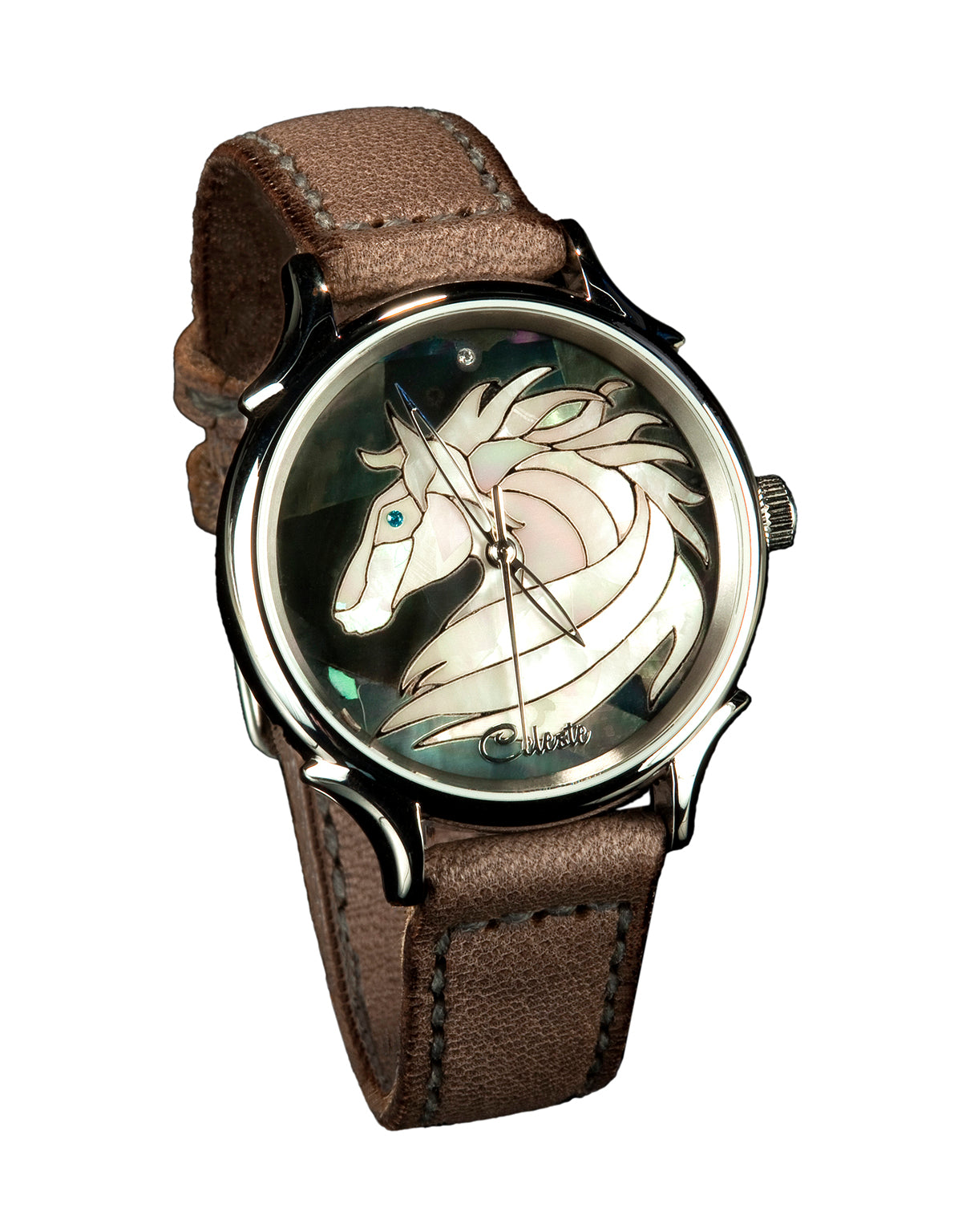 Pearl Horse with Dark Background: 22 pieces of mother of pearl make up the stallion head and are inlaid in a Tahitian Black-lip abalone background. A clear stone locates the 12 on the dial and a blue stone serves as the horse’s eye.