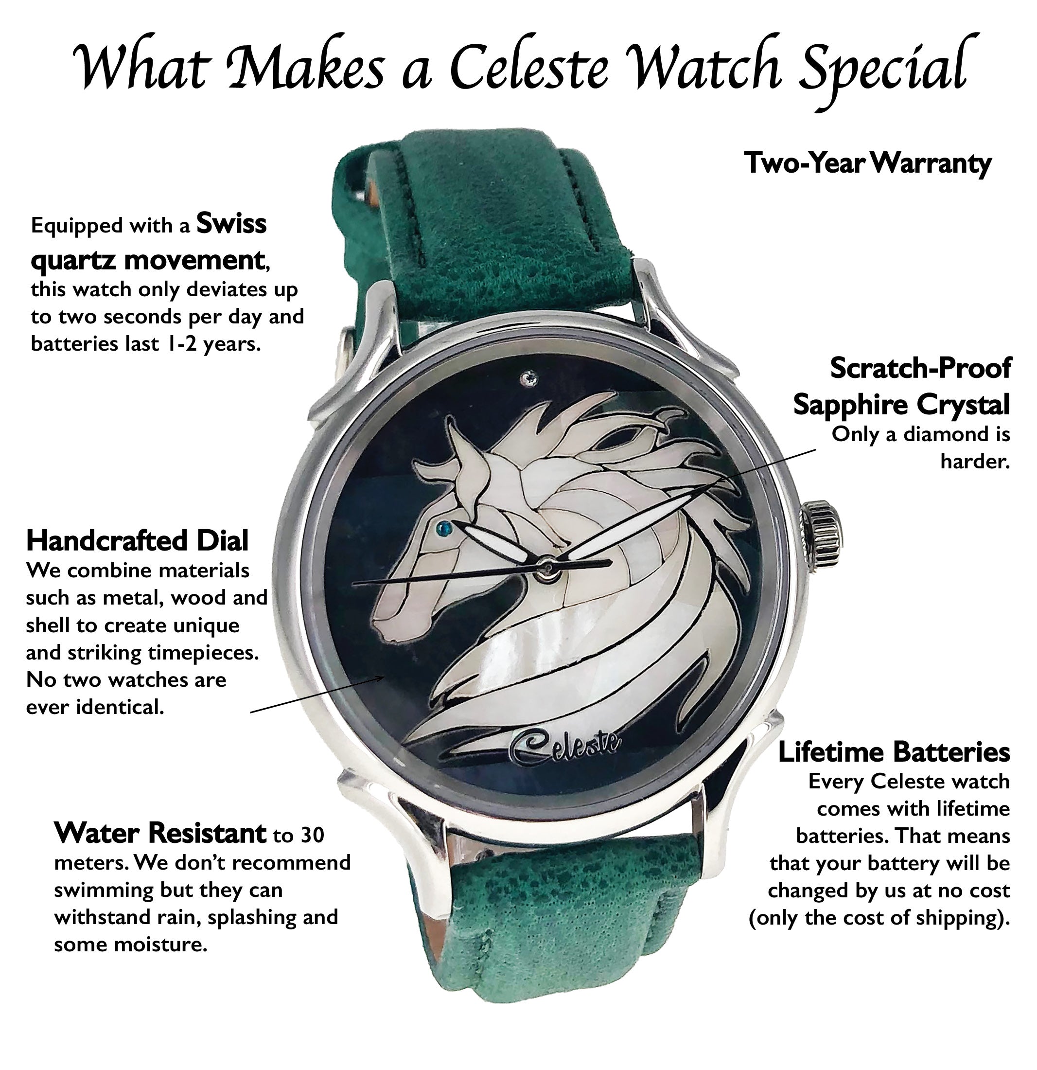 If you are unsatisfied with the performance of your watch, we'll make it right. Whether you made the purchase or received your watch as a gift, it's Celeste's guarantee that your watch will maintain its beauty and precision.