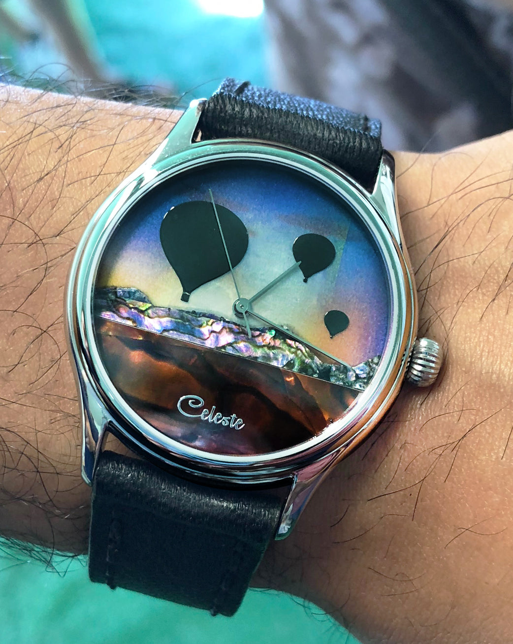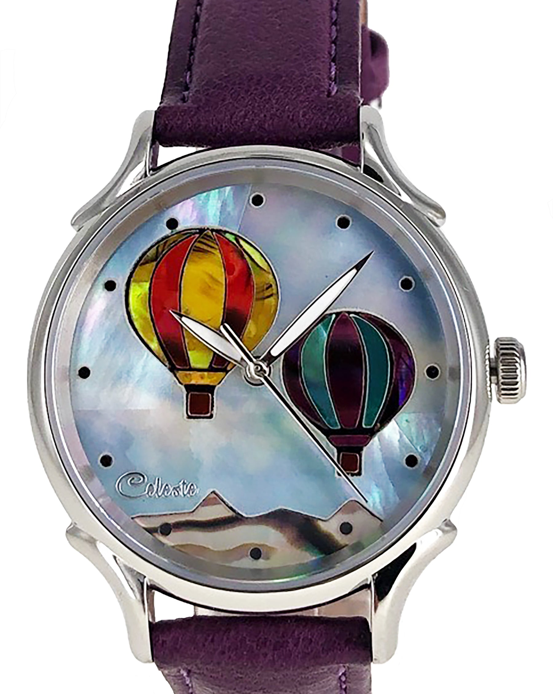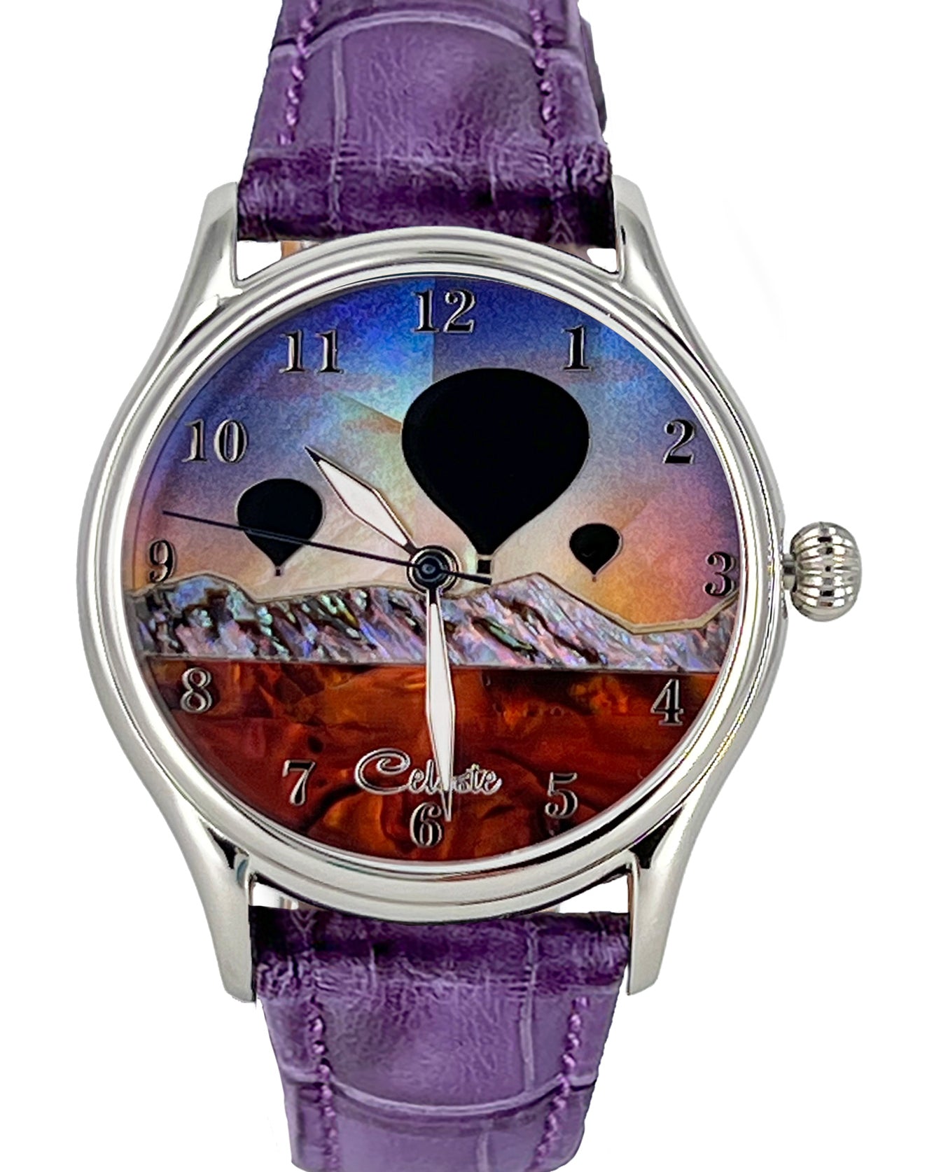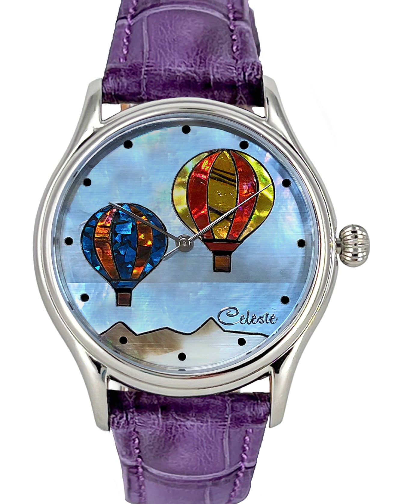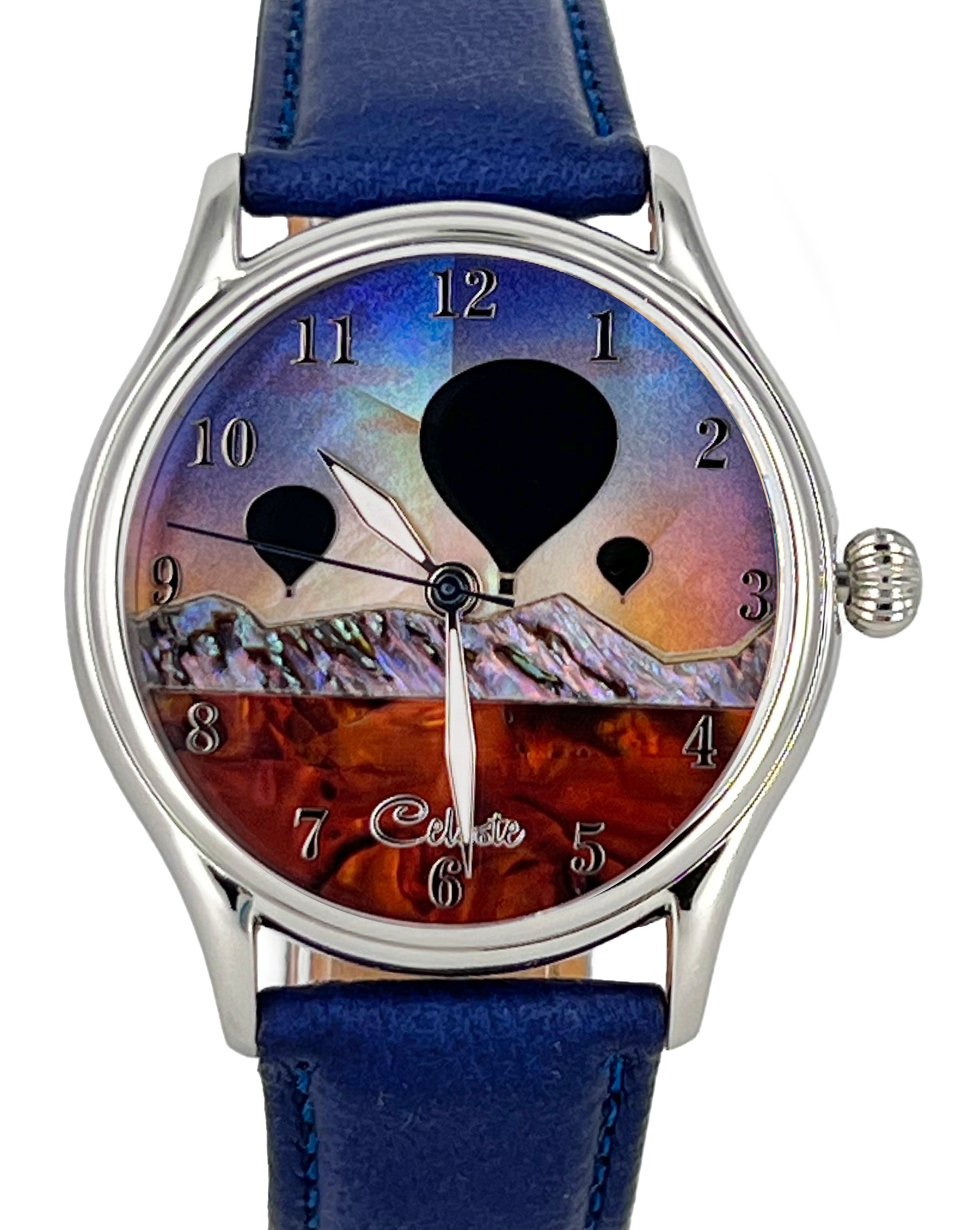 This collection explores color, height, and atmosphere through hand-inlaid shell and reflective depth. As light moves across the dial, the surface shifts like sky at different hours of the day.